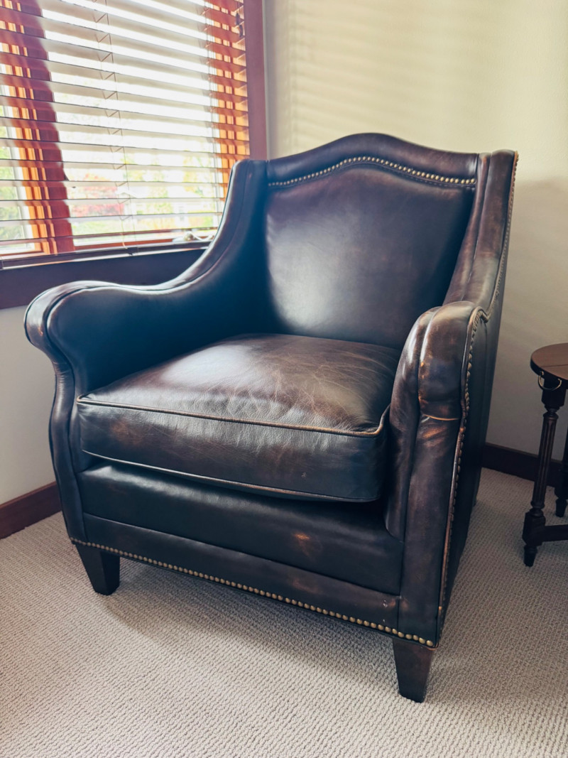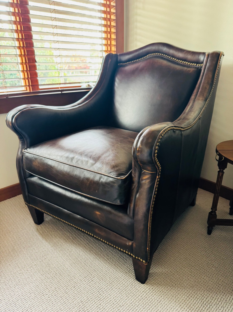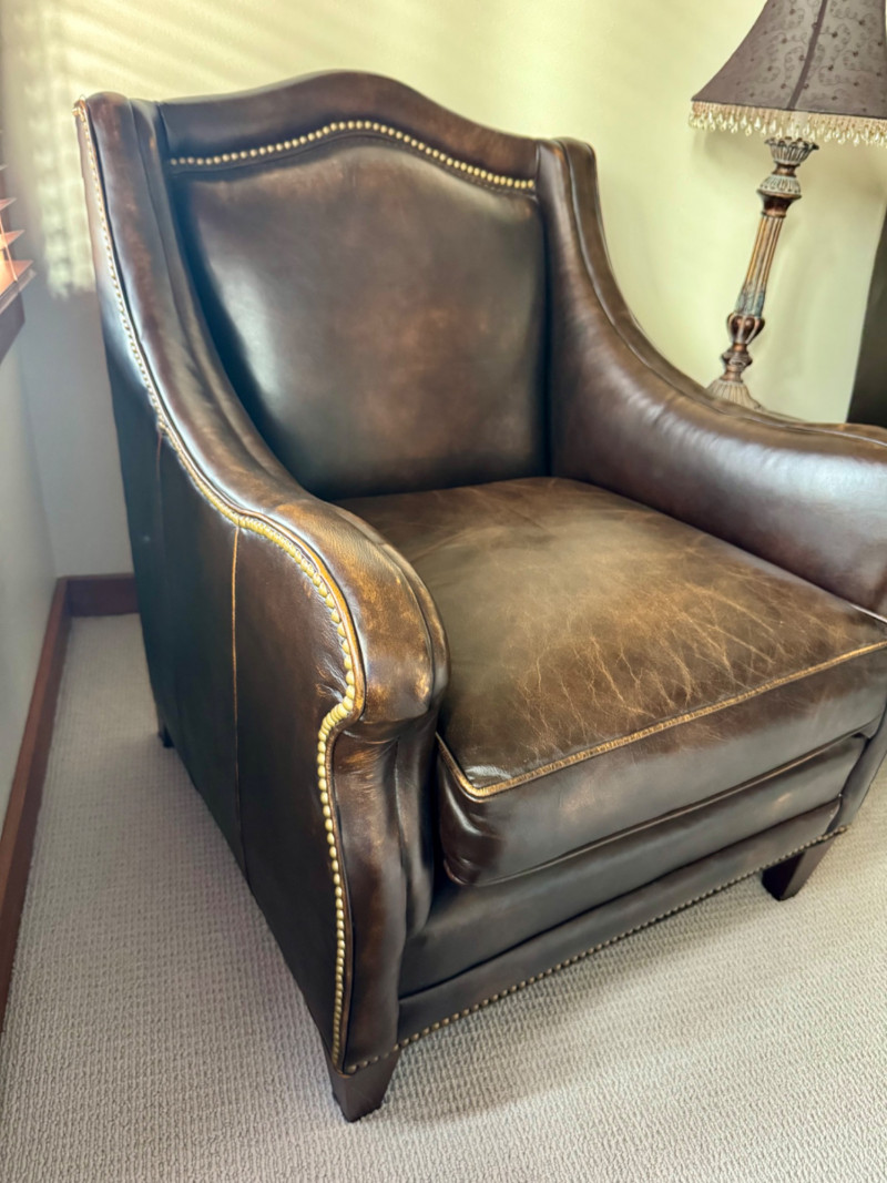 Like New! Brown Leather Club Chair – Rolled Arms, Nailhead Trim #1.