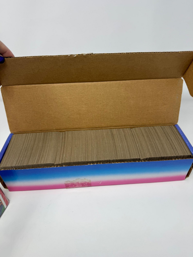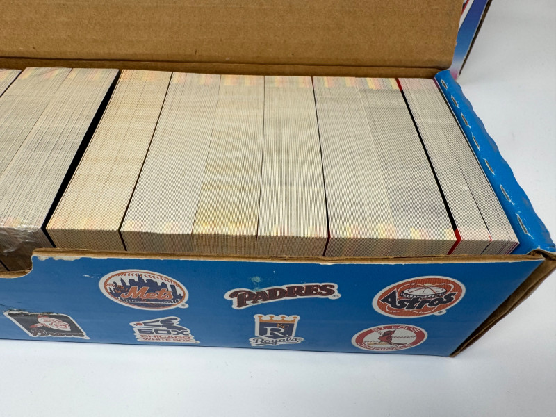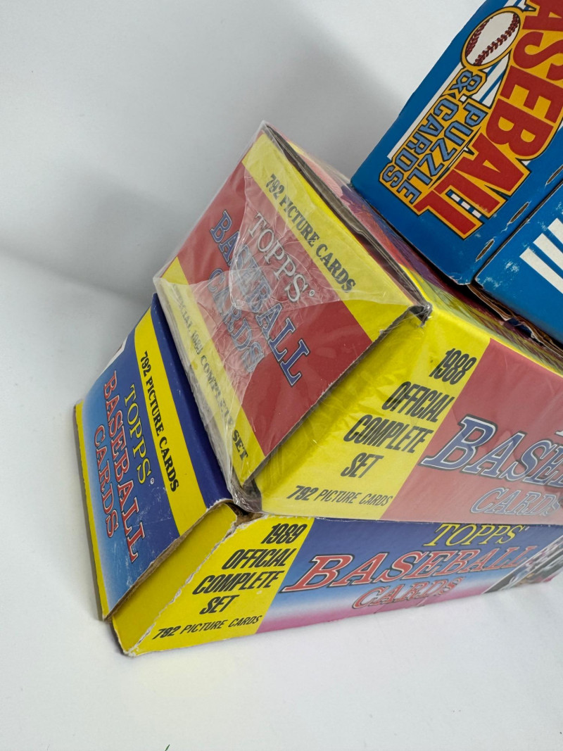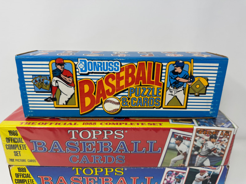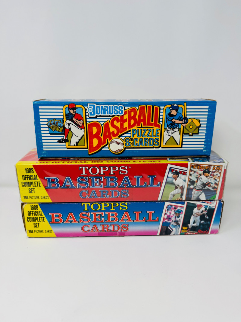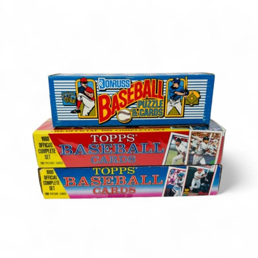 1988–1989 Topps & Donruss Baseball Cards – 3 Boxes Complete Set. Includes 3 complete factory sets of vintage baseball cards: 1988 Topps Baseball – Official Complete Set (792 cards) 1989 Topps Baseball – Official Complete Set (792 cards, factory sealed) Donruss Baseball Puzzle & Cards box (1980s issue) Disclaimer: The contents of each lot have not been fully inspected. We make no guarantee of set completeness. Please note that unsorted cards may include a mix of different years, series, or sports.