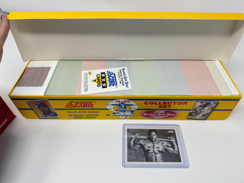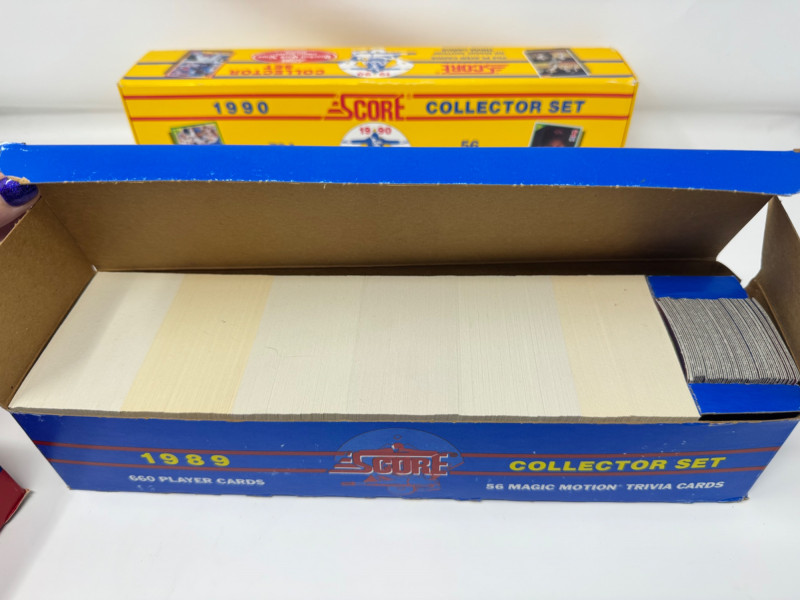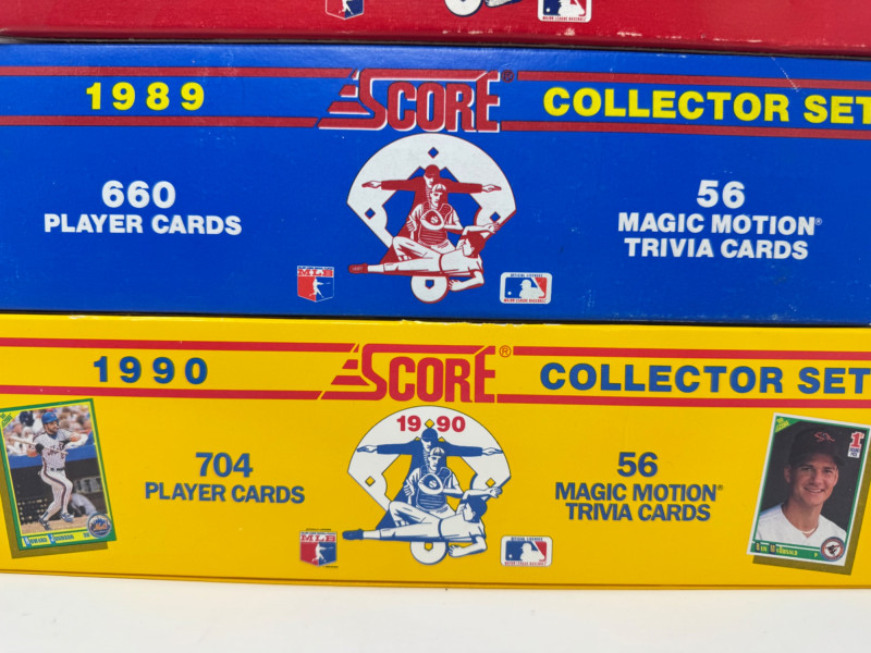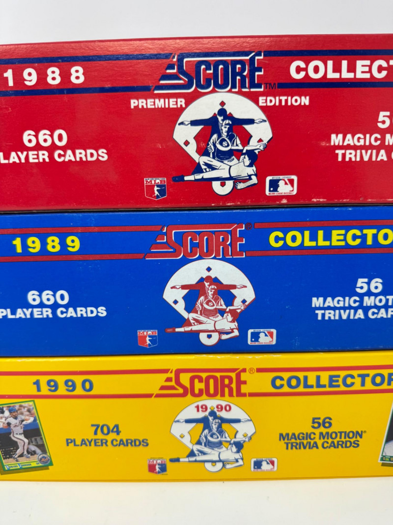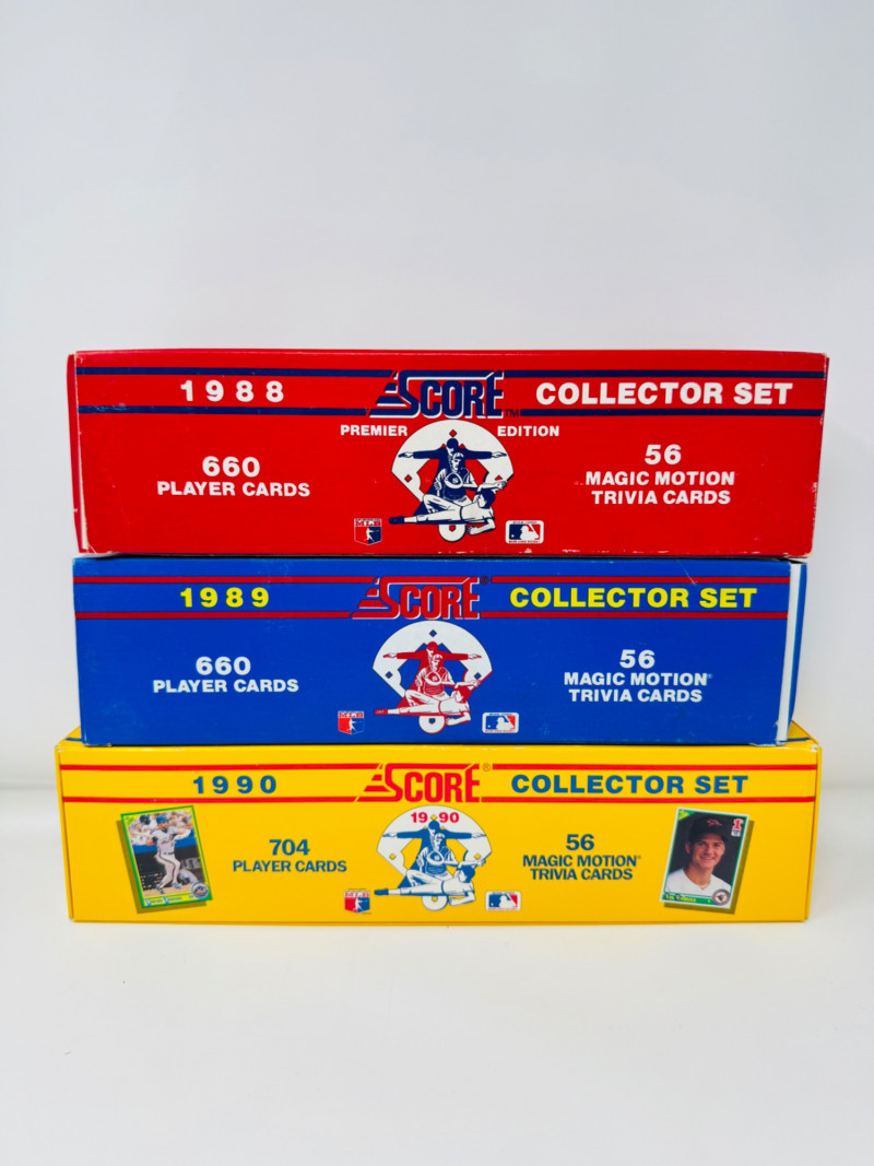 1988–1990 Score Baseball Complete Sets – Includes Bo Knows Card. Lot of 3 complete Score Baseball Collector Sets: 1988 Premier Edition – 660 player cards + 56 Magic Motion trivia cards 1989 Score Collector Set – 660 player cards + trivia cards 1990 Score Collector Set – 704 player cards + trivia cards, includes the iconic Bo Knows card Disclaimer: The contents of each lot have not been fully inspected. We make no guarantee of set completeness. Please note that unsorted cards may include a mix of different years, series, or sports.