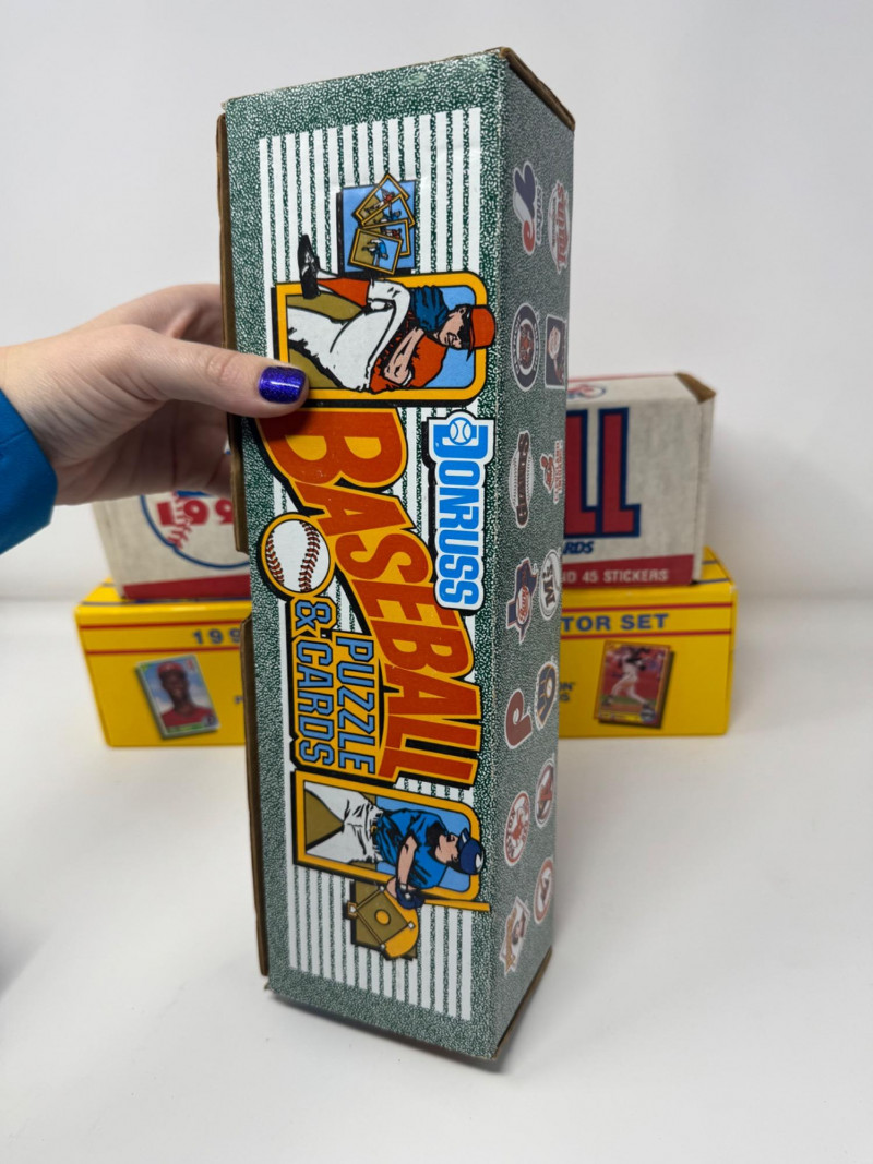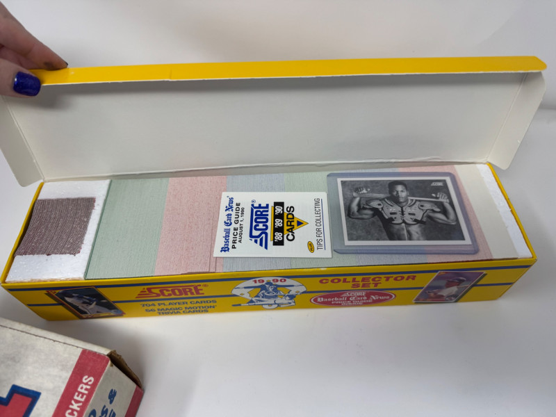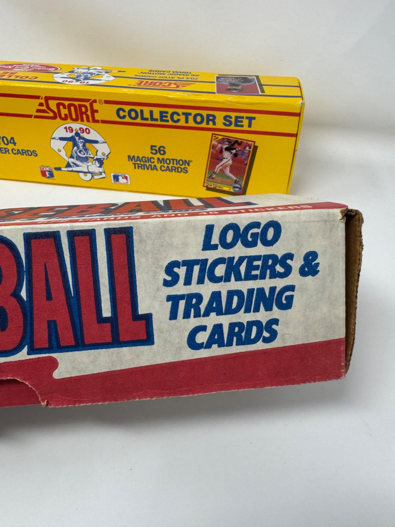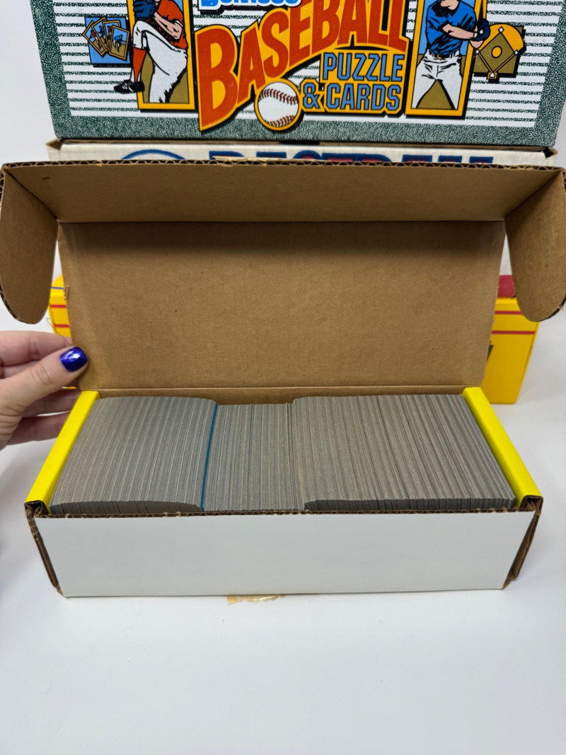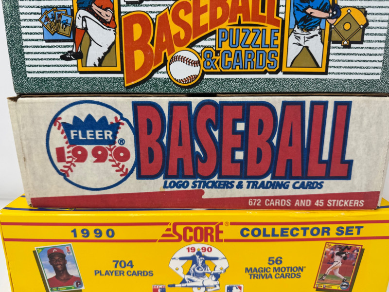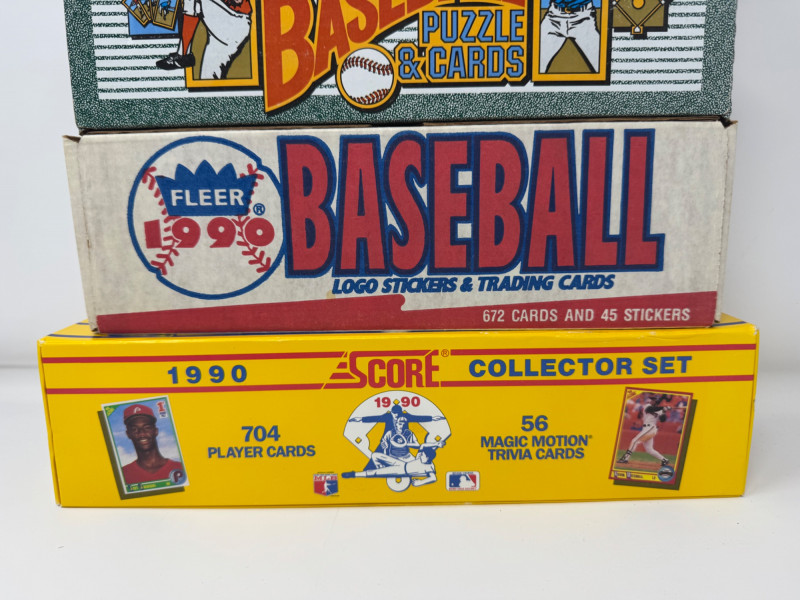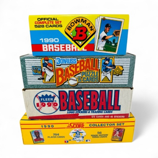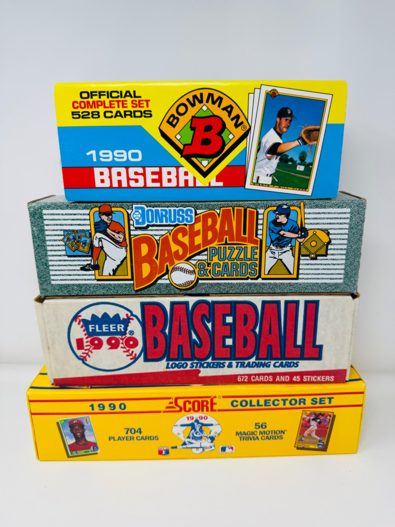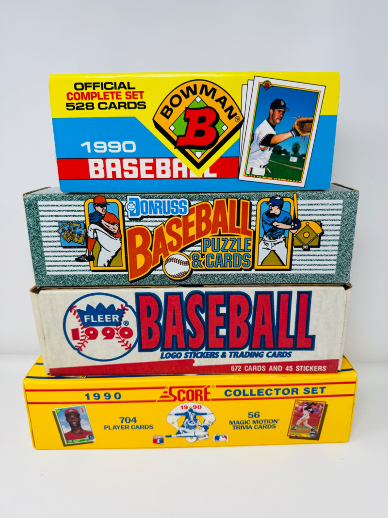 1990 Baseball Cards Set – Bowman, Donruss, Fleer & Score + Bo Knows. Includes 4 complete 1990 baseball card sets Bowman Baseball – 528 cards, official complete set Donruss Baseball Puzzle & Cards – full boxed set Fleer Baseball – 672 cards + 45 team logo stickers Score Collector Set – 704 cards + 56 Magic Motion trivia cards Disclaimer: The contents of each lot have not been fully inspected. We make no guarantee of set completeness. Please note that unsorted cards may include a mix of different years, series, or sports.
