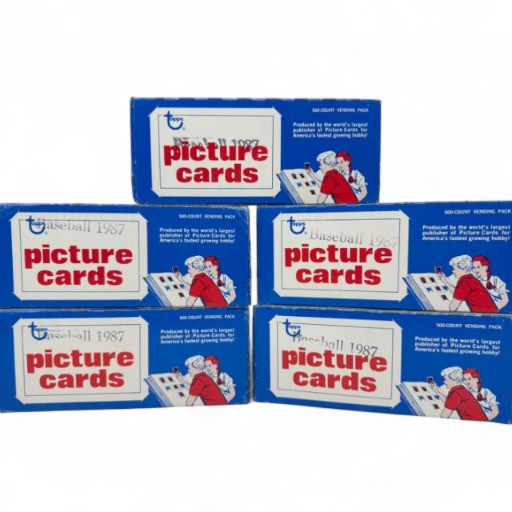 Lot of 5 – 1987 Topps Baseball Vending Boxes (Approx. 95% Full).