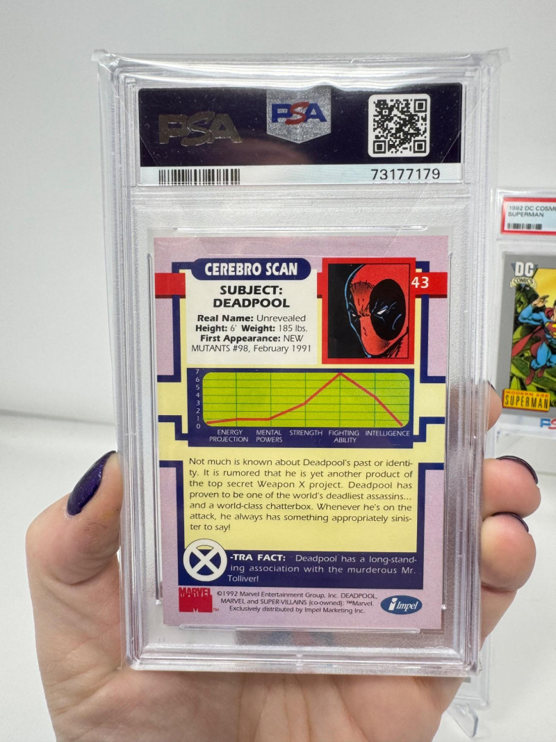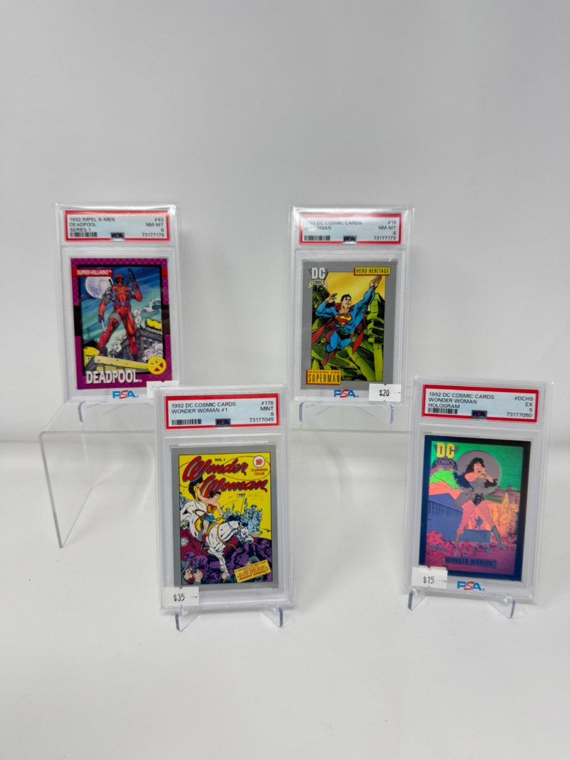 1992 PSA Graded Cards – Deadpool, Superman, Wonder Woman Hologram. Set of 4 PSA-graded cards featuring DC and Marvel heroes Includes: 1992 Impel X-Men #43 Deadpool Series 1 – PSA 8 1992 DC Cosmic Cards #18 Superman – PSA 8 1992 DC Cosmic Cards #178 Wonder Woman #1 – PSA 9 1992 DC Cosmic Cards #DCH9 Wonder Woman Hologram – PSA 5