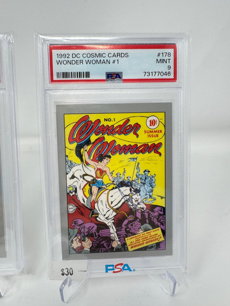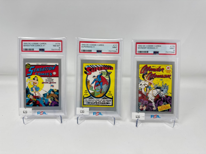 1992 PSA Graded Cards – Superman, Wonder Woman, Sensation Comics. Set of 3 PSA-graded 1992 DC Cosmic Cards featuring iconic first issues Includes: #174 Sensation Comics #1 (Wonder Woman) – PSA 8 NM-MT #177 Superman #1 – PSA 9 Mint #178 Wonder Woman #1 – PSA 9 Mint