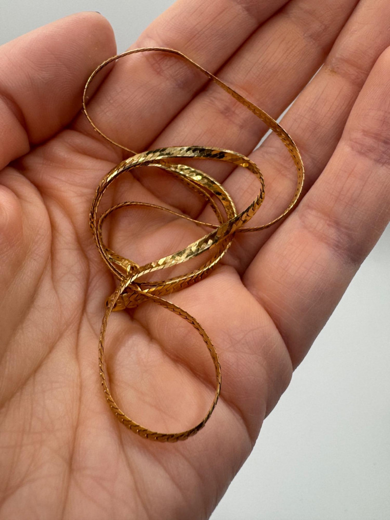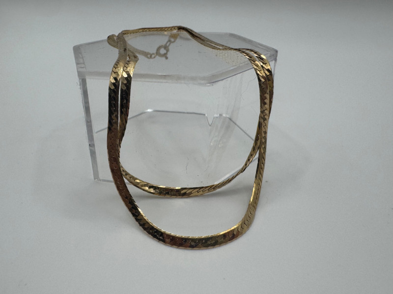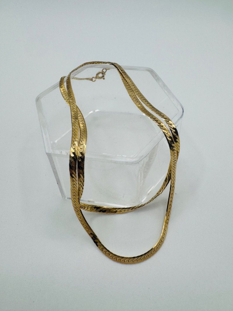 14K Italy Flat Herringbone Gold Chain Necklace – 4.93g. Important Disclaimer: Jewelry in this lot has not been tested. By bidding, you agree to purchase as is, with no guarantees on metal purity, gemstone authenticity, or content. No refunds issued on these factors.