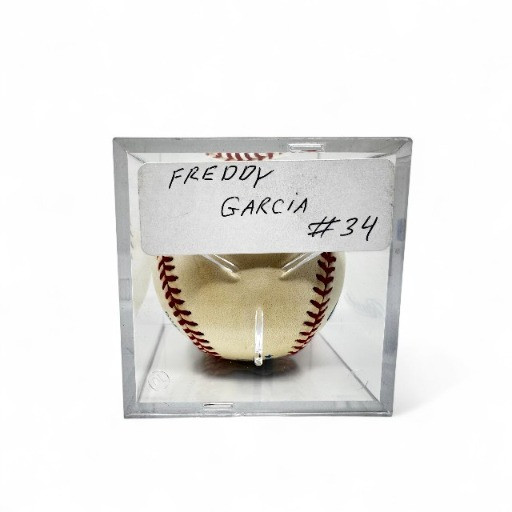 Freddy García #34 Signed Baseball in Display Case. Disclaimer: The signature on this item has not undergone professional or third-party authentication. While it appears to be hand-signed and was represented as genuine by the original owner, no independent verification has been performed.