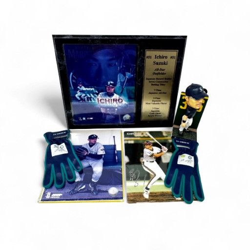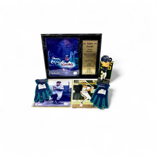 Ichiro Suzuki Collectible Lot – Plaque, Gloves, Bobblehead & Photos.
