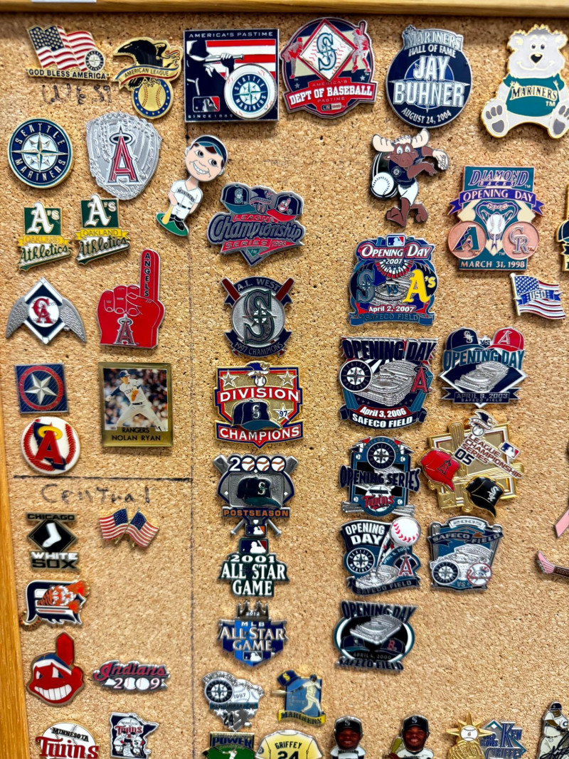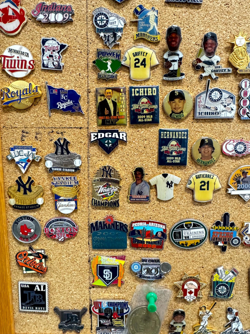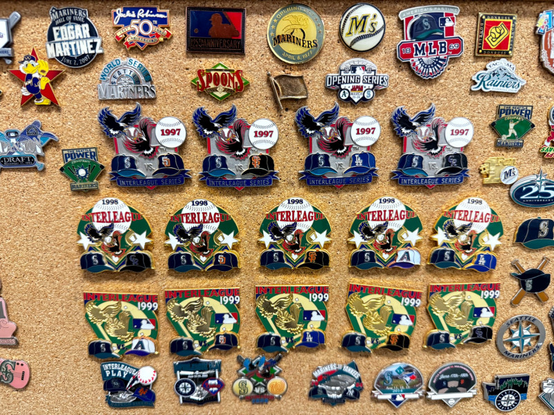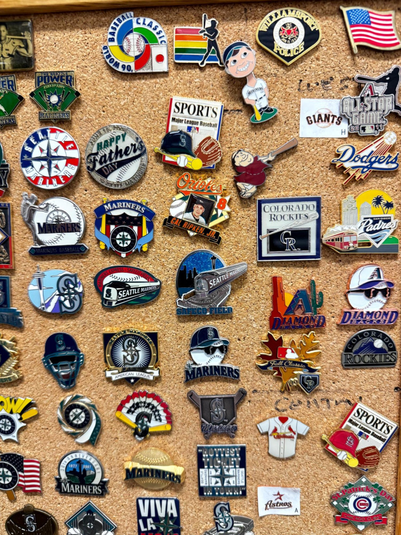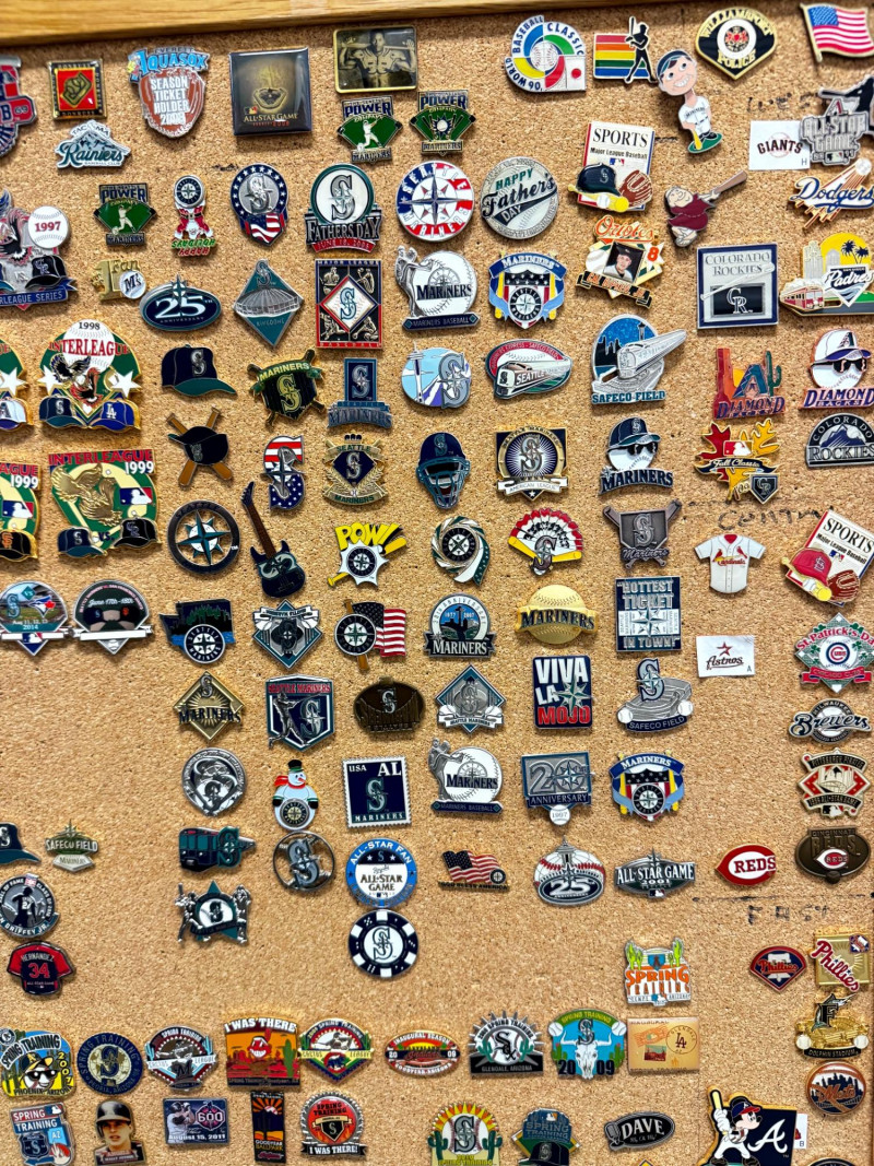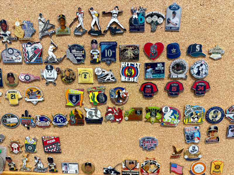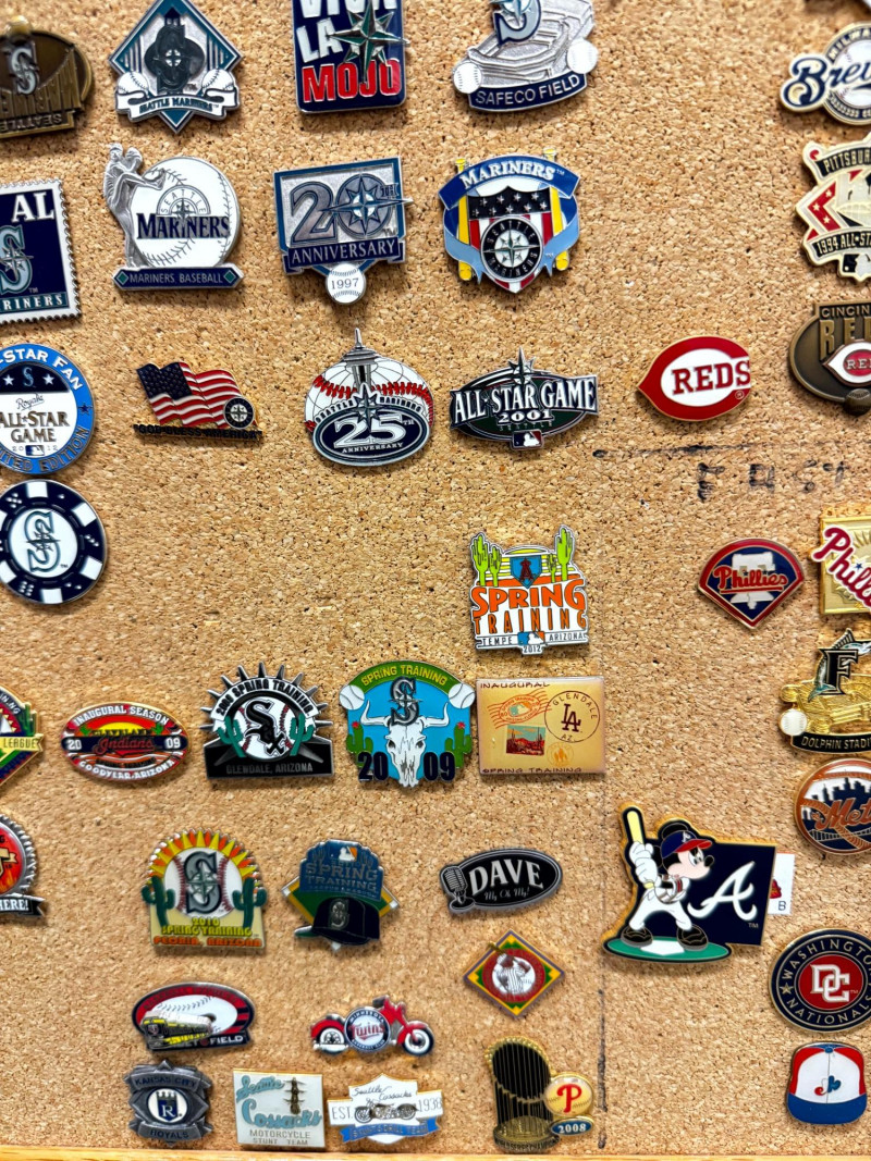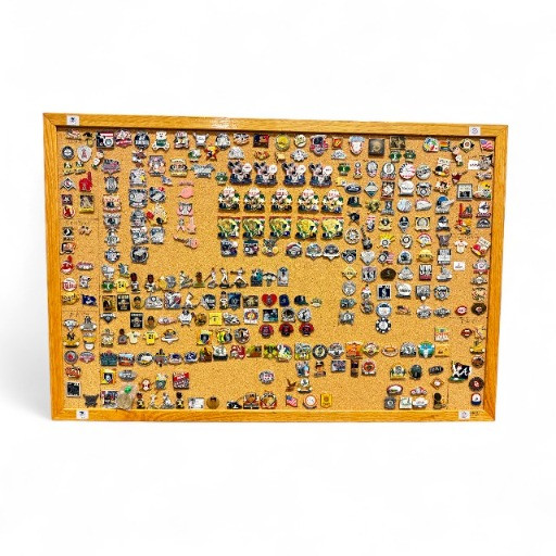 Large MLB Baseball Pin Collection on Cork Display Board.
