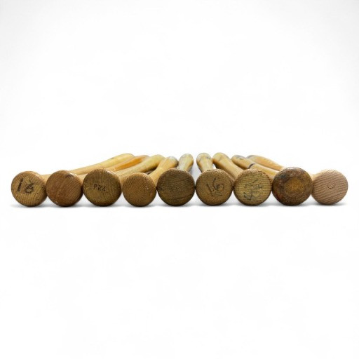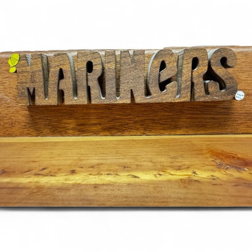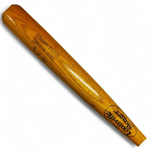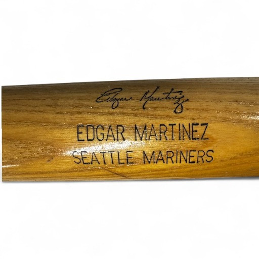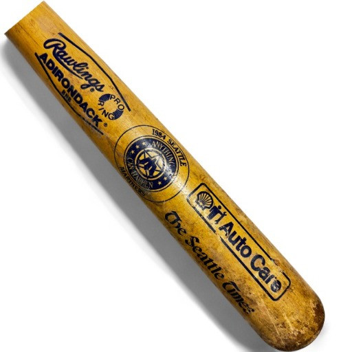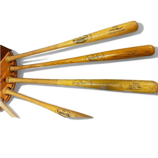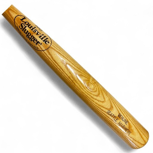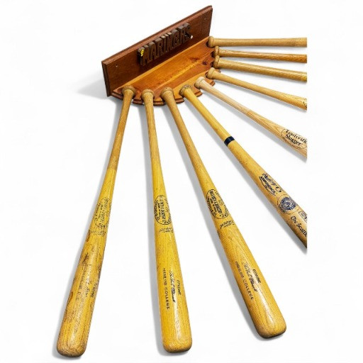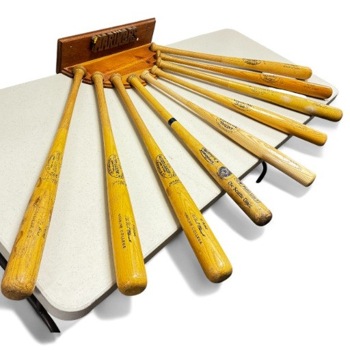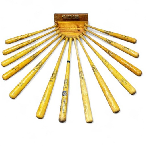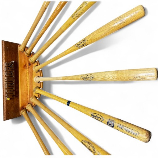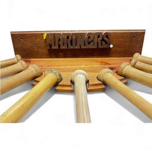 Set of 9 Wooden Baseball Bats w/ Mariners Wall Display Rack.