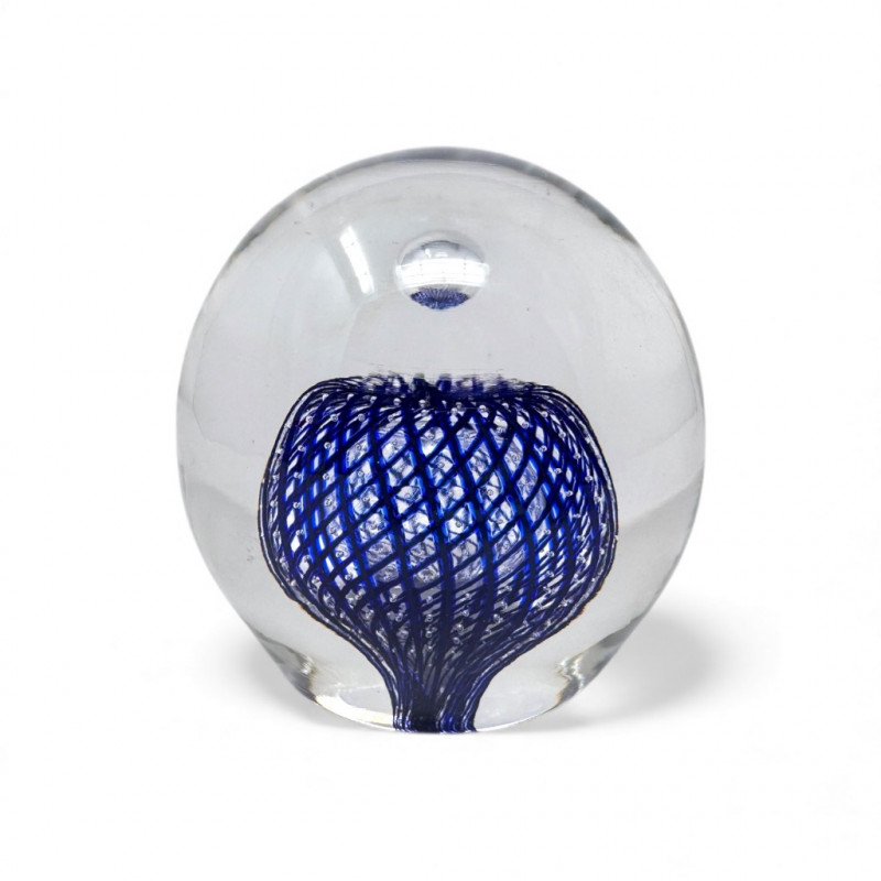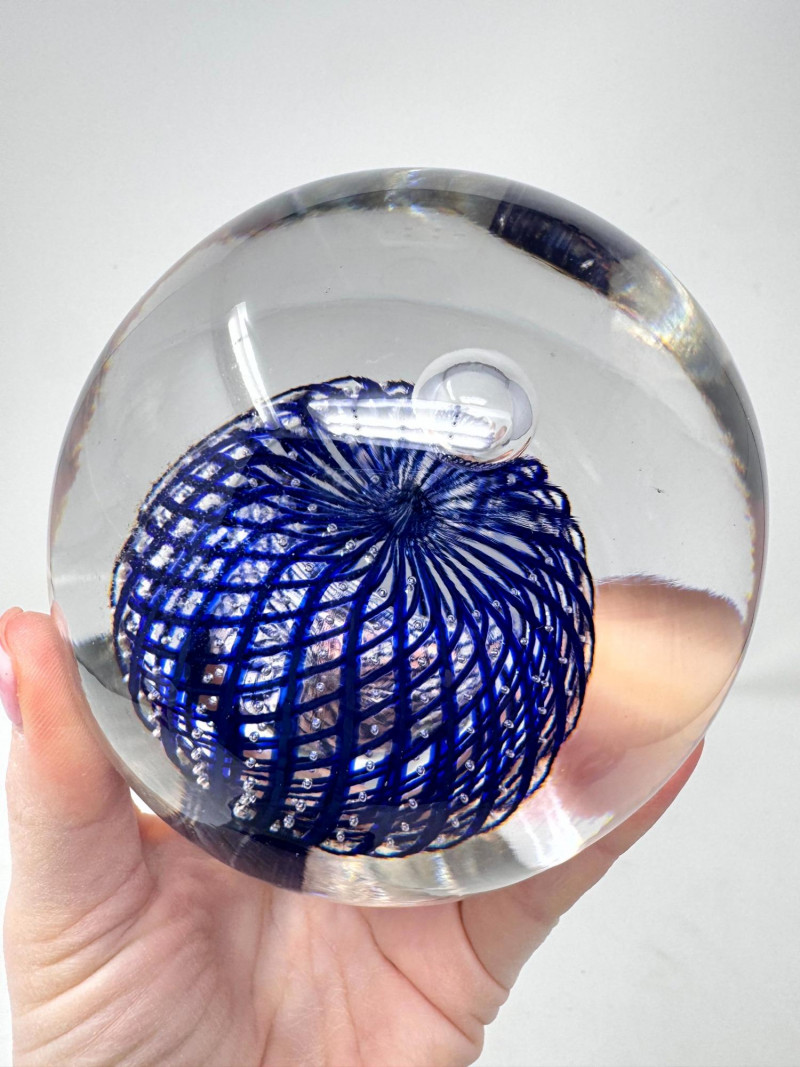 Large Blown Glass Art Paperweight – Blue Lattice Encased Design.