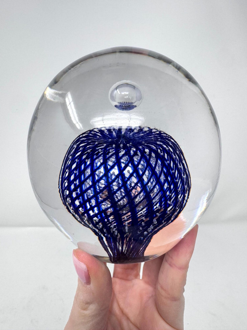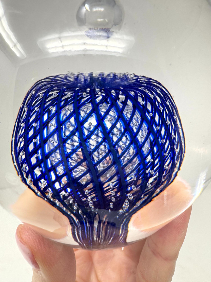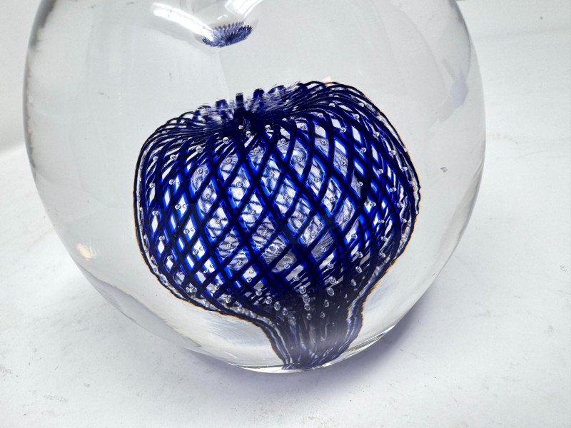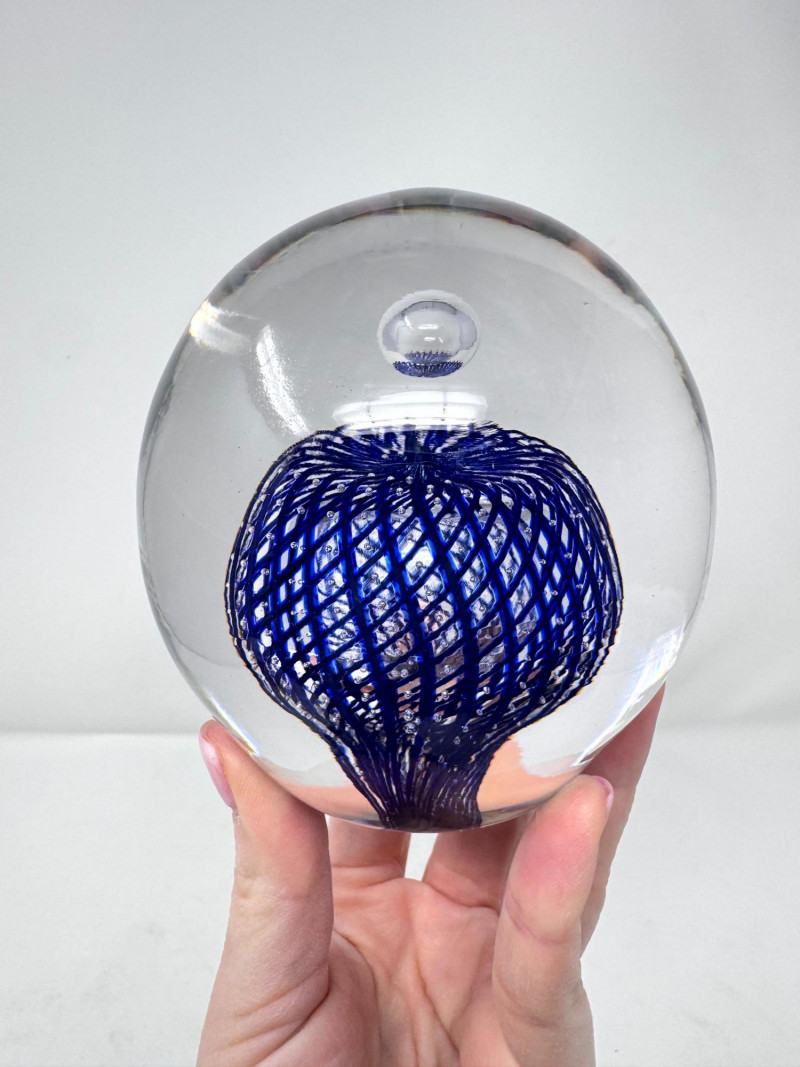 Lot # 12 - Large Blown Glass Art Paperweight – Blue Lattice Encased Design