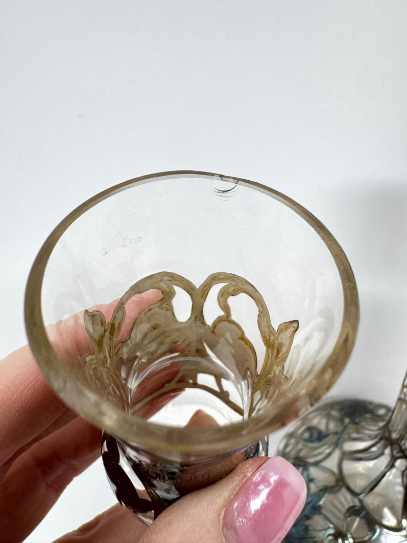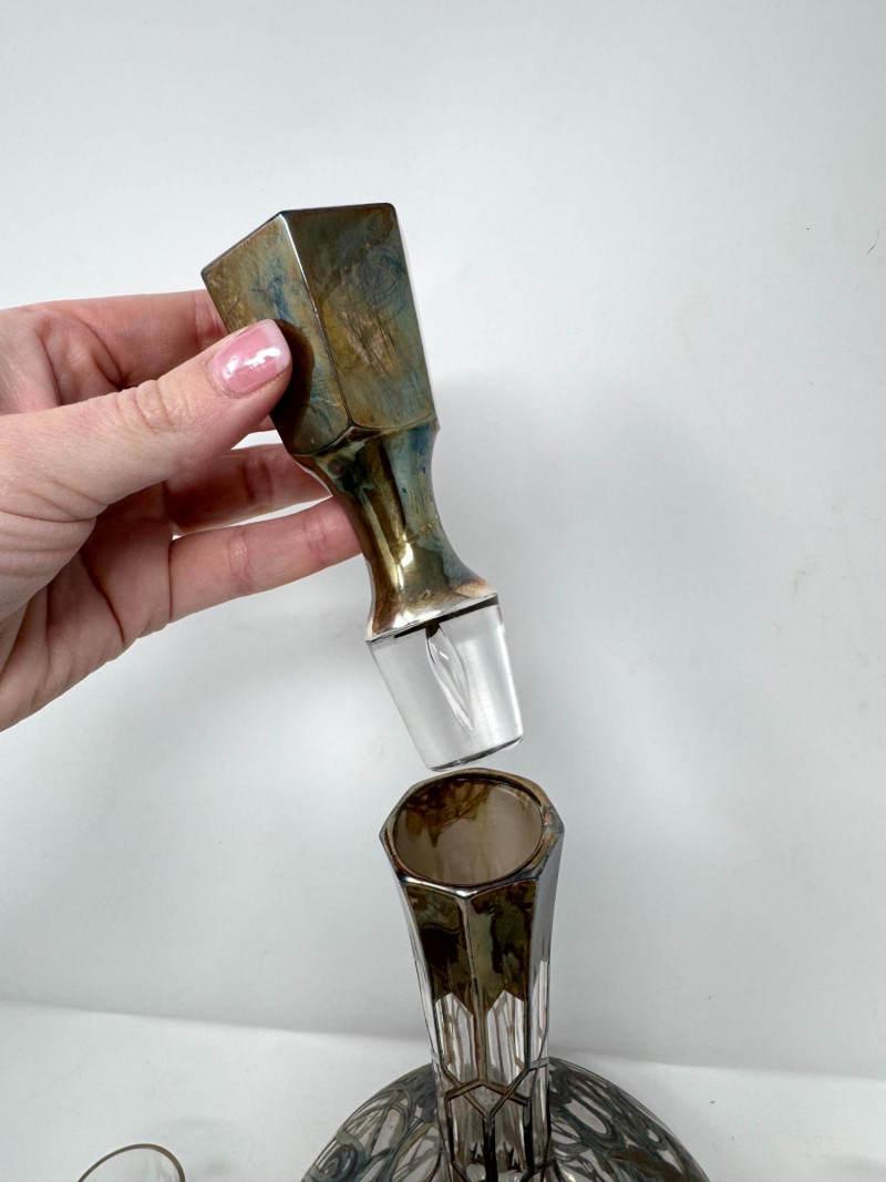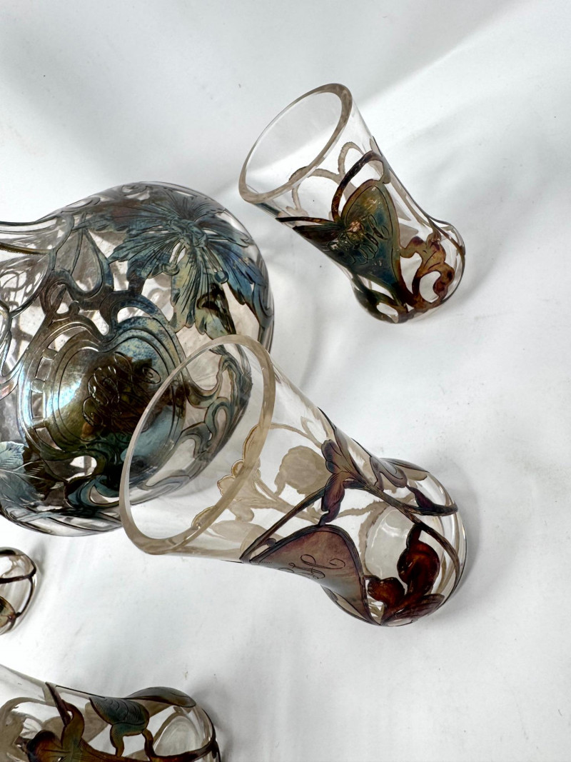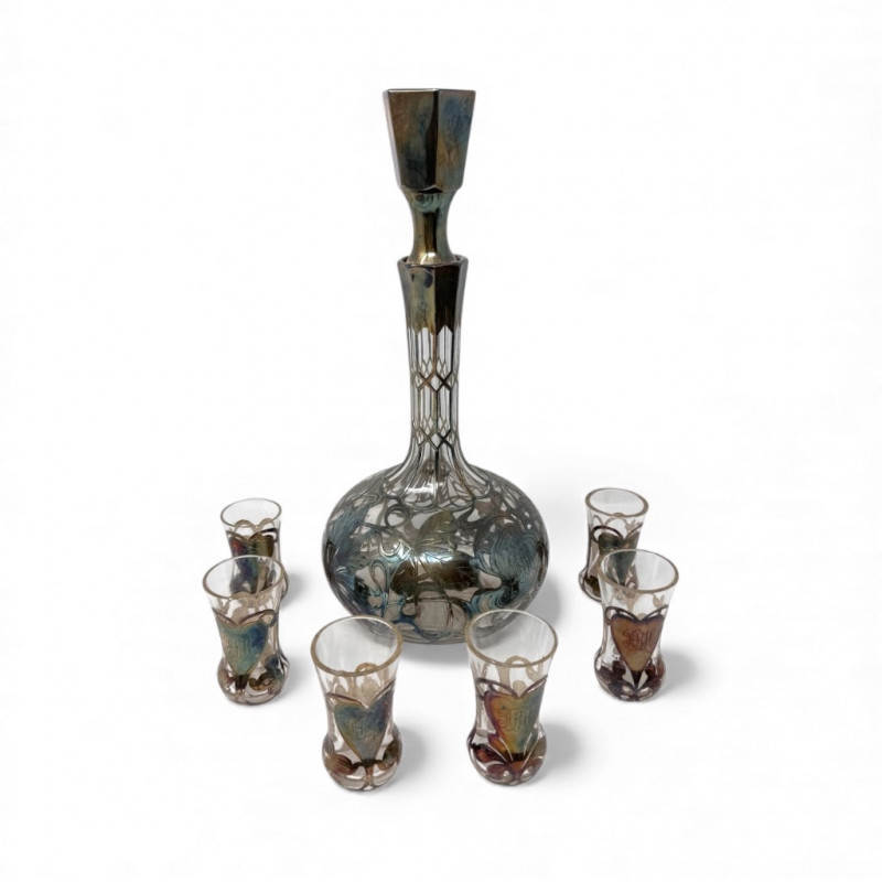 Silver Overlay Art Glass Decanter & 6 Shot Glasses Set.