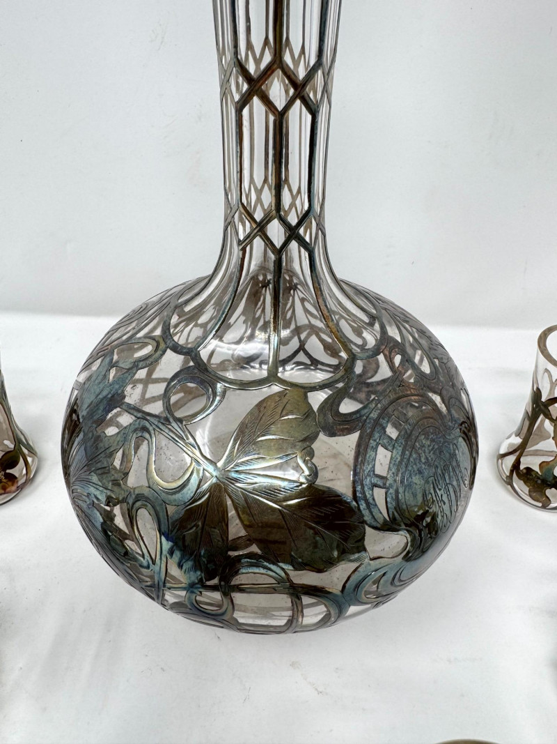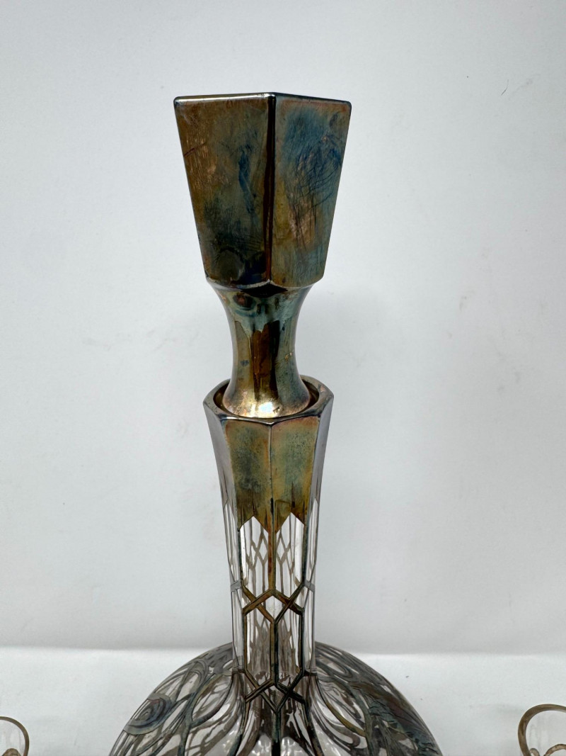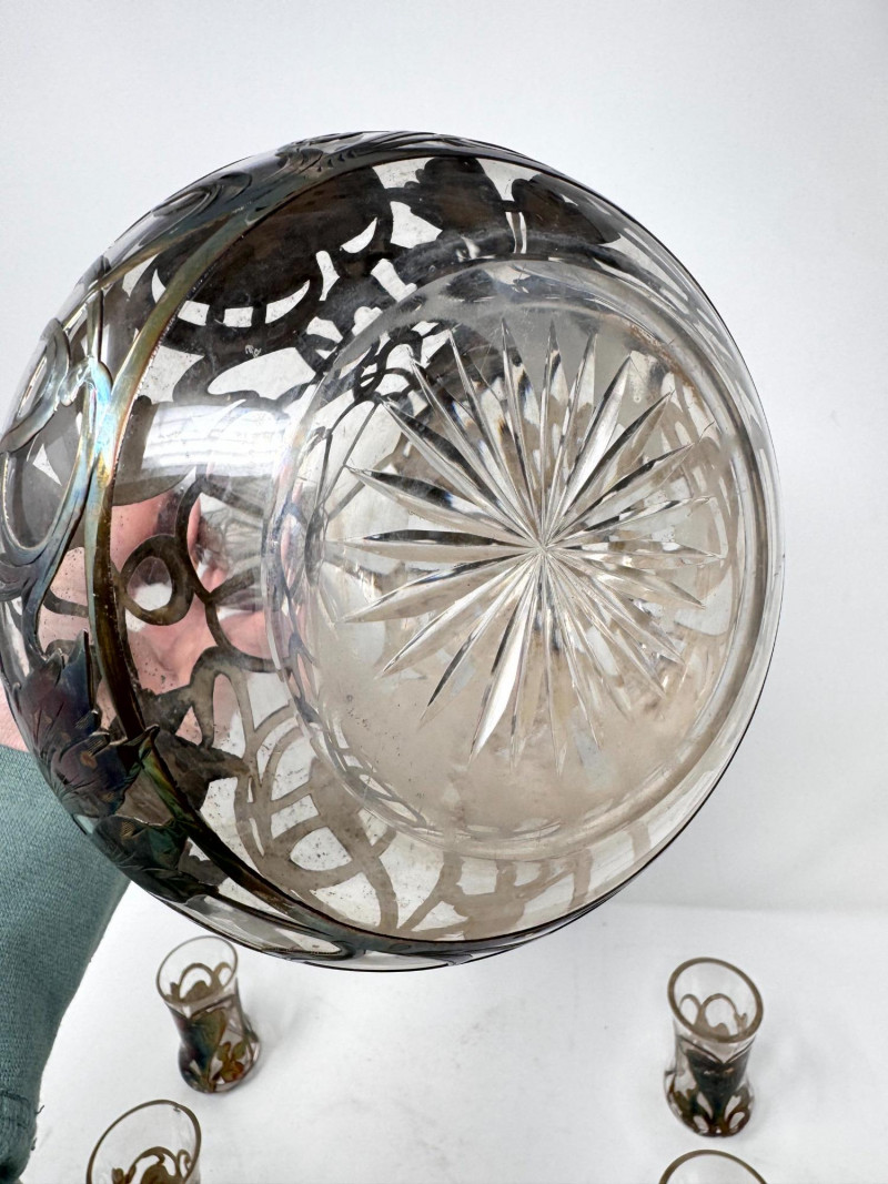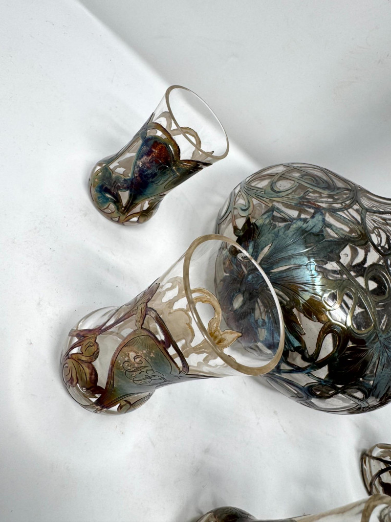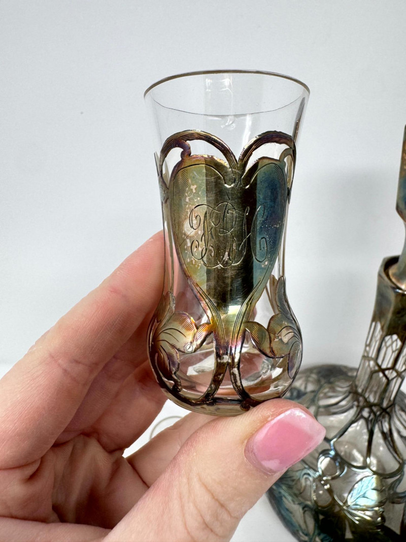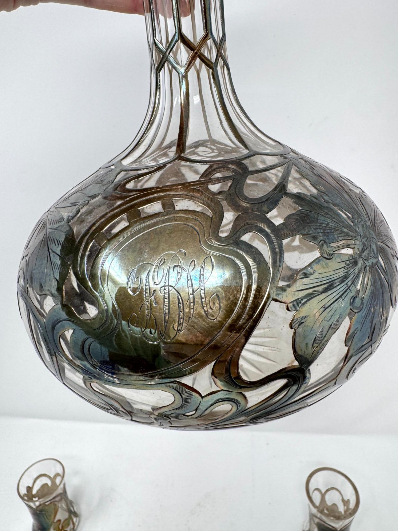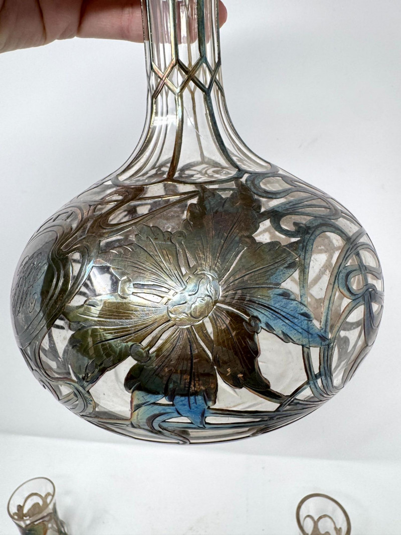 Lot # 2 - Silver Overlay Art Glass Decanter & 6 Shot Glasses Set