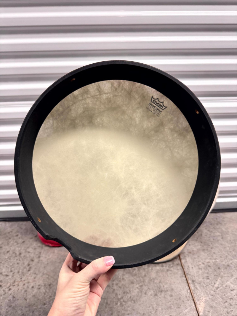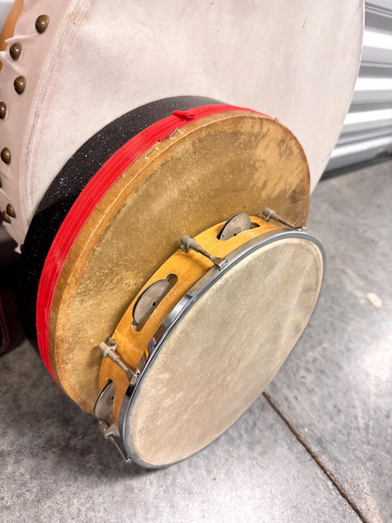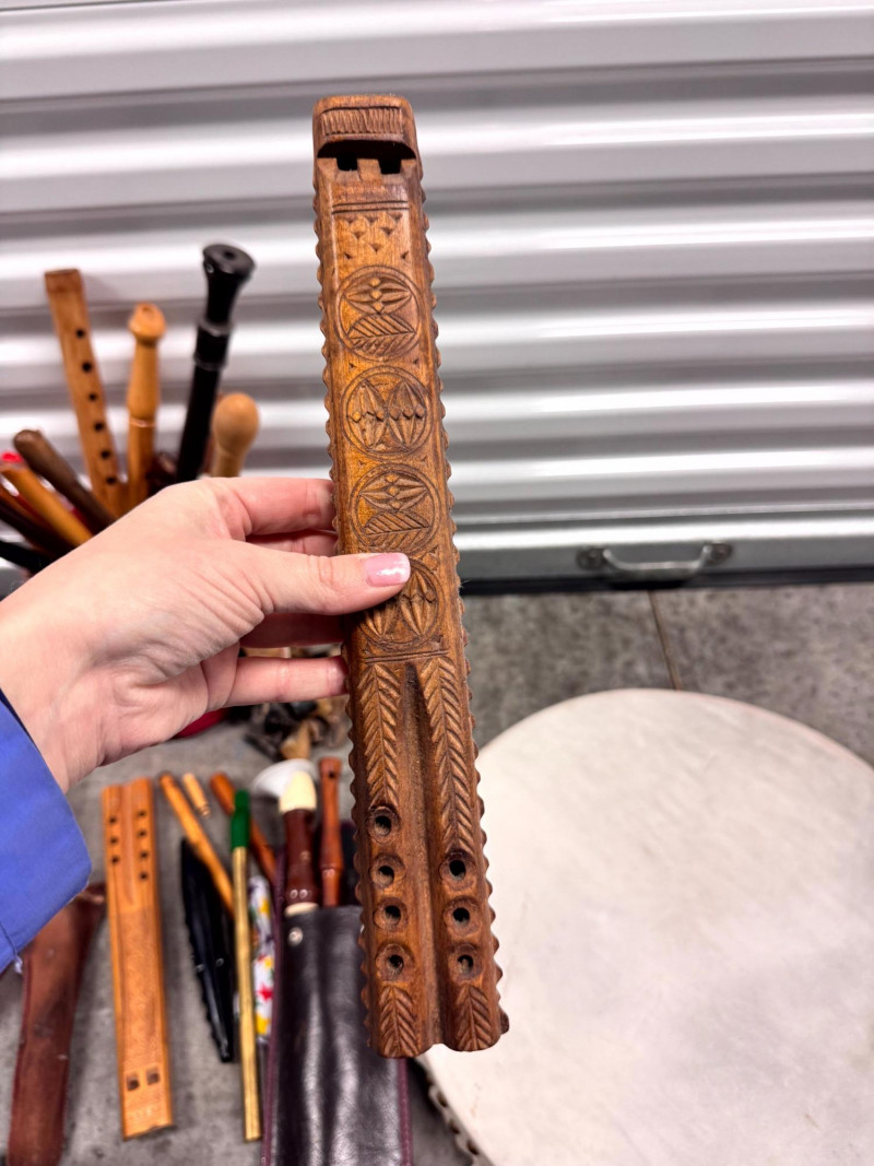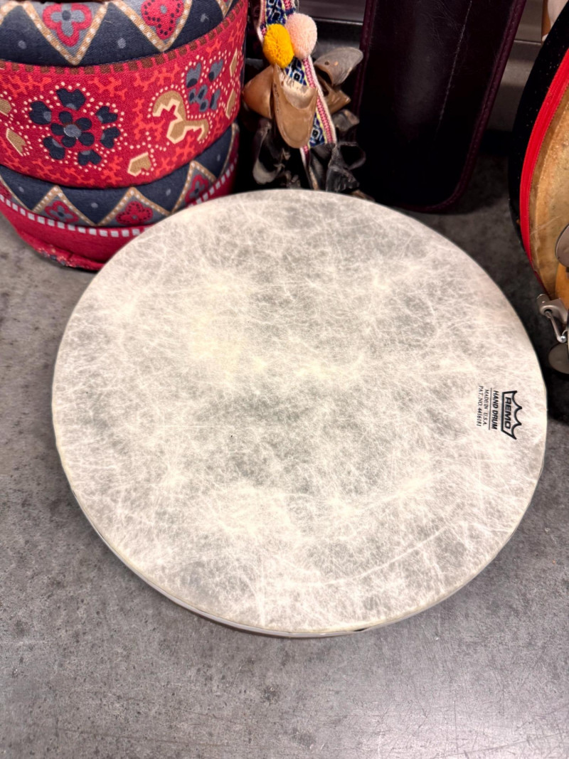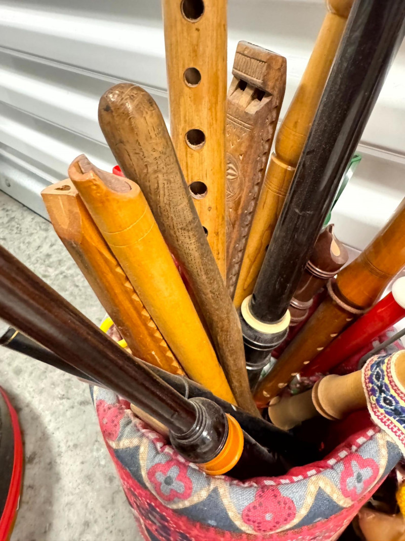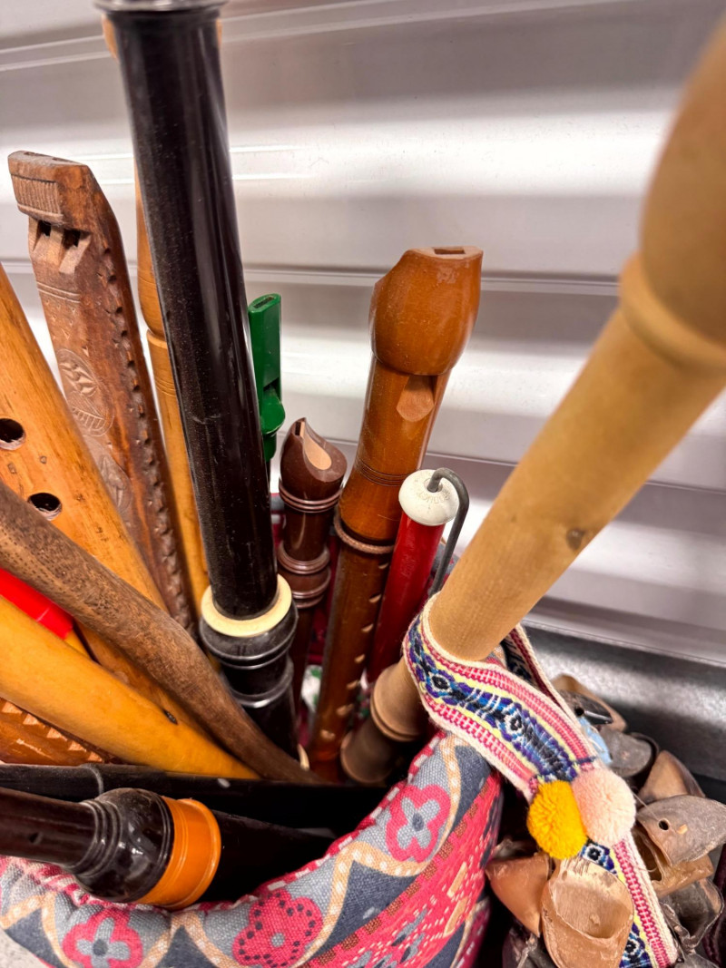 Music Makers & Tail Feather Shakers- Instrument Variety Hand Drums (5 Pieces, 8”–17.5” Wide) Includes Remo hand drum (marked “Remo Hand Drum Made in USA”) Mixture of wood-frame and synthetic-frame drums Natural hide and synthetic drumheads Sizes approx. 8" to 17.5" wide Surface wear, discoloration, and marks from use Wood & Plastic Recorders / Flutes Assorted recorders including Aulos Empire recorder Multiple carved and turned wooden flutes One carved wooden double flute with geometric pattern One long wind instrument with brown/beige accents Wind & Noise Makers “Scherz-Pfeife” plastic novelty whistle Mixed whistles and small wind pieces Some unbranded items Percussion Rattle / Dance Accessory Bundle of hooves strung on woven textile band Traditional-style rhythm shaker Miscellaneous Instruments & Tools Mixed mallets, strikers, and small percussion tools Textile-covered container included for storage Leather carry case with flutes and accessories
