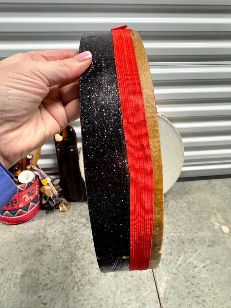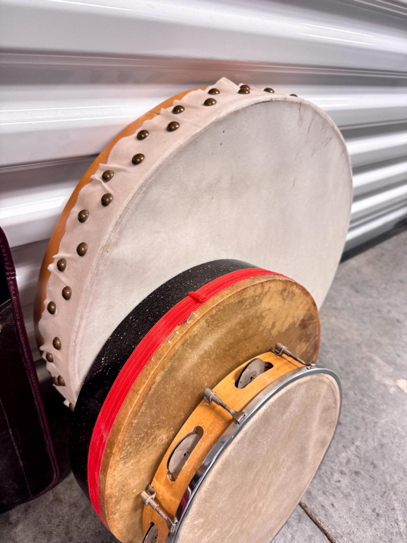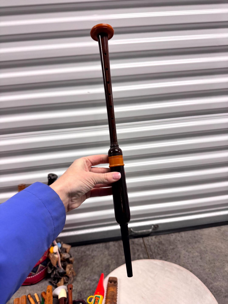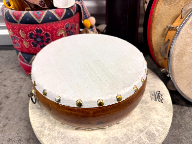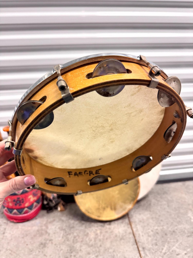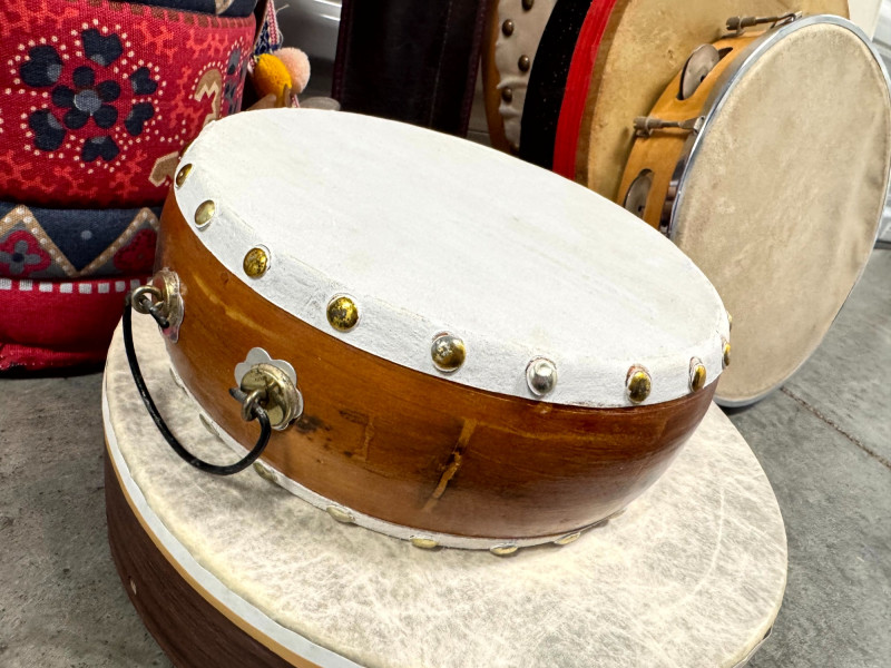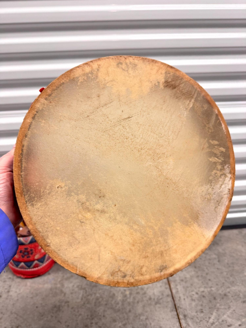Music Makers & Tail Feather Shakers- Instrument Variety Hand Drums (5 Pieces, 8”–17.5” Wide) Includes Remo hand drum (marked “Remo Hand Drum Made in USA”) Mixture of wood-frame and synthetic-frame drums Natural hide and synthetic drumheads Sizes approx. 8" to 17.5" wide Surface wear, discoloration, and marks from use Wood & Plastic Recorders / Flutes Assorted recorders including Aulos Empire recorder Multiple carved and turned wooden flutes One carved wooden double flute with geometric pattern One long wind instrument with brown/beige accents Wind & Noise Makers “Scherz-Pfeife” plastic novelty whistle Mixed whistles and small wind pieces Some unbranded items Percussion Rattle / Dance Accessory Bundle of hooves strung on woven textile band Traditional-style rhythm shaker Miscellaneous Instruments & Tools Mixed mallets, strikers, and small percussion tools Textile-covered container included for storage Leather carry case with flutes and accessories