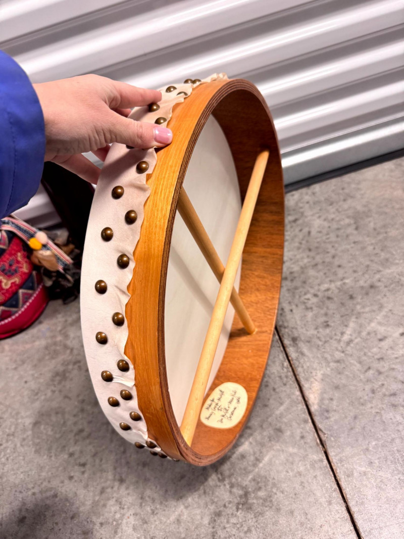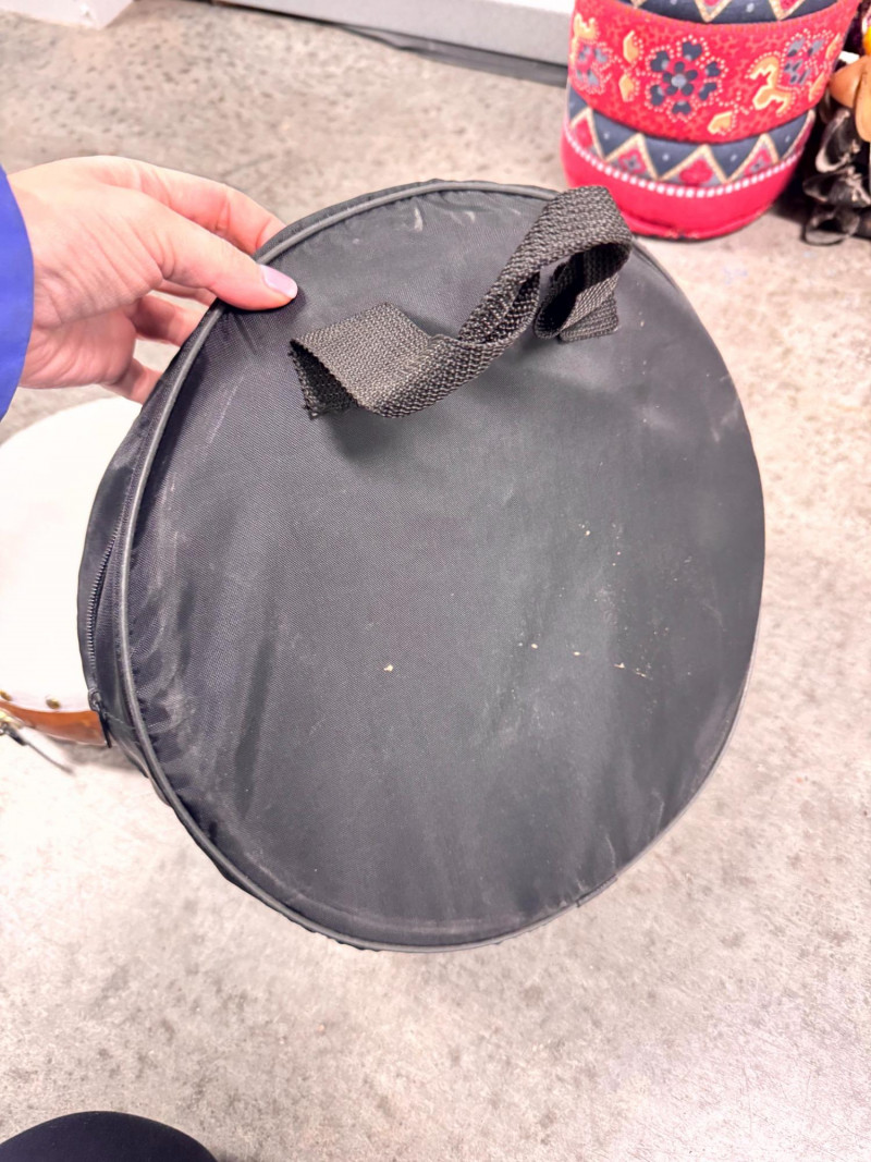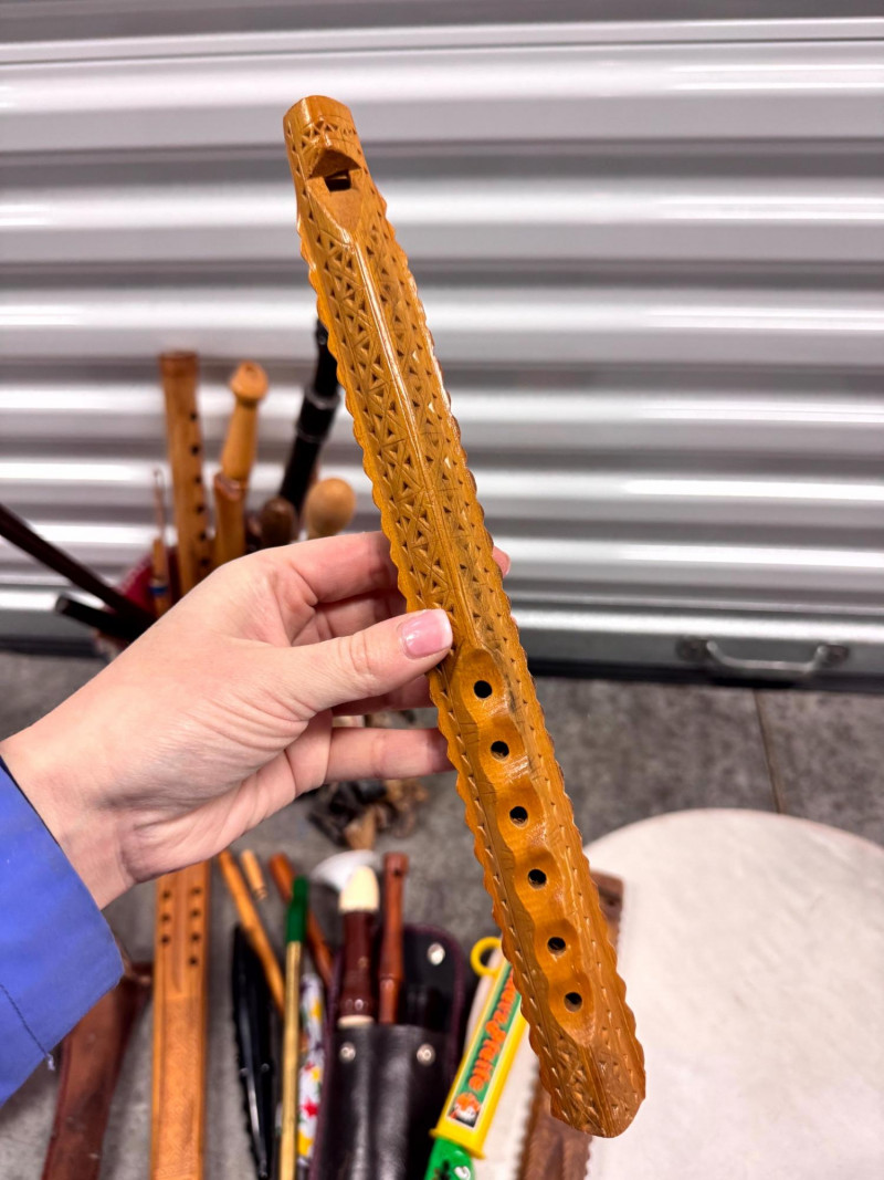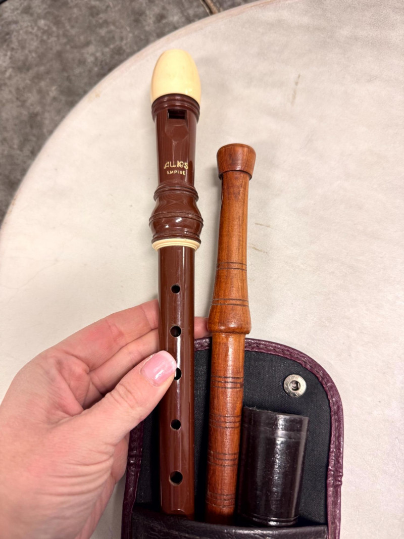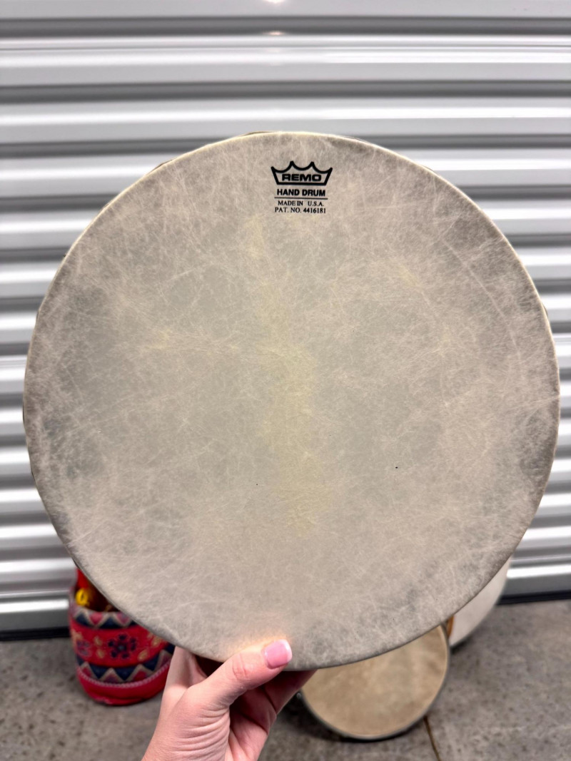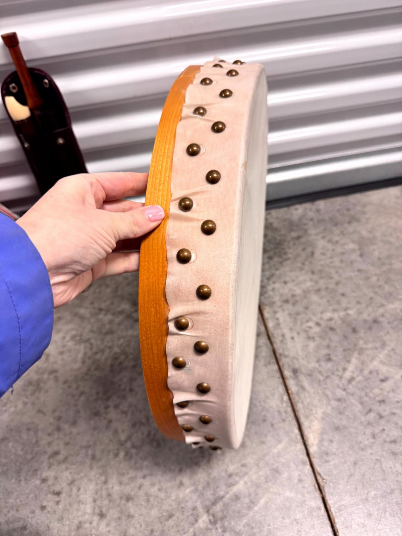 Music Makers & Tail Feather Shakers- Instrument Variety Hand Drums (5 Pieces, 8”–17.5” Wide) Includes Remo hand drum (marked “Remo Hand Drum Made in USA”) Mixture of wood-frame and synthetic-frame drums Natural hide and synthetic drumheads Sizes approx. 8" to 17.5" wide Surface wear, discoloration, and marks from use Wood & Plastic Recorders / Flutes Assorted recorders including Aulos Empire recorder Multiple carved and turned wooden flutes One carved wooden double flute with geometric pattern One long wind instrument with brown/beige accents Wind & Noise Makers “Scherz-Pfeife” plastic novelty whistle Mixed whistles and small wind pieces Some unbranded items Percussion Rattle / Dance Accessory Bundle of hooves strung on woven textile band Traditional-style rhythm shaker Miscellaneous Instruments & Tools Mixed mallets, strikers, and small percussion tools Textile-covered container included for storage Leather carry case with flutes and accessories