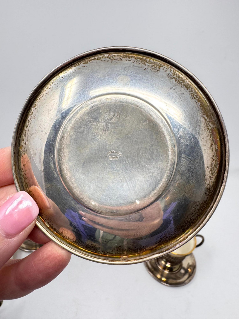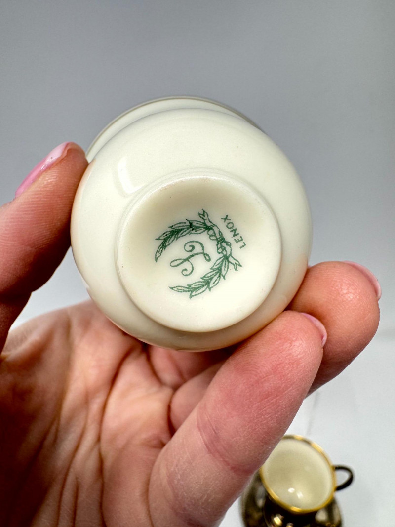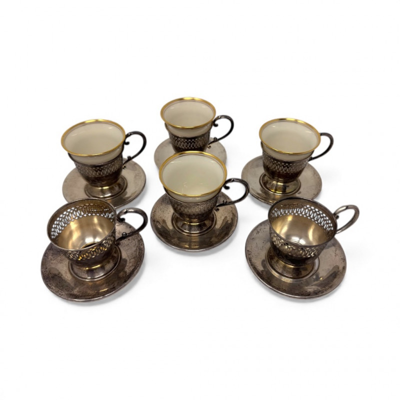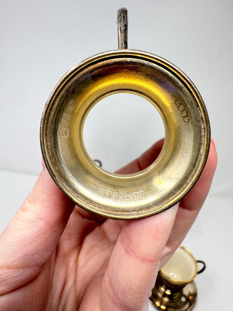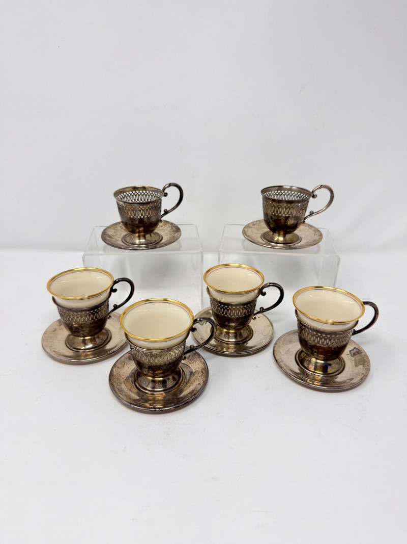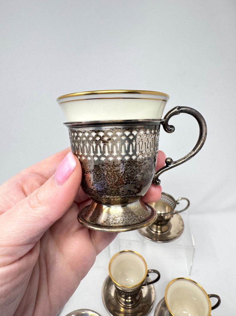 6 Sterling Cup Holders & Saucers w/ 4 Lenox Demitasse Cups. Sterling Silver Components (6 Holders + 6 Saucers) All six cup holders marked STERLING All six saucers marked STERLING Combined sterling weight approx. 272.73 grams (without inserts) Lenox Demitasse Cup Inserts (4 Pieces) Cream porcelain with gold rim Marked Lenox with wreath logo Two holders do not have inserts Important Disclaimer: Jewelry/gemstones/metals in this lot has not been tested. By bidding, you agree to purchase as is, with no guarantees on metal purity, gemstone authenticity, or content. No refunds issued on these factors.