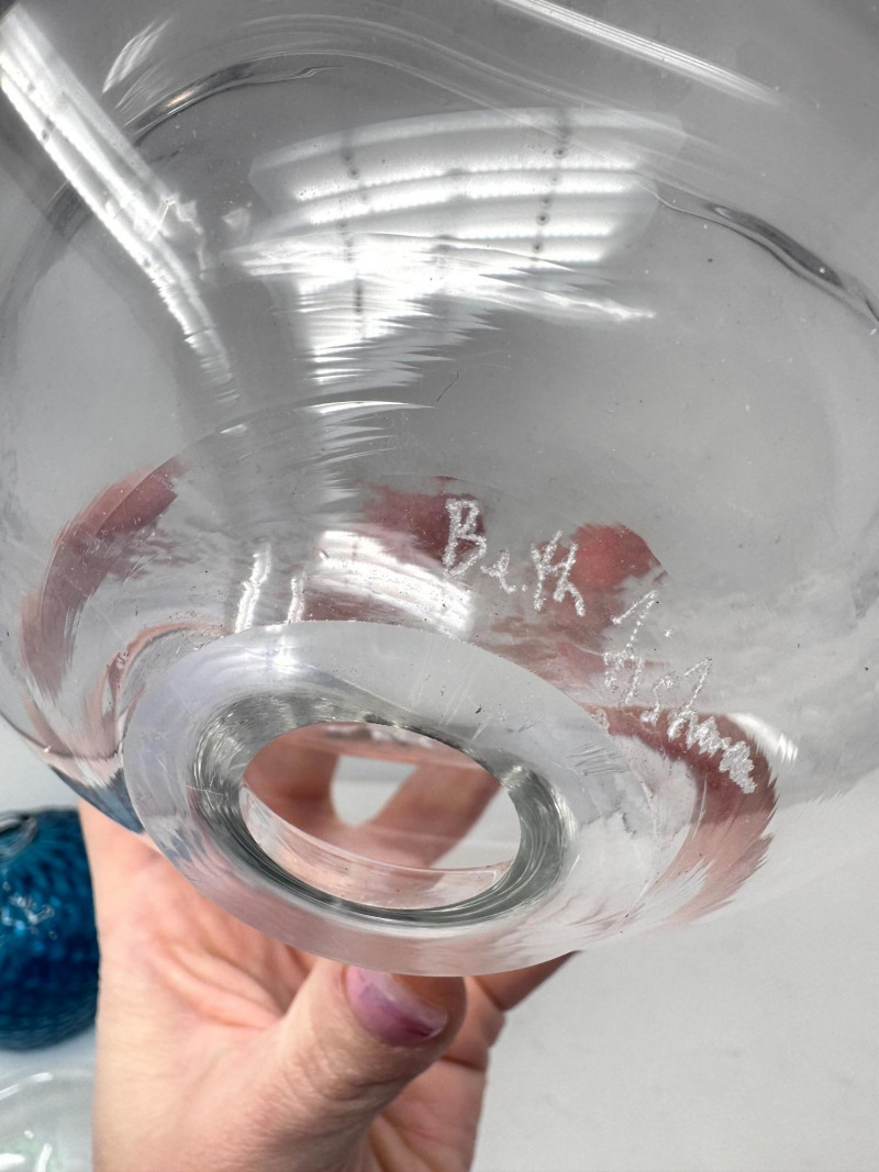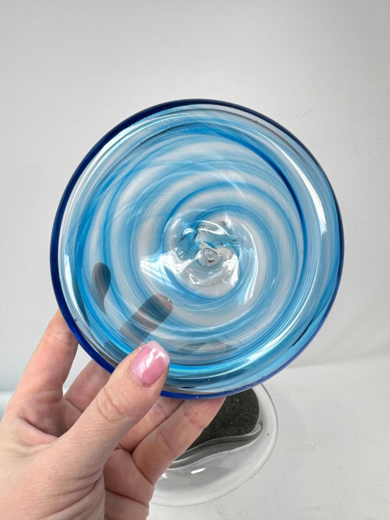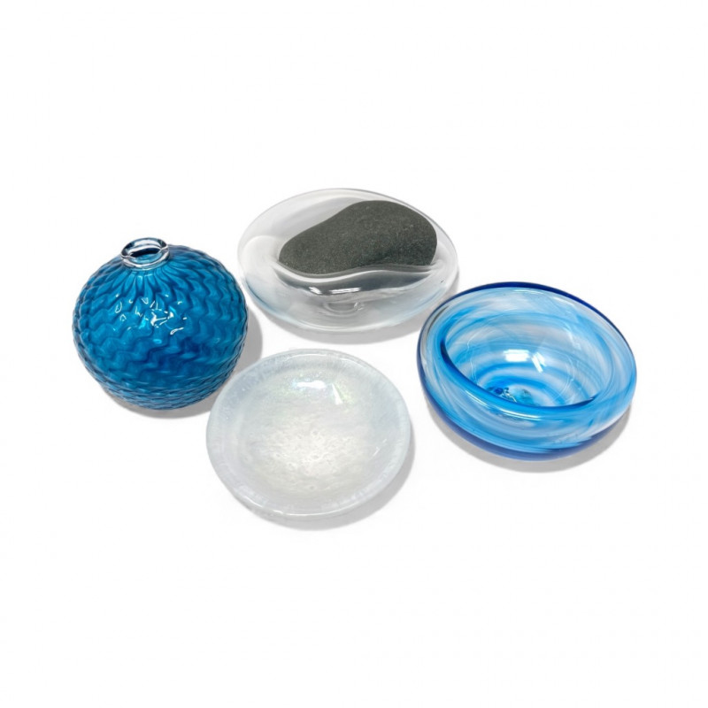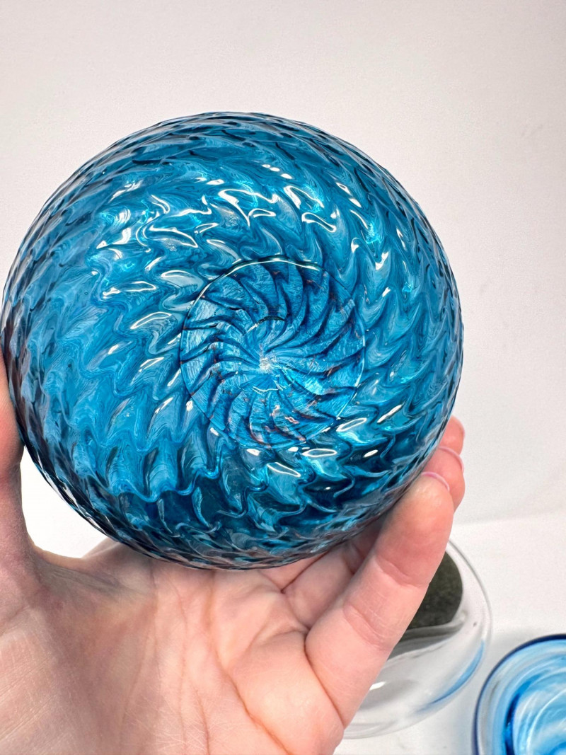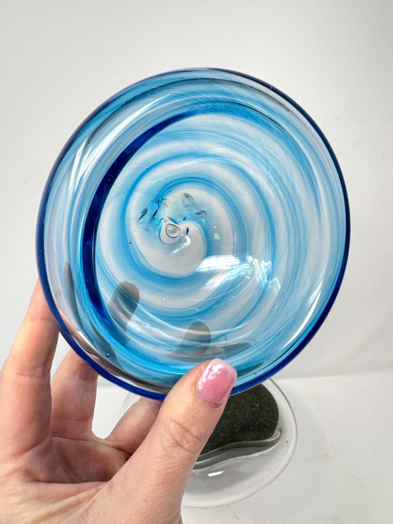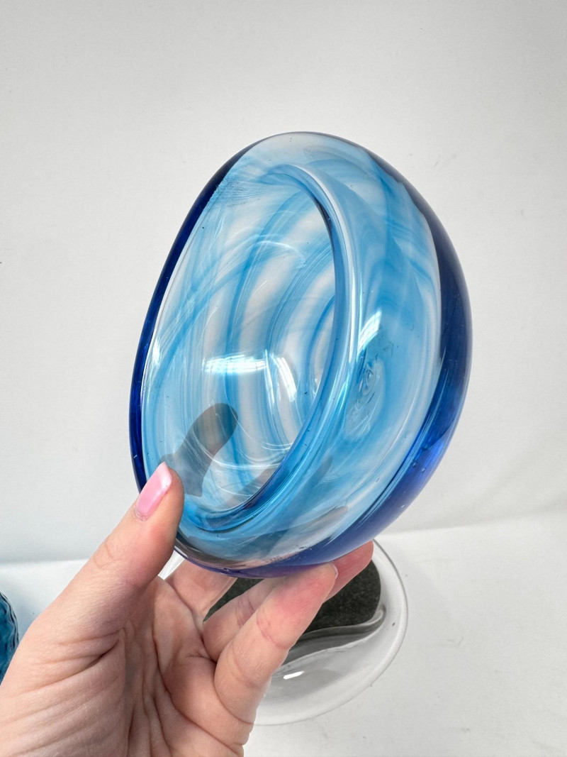 Signed Stone Glass Sculpture w/ Teal Vase & Blown Glass Bowls. Signed Glass & Stone Sculpture (7” × 3.5”) Signed on base (appears to read Beth Fishman) Approx. 7" wide × 3.5" tall Teal Textured Bud Vase (4.5” × 4”) Deep teal blown glass Raised swirl/chevron pattern Round body with small opening Approx. 4.5" tall × 4" wide Blue Swirl Bowl (5” × 2.5”) Blown glass with blue and white spiral design Approx. 5" wide × 2.5" tall Clear Iridescent Bowl (5”) Blown glass with internal iridescent shimmer Flat shallow form Approx. 5" wide