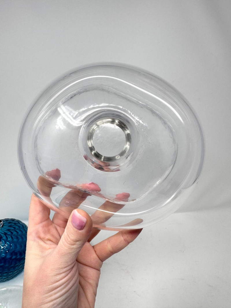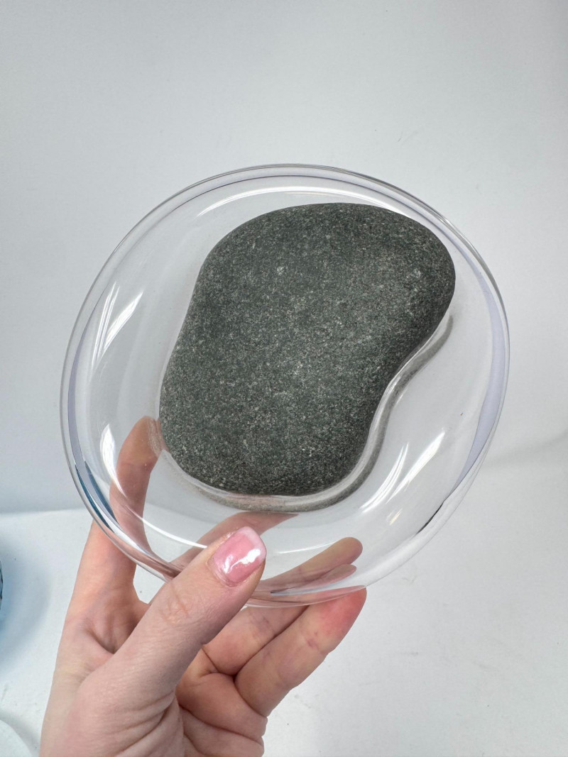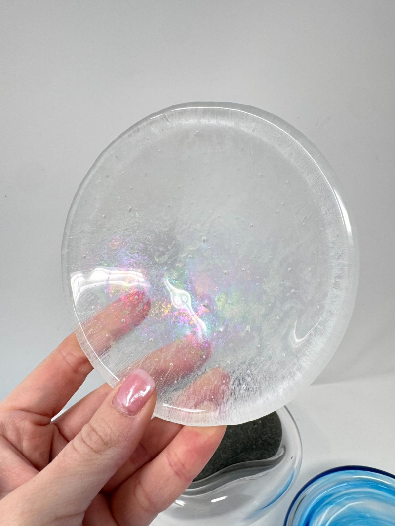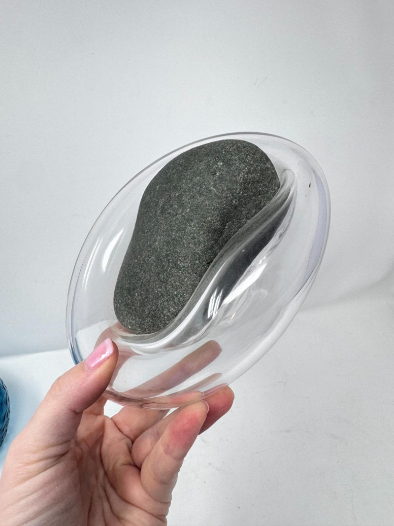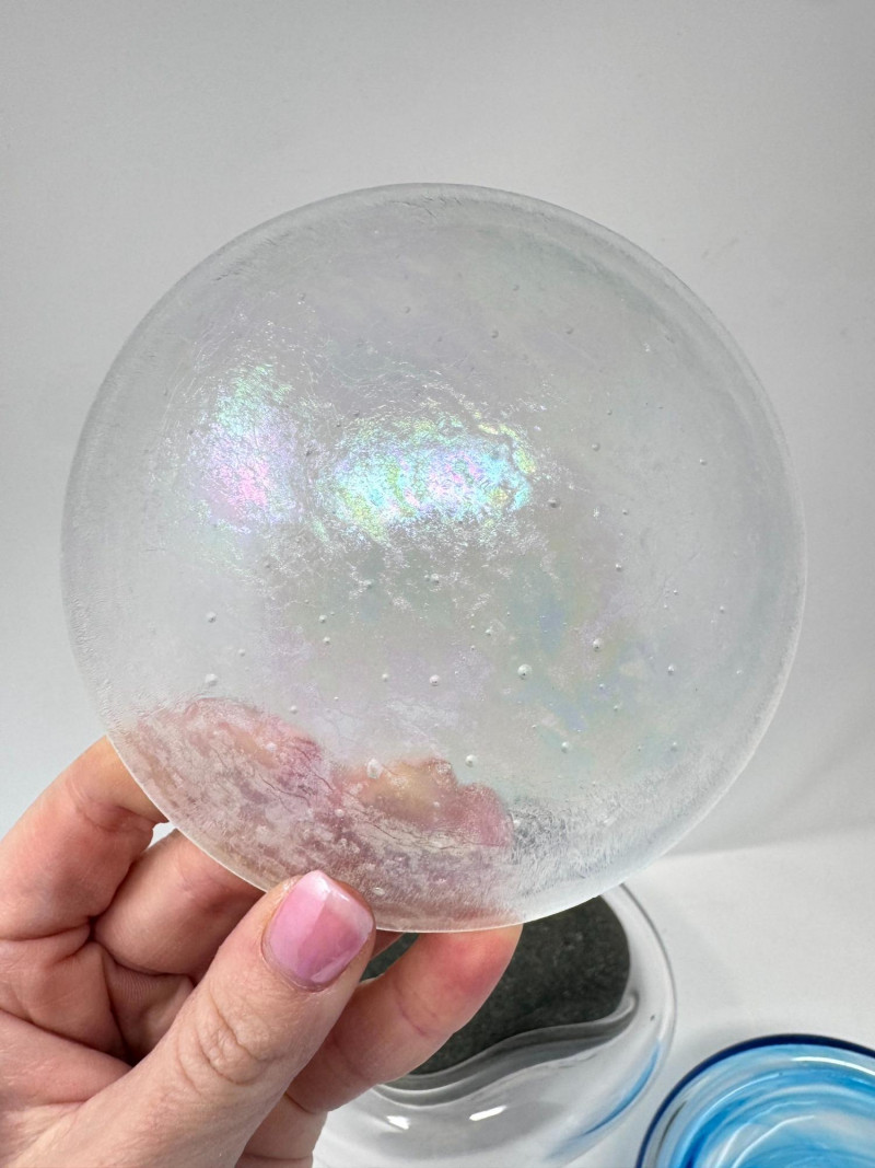 Signed Stone Glass Sculpture w/ Teal Vase & Blown Glass Bowls. Signed Glass & Stone Sculpture (7” × 3.5”) Signed on base (appears to read Beth Fishman) Approx. 7" wide × 3.5" tall Teal Textured Bud Vase (4.5” × 4”) Deep teal blown glass Raised swirl/chevron pattern Round body with small opening Approx. 4.5" tall × 4" wide Blue Swirl Bowl (5” × 2.5”) Blown glass with blue and white spiral design Approx. 5" wide × 2.5" tall Clear Iridescent Bowl (5”) Blown glass with internal iridescent shimmer Flat shallow form Approx. 5" wide