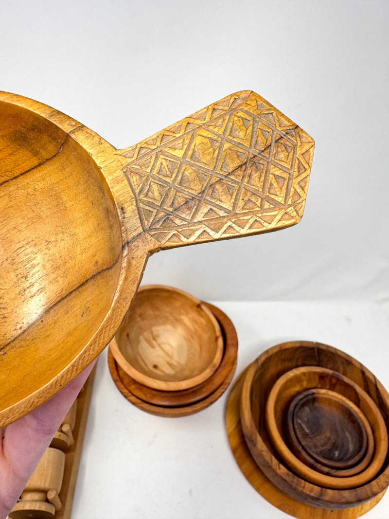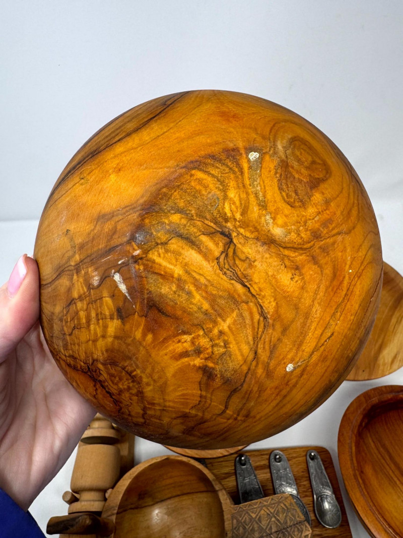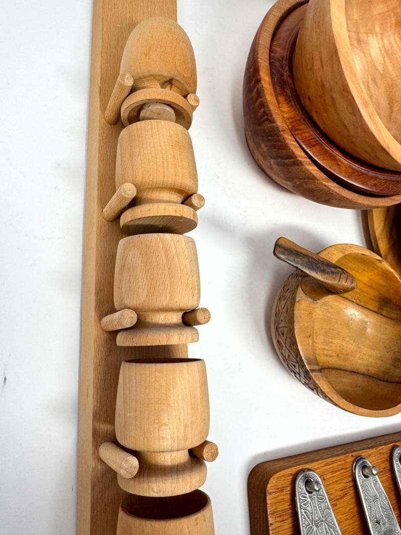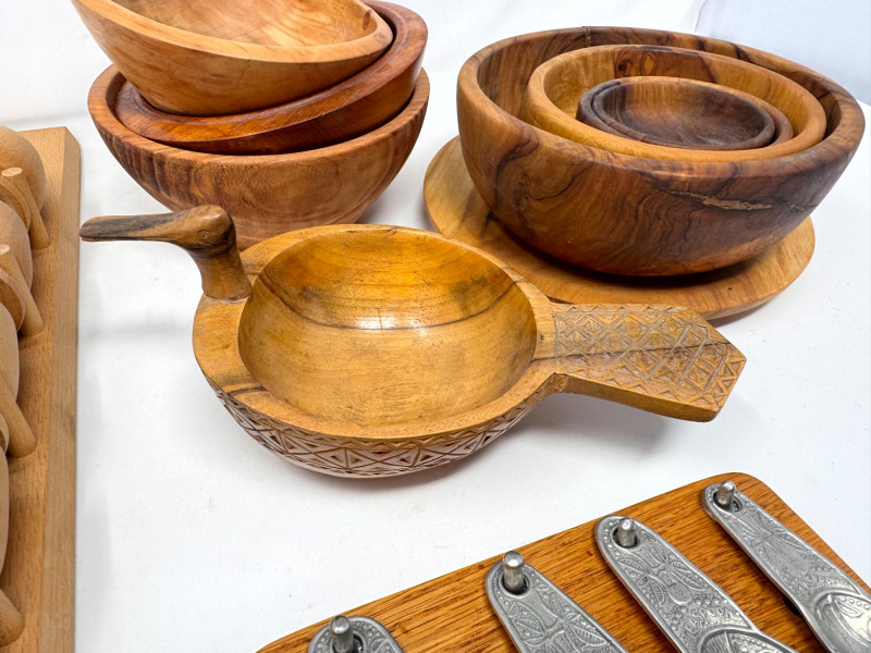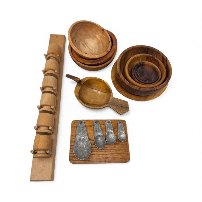 Vintage Wood Kitchenware Lot + Pewter Spoons + Egg Cup Rack.