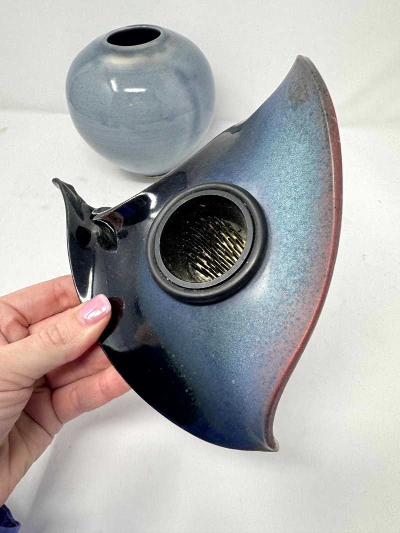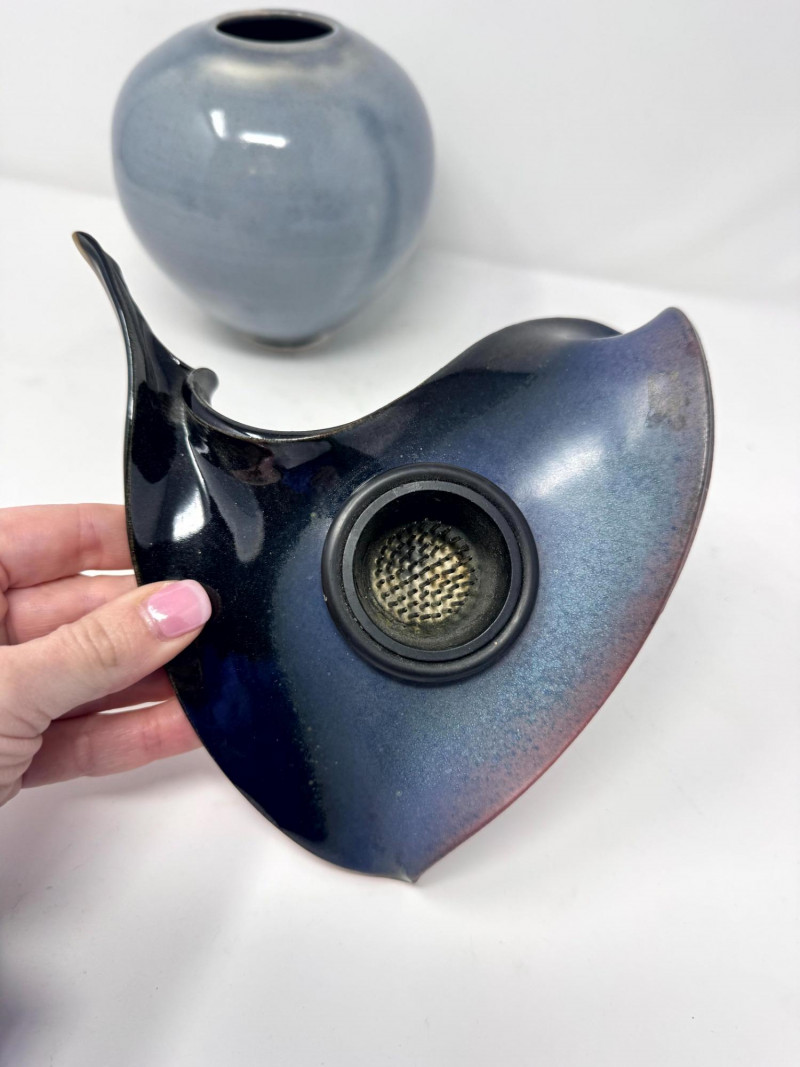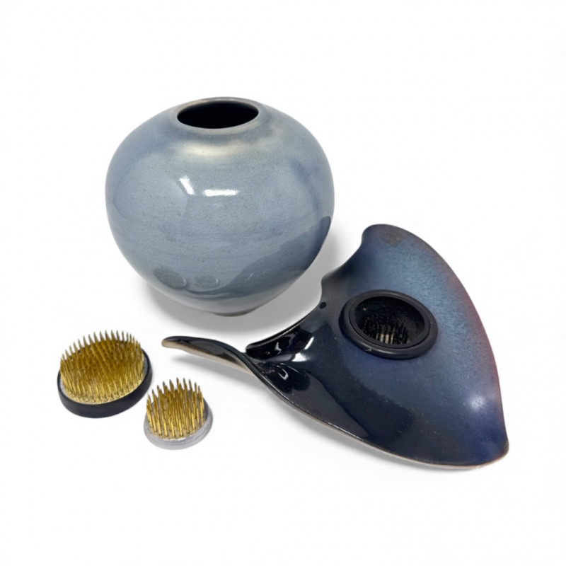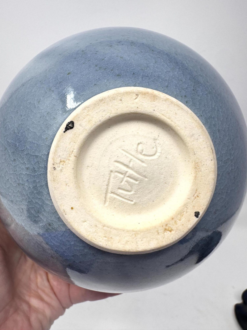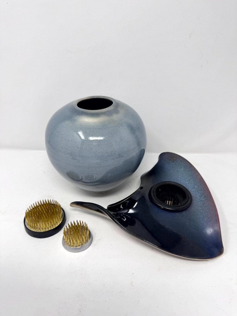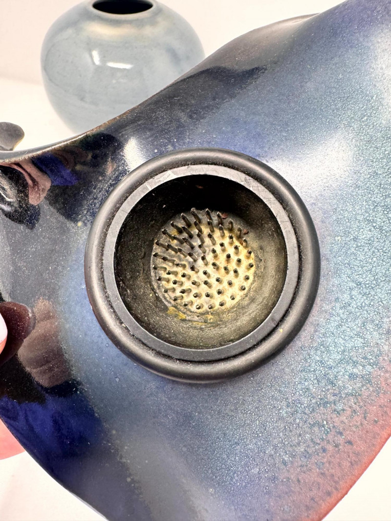 Blue Vase Signed by Tuttle + Pottery Flower Frog & 2 Japanese Kenzan. • Signed blue studio pottery vase by Tuttle (6" tall)