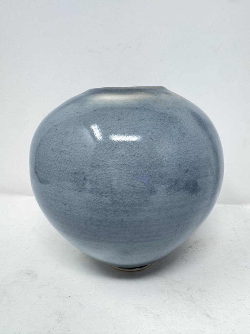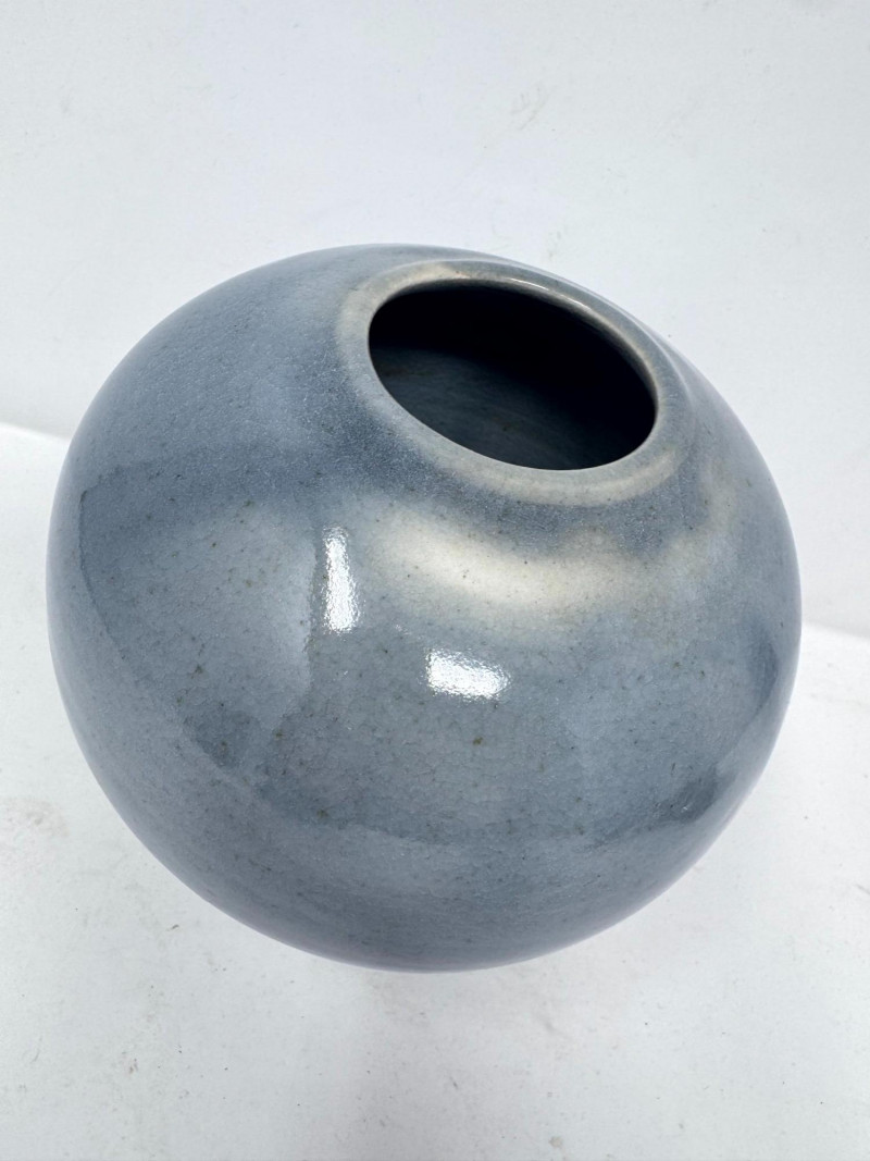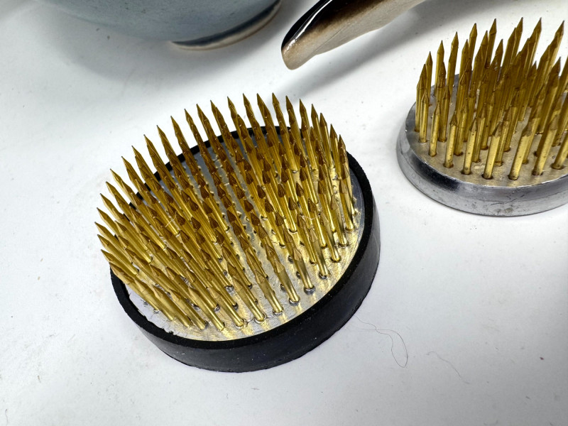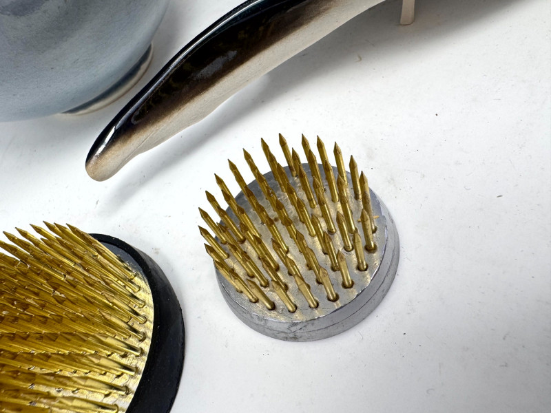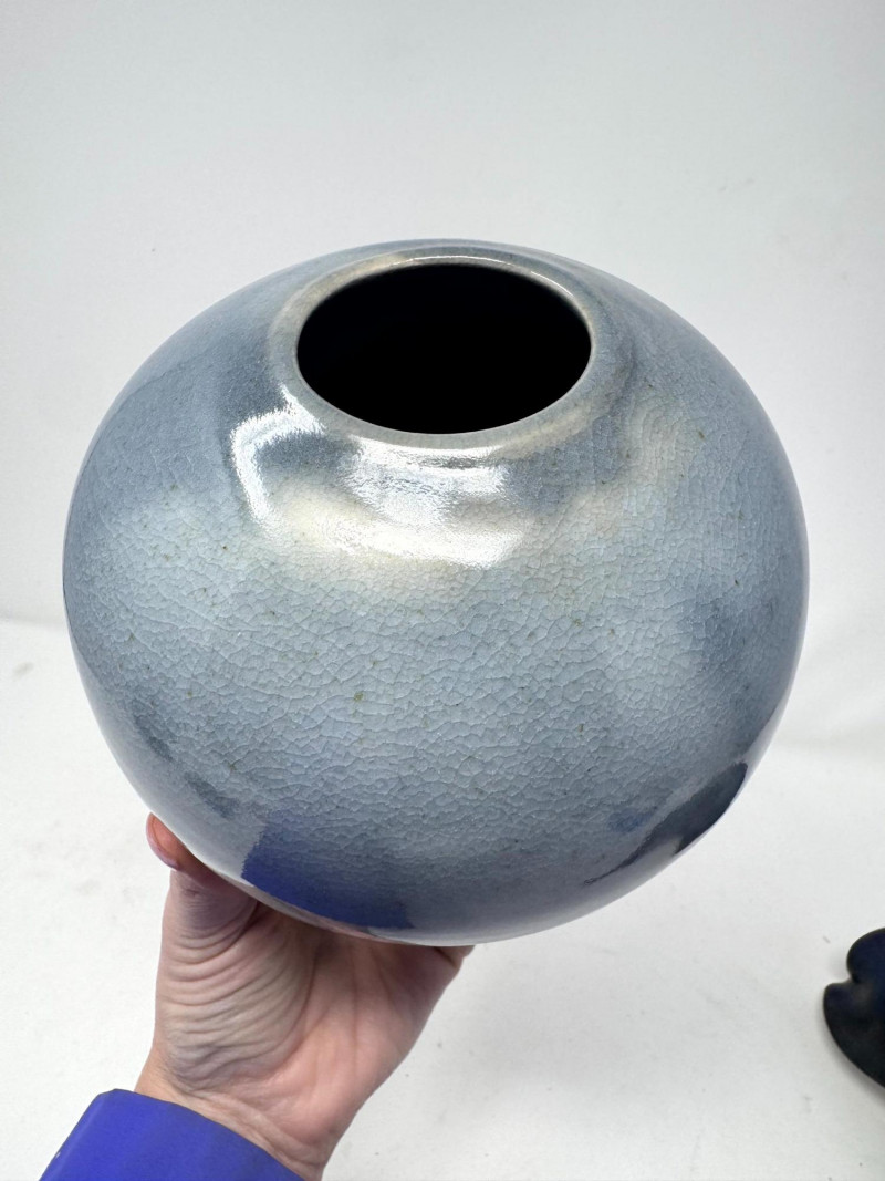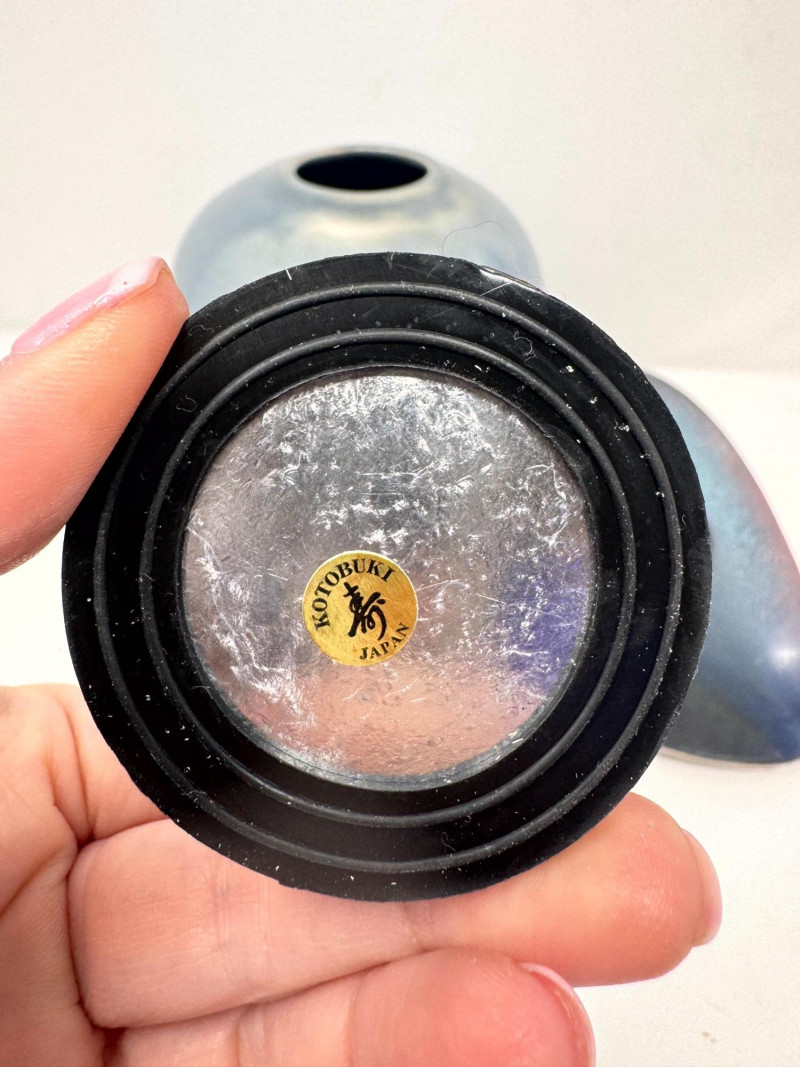 Blue Vase Signed by Tuttle + Pottery Flower Frog & 2 Japanese Kenzan. • Signed blue studio pottery vase by Tuttle (6" tall)