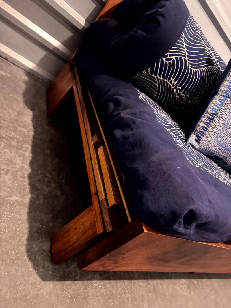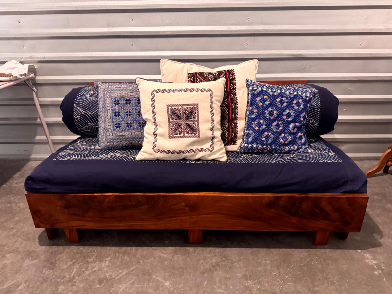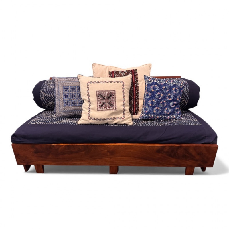 Boho-Style Convertible Wood Daybed w/ Hand-Stitched Pillows. Dimensions (as shown):