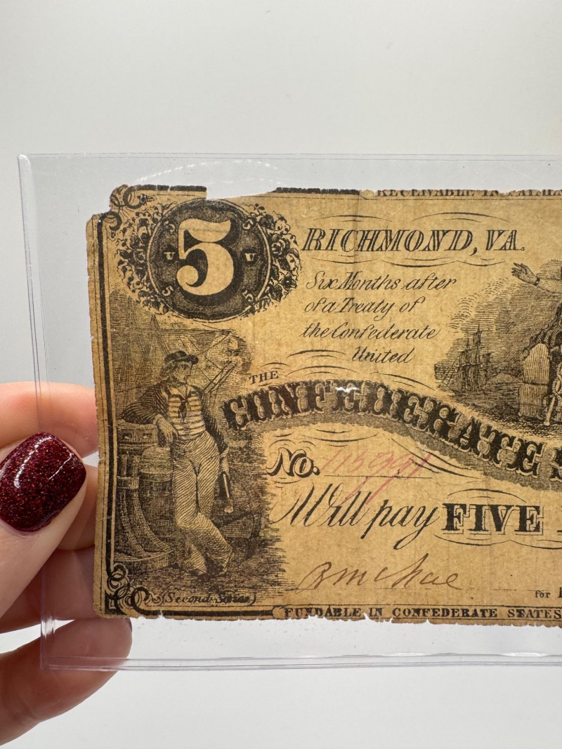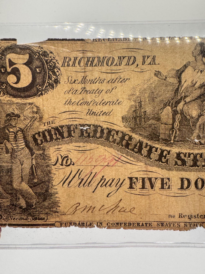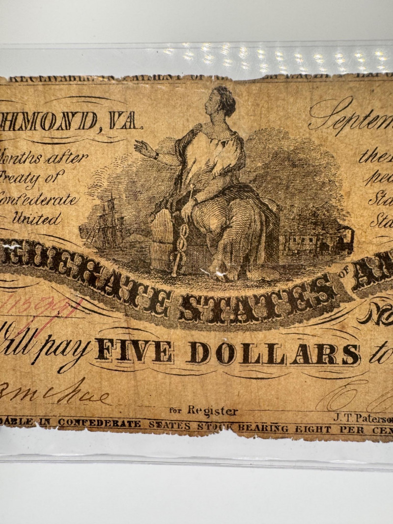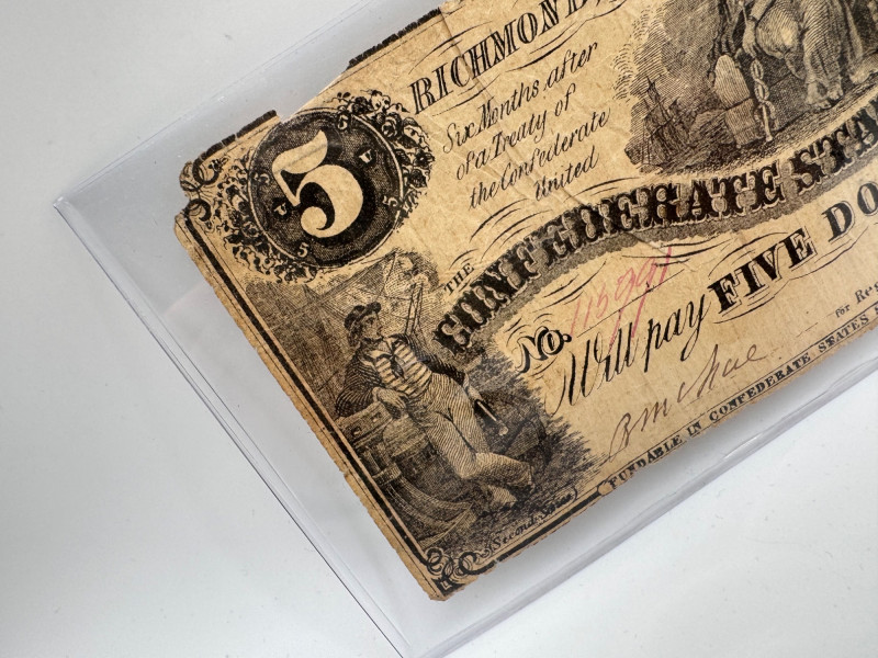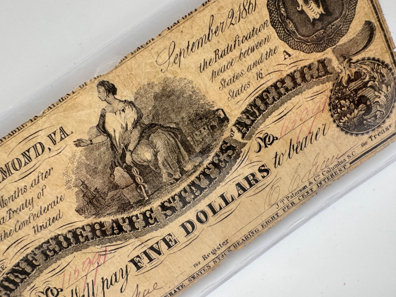 Lot # 93 - 1861 Confederate $5 Richmond Note – Authentic Civil War Currency