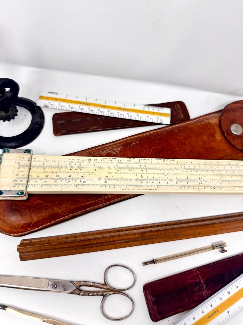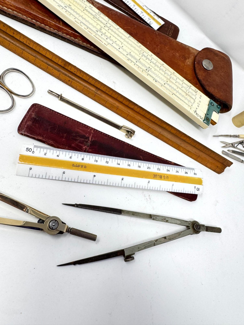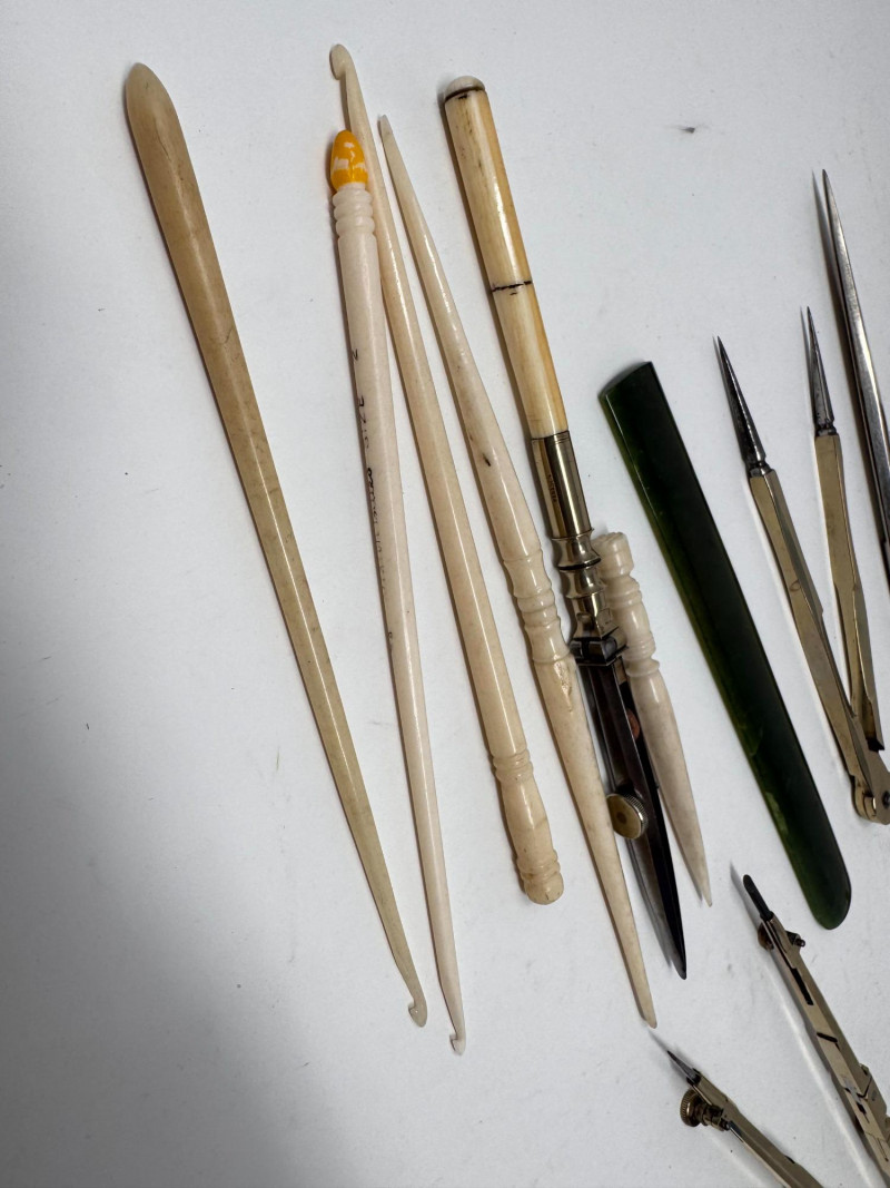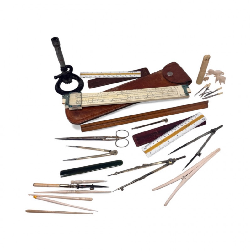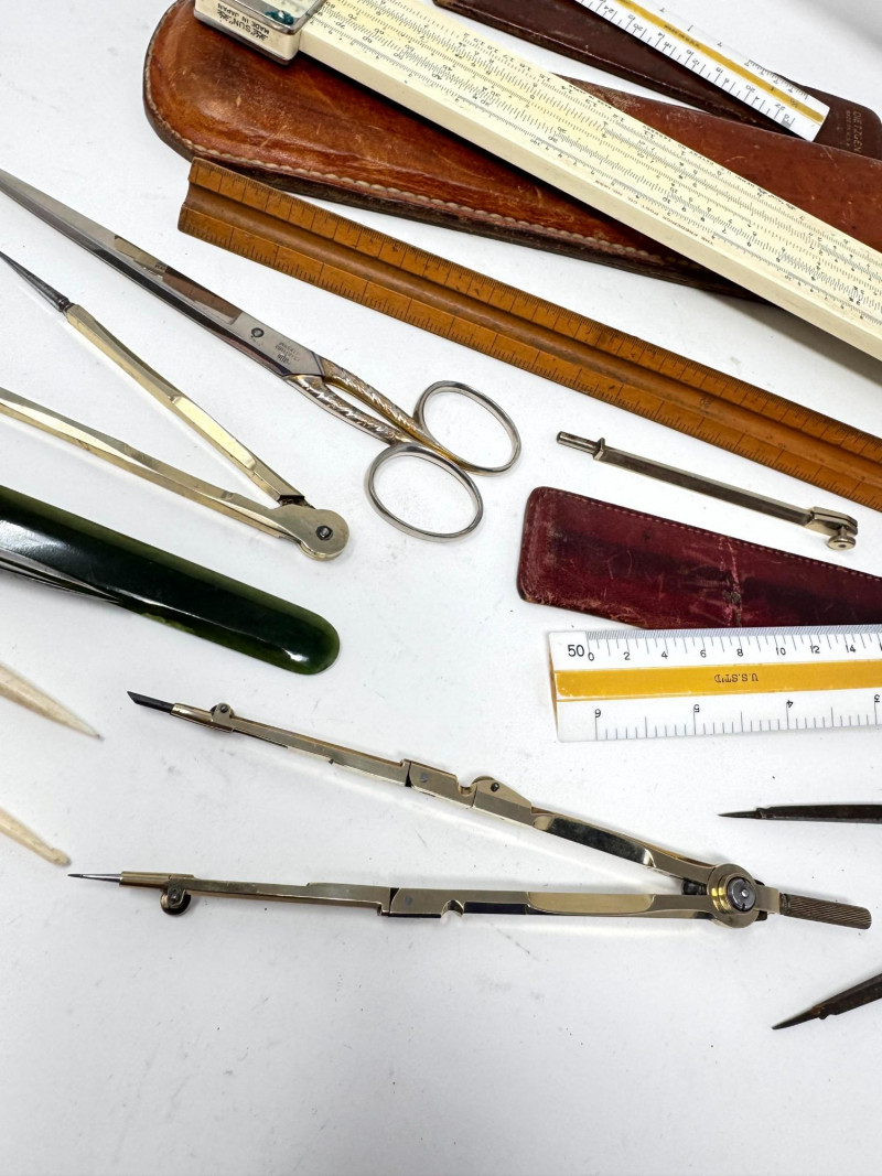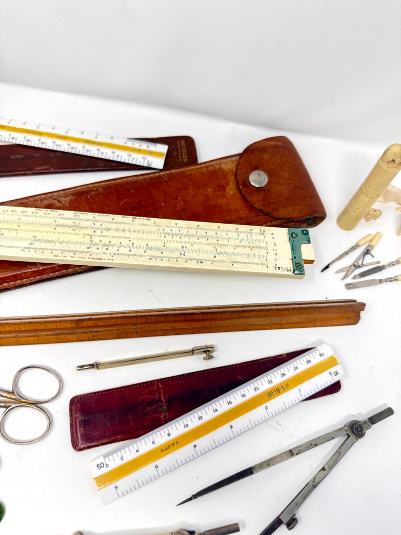 Lot # 116 - Assorted Vintage Measuring & Drafting Tools + Bone & Jade Items