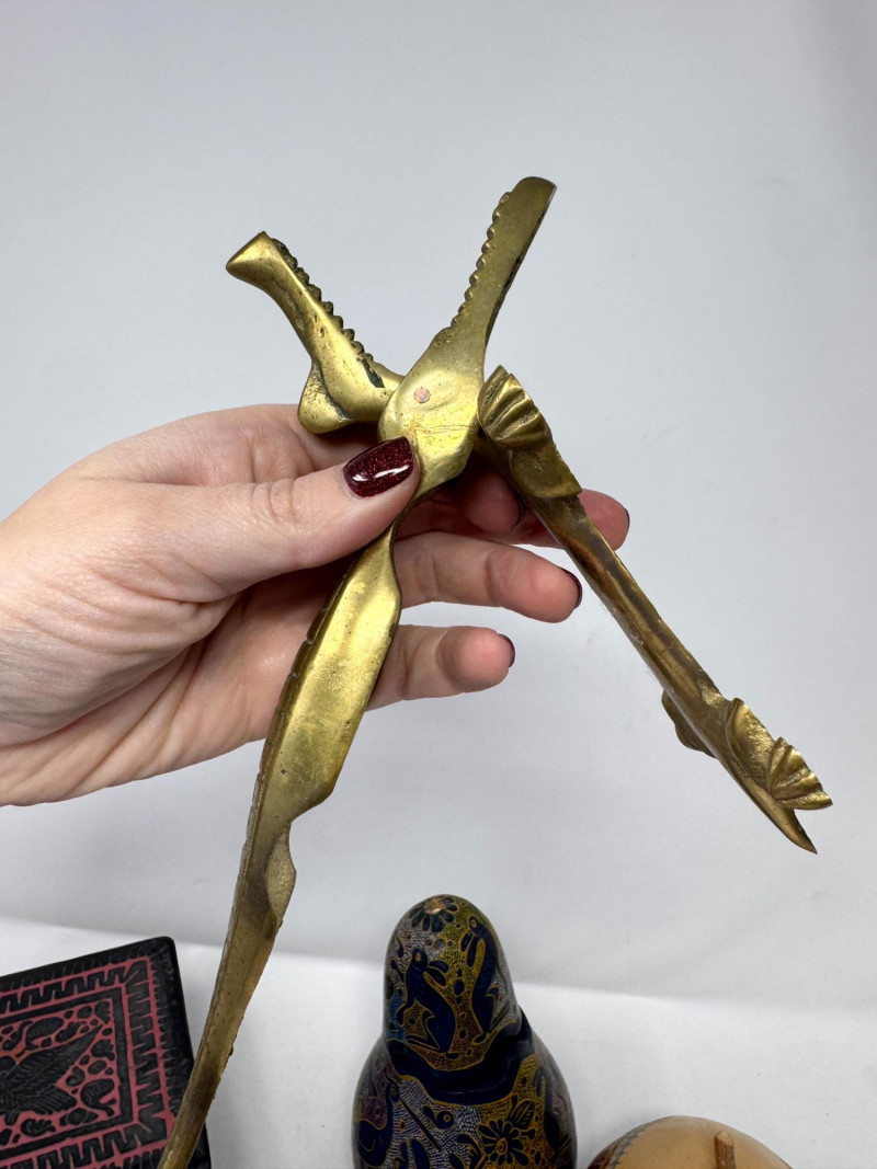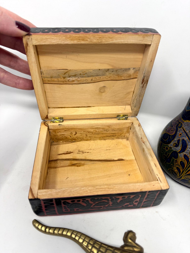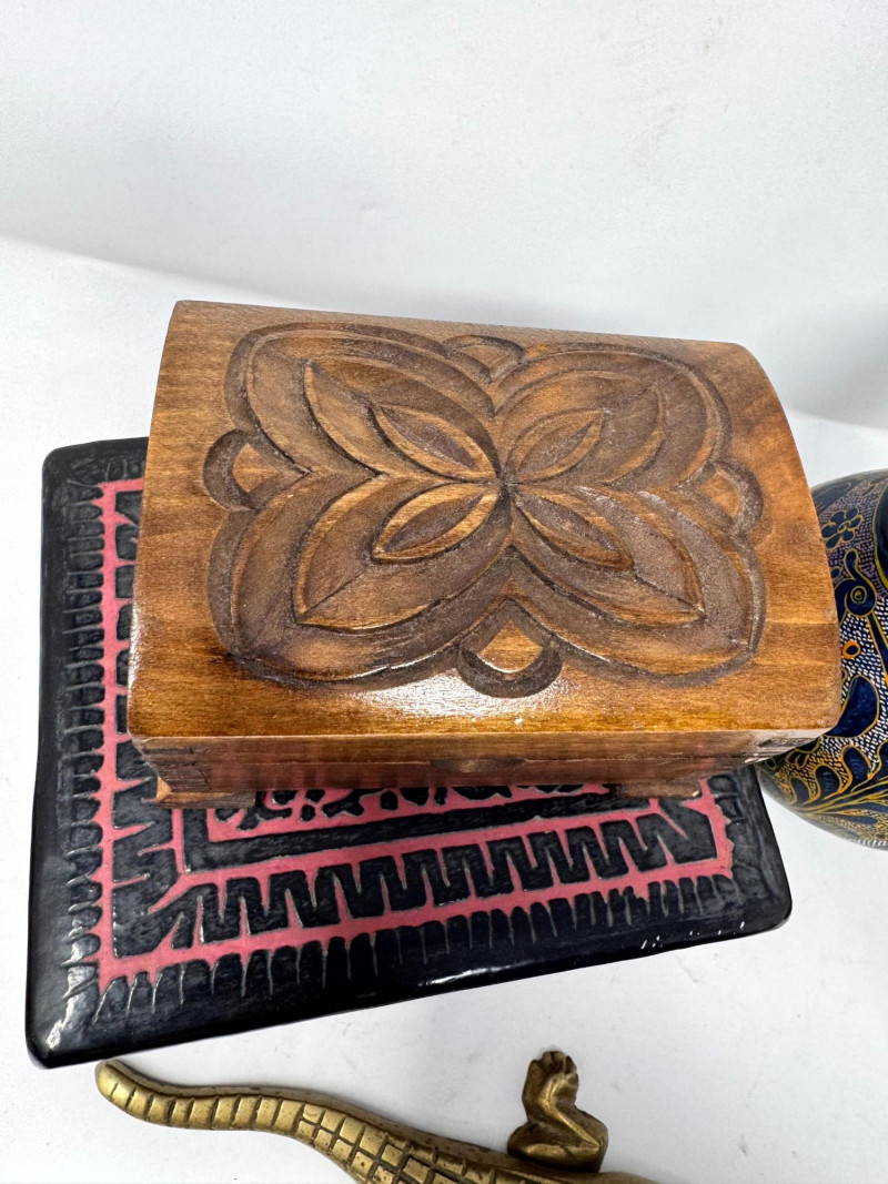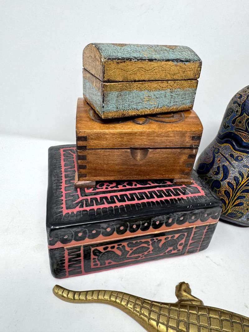 World Trinket Boxes, Crocodile Nutcracker, Carved Gourd & Mini Stands.
