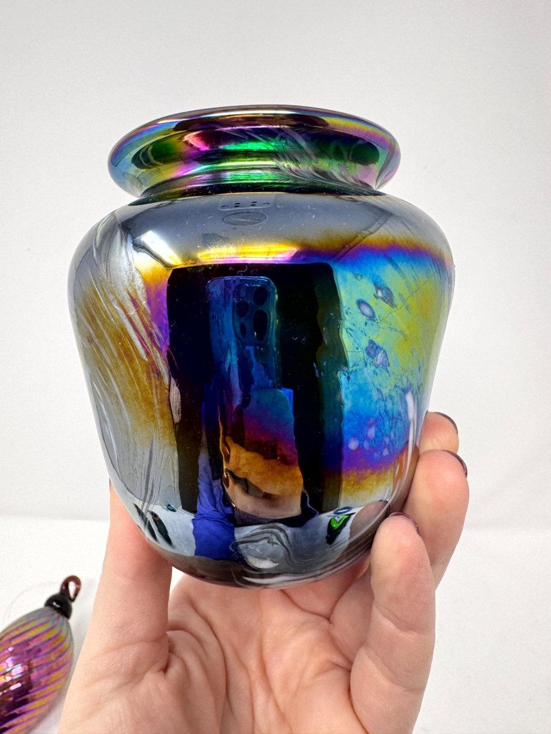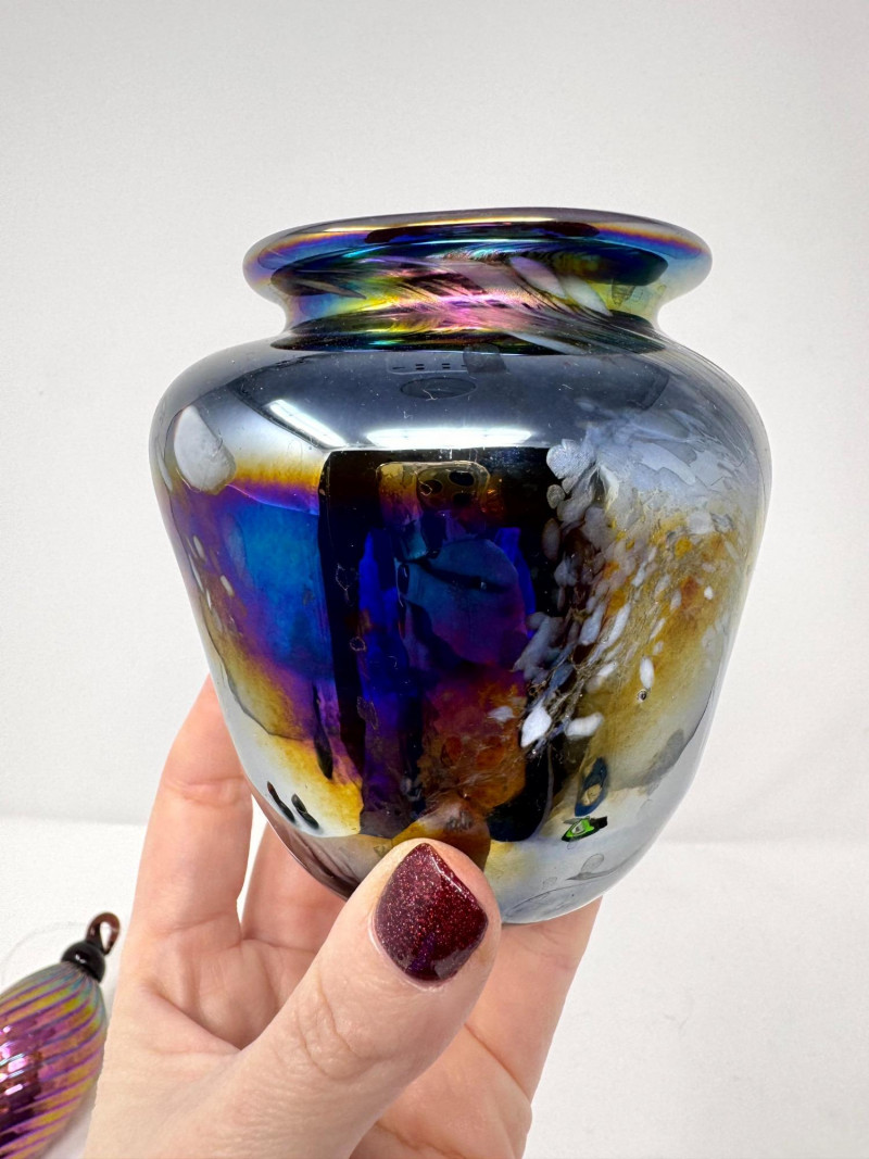 Lot # 126 - Iridescent Blown Glass Ornament + Mt. St. Helens & J. Diller Vases