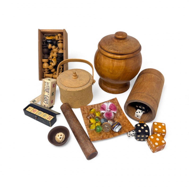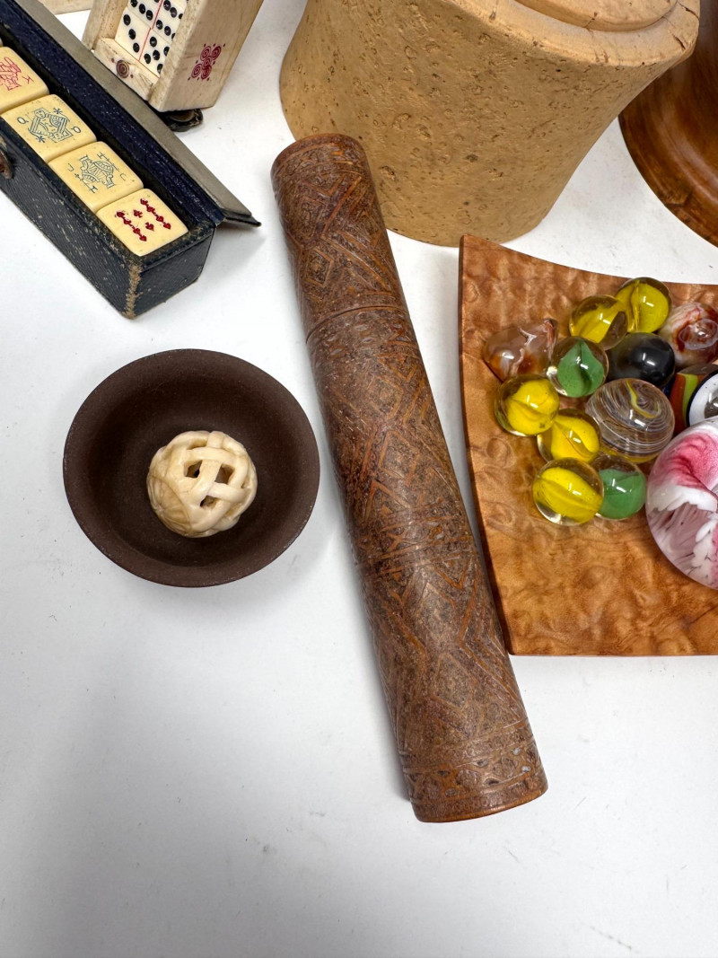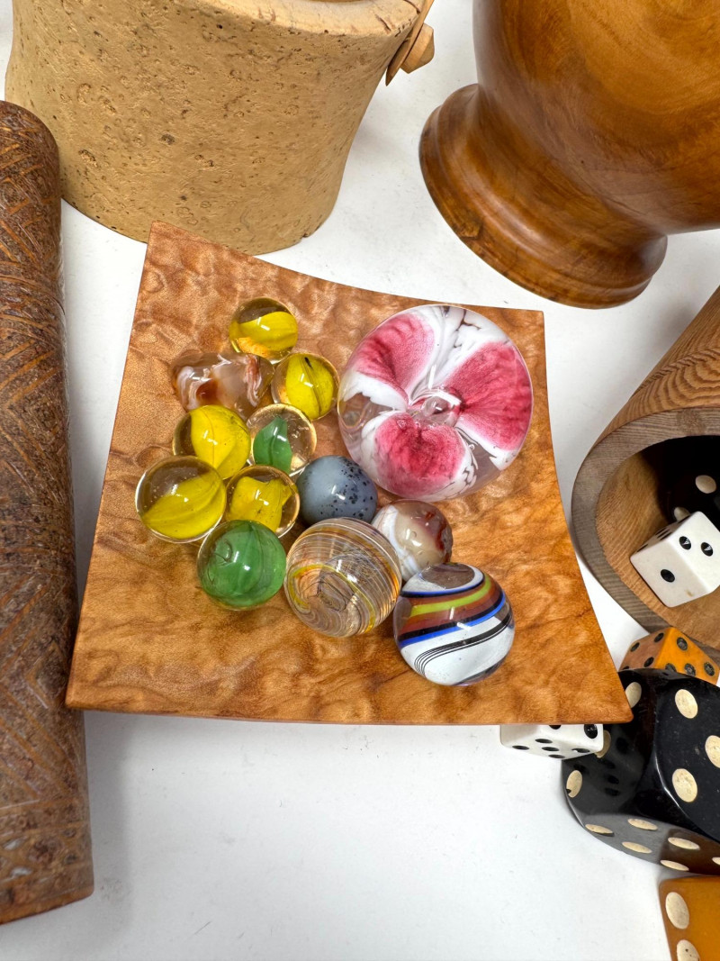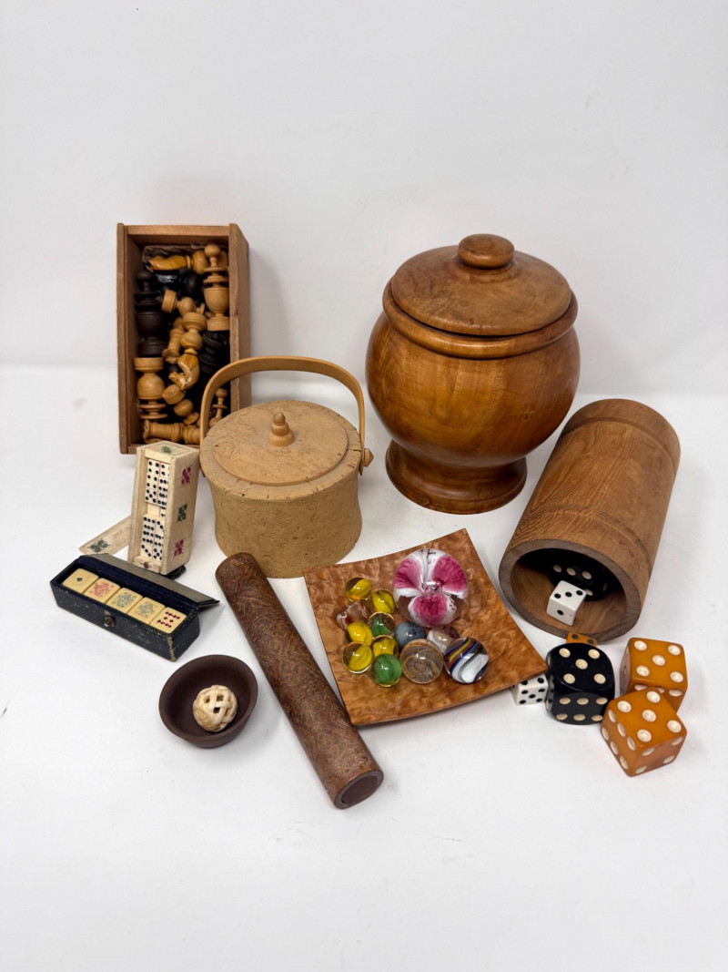 Lot # 129 - Vintage Game & Trinket Set – Dice, Marbles, Wood & Bone Vessels +
