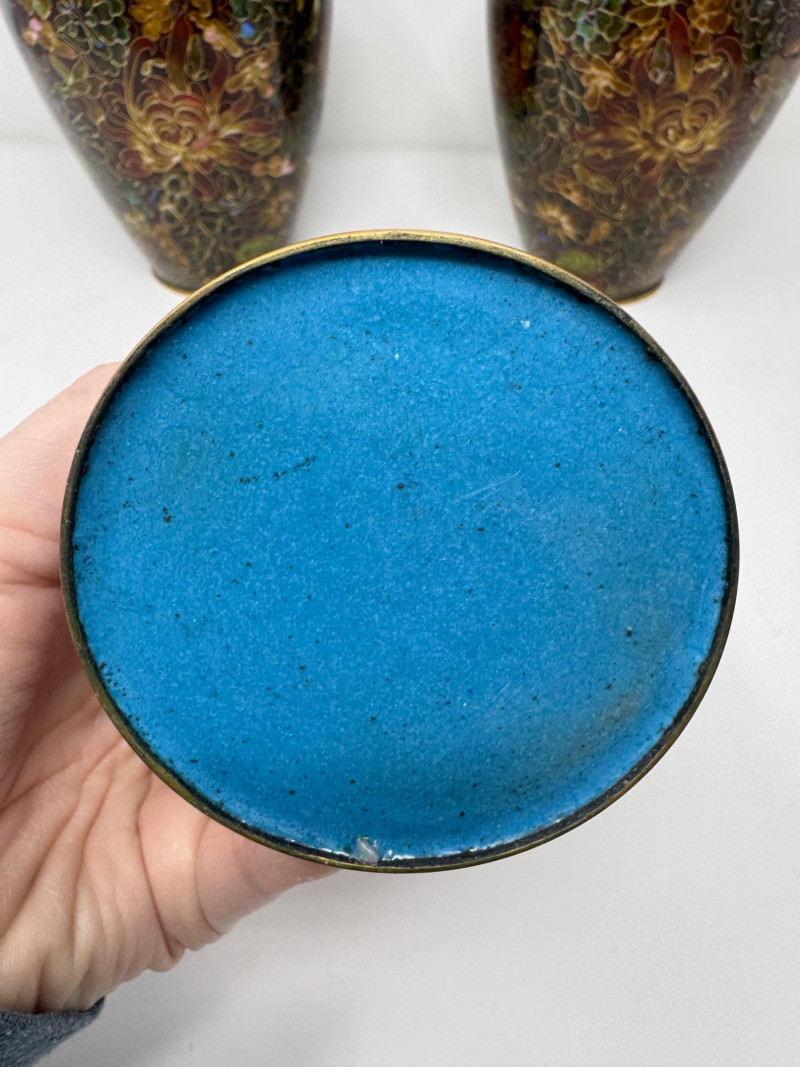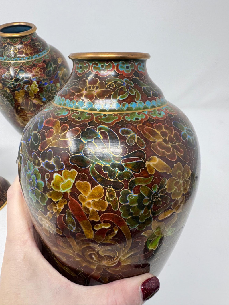 Antique Cloisonné Vase Trio – Rich Multicolor Enamel Design.