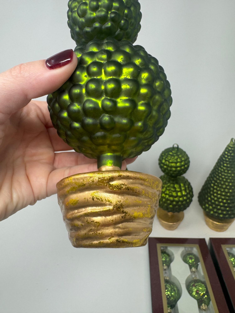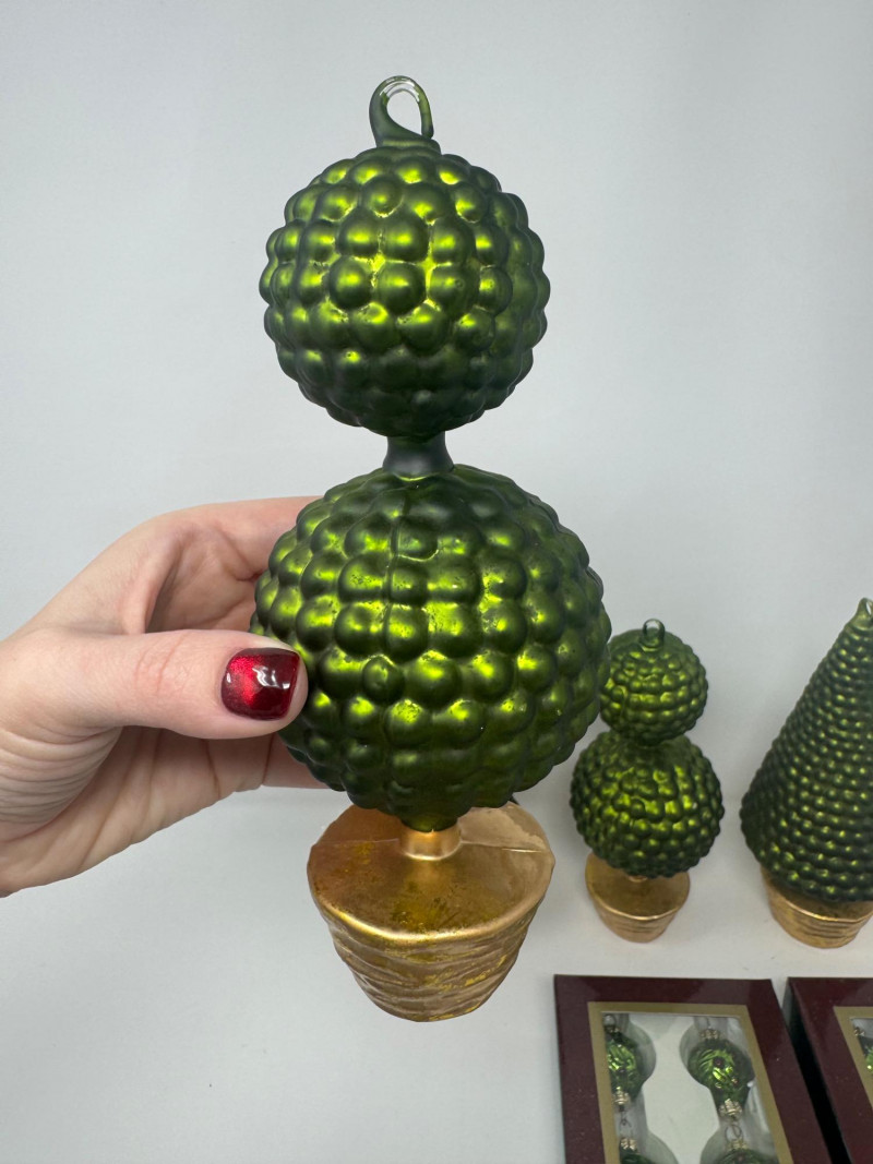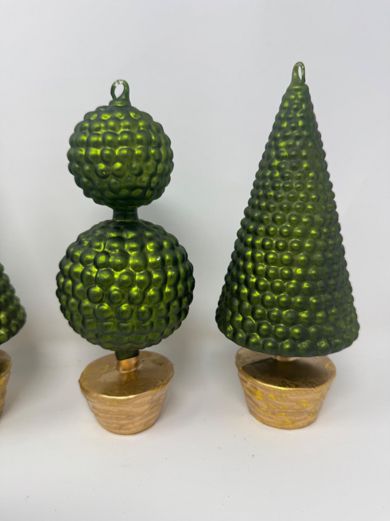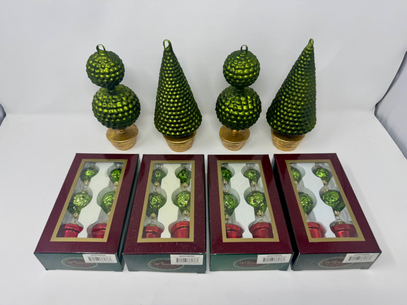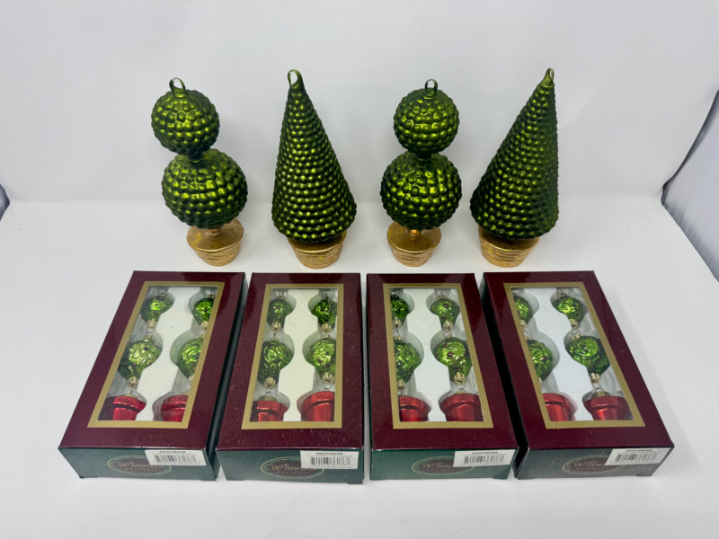 Set of 4 Blown Glass Trees & 8 Winward Topiary Ornaments – Green/Gold.