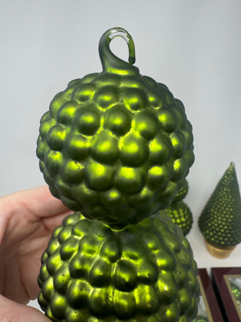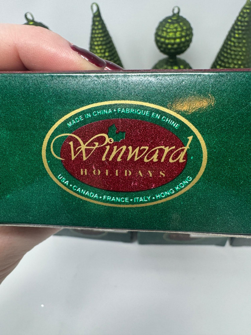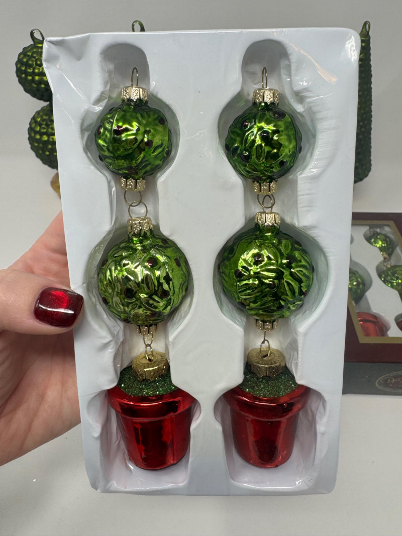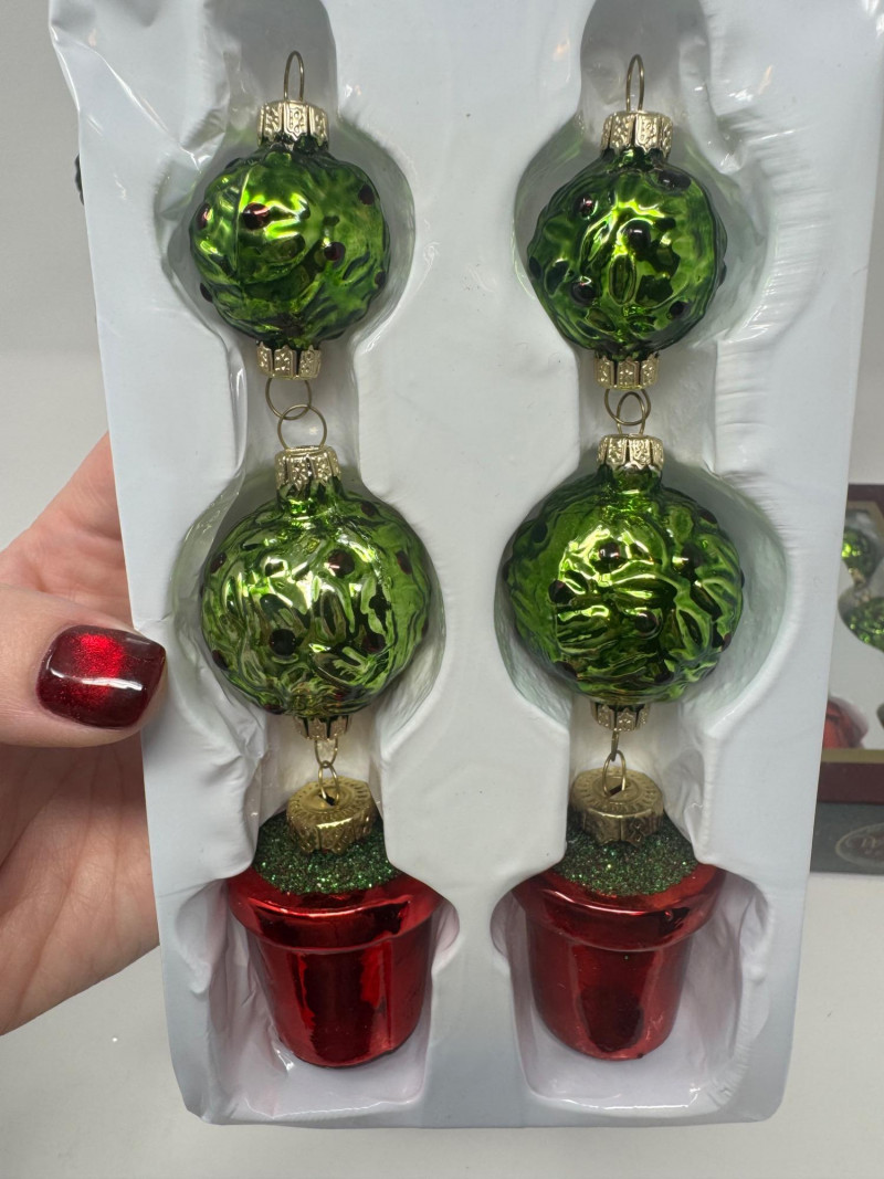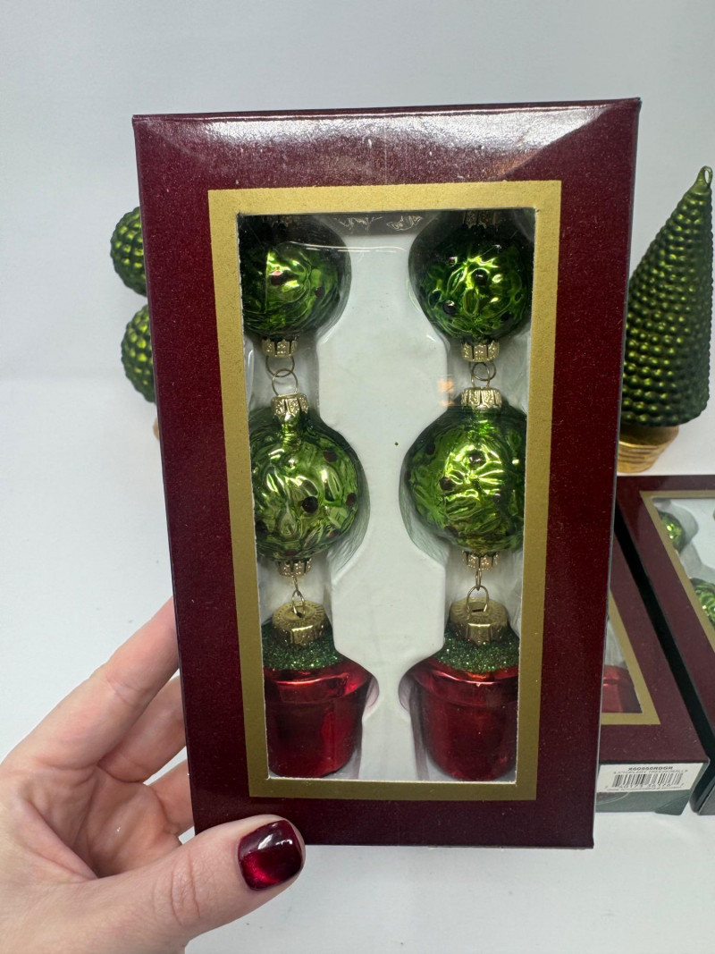 Set of 4 Blown Glass Trees & 8 Winward Topiary Ornaments – Green/Gold.