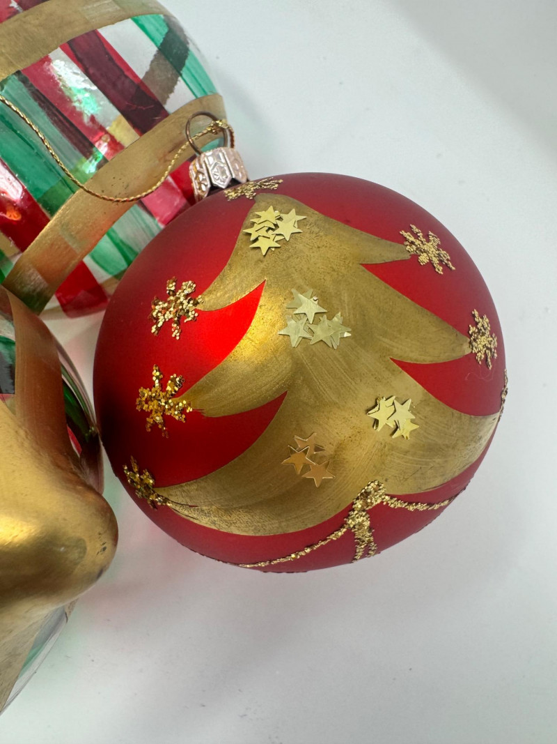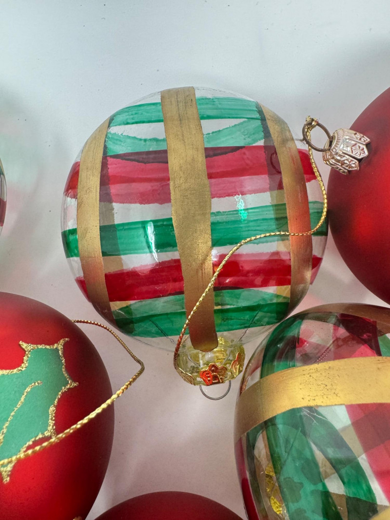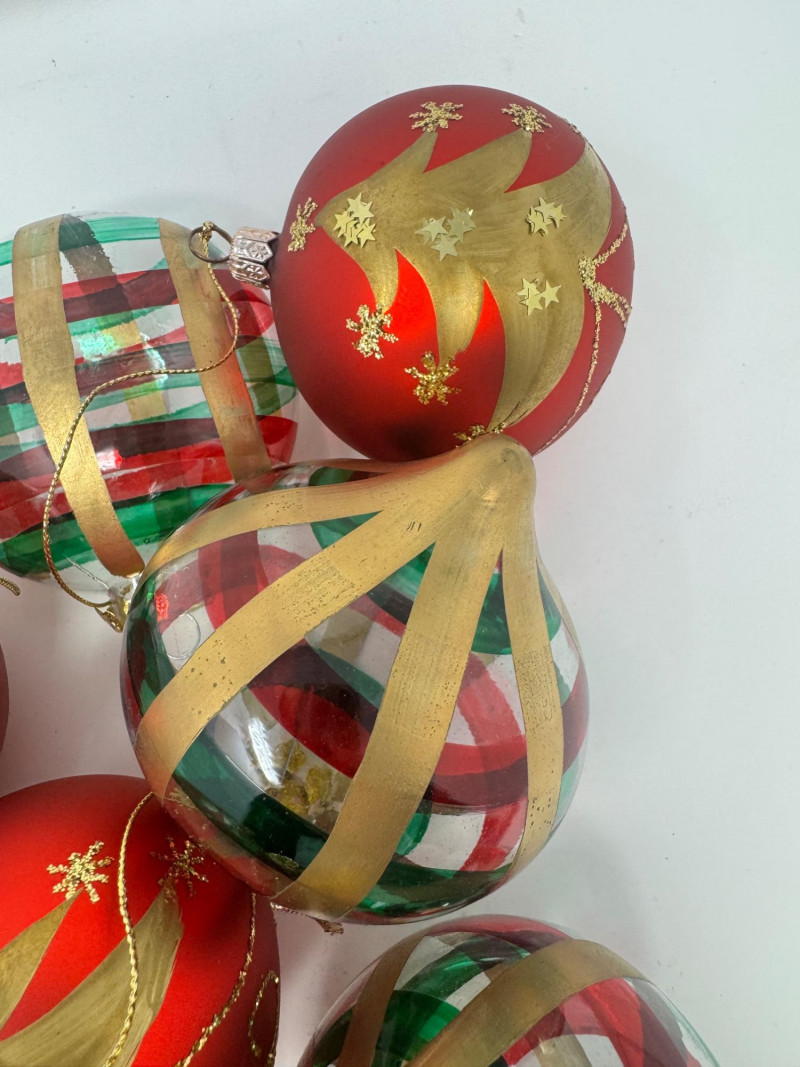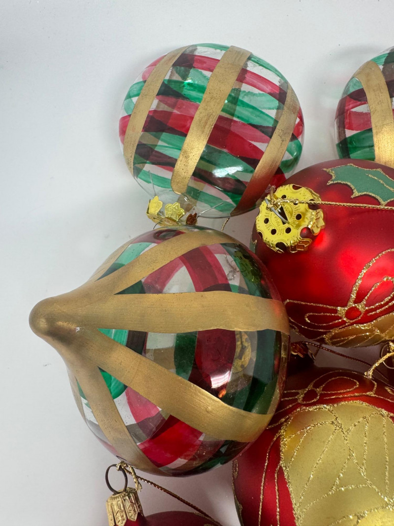 Lot # 2 - Set of 11 Red & Gold Glass Ornaments – Striped & Holiday Designs