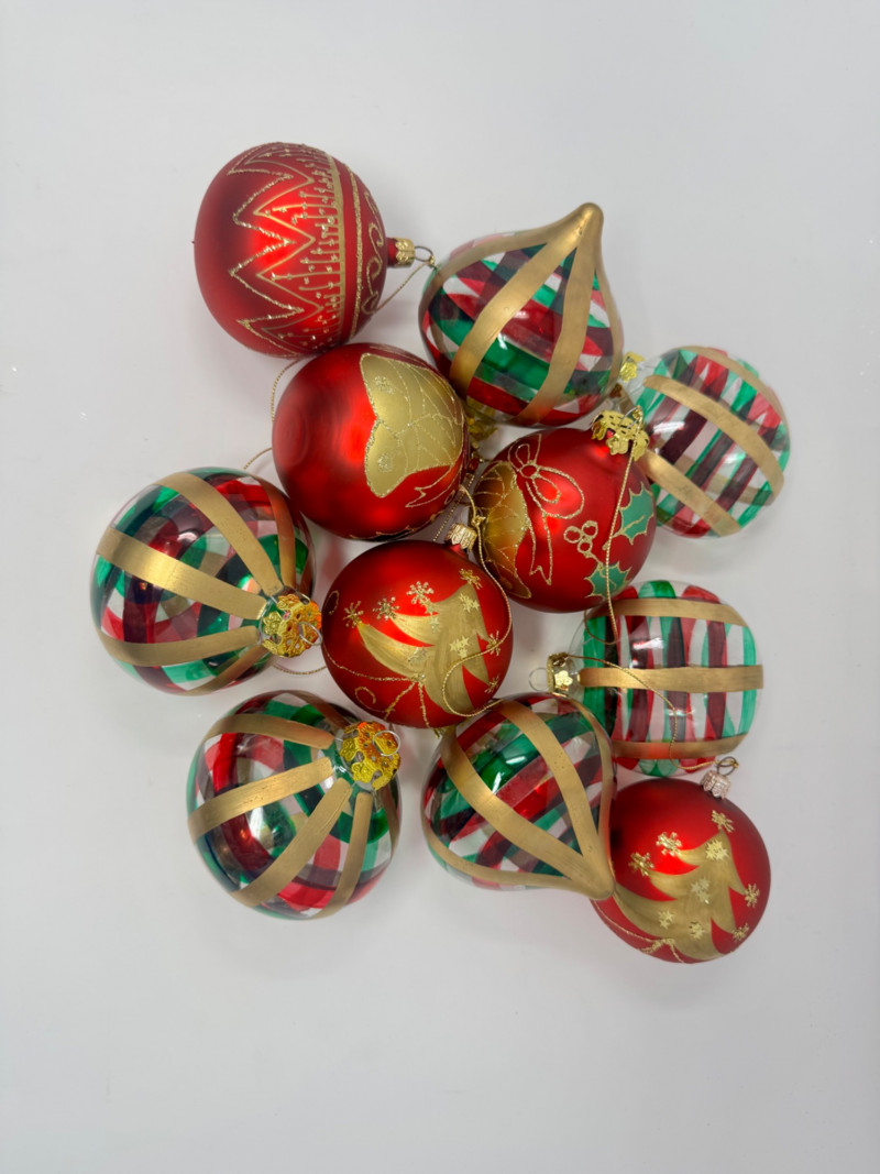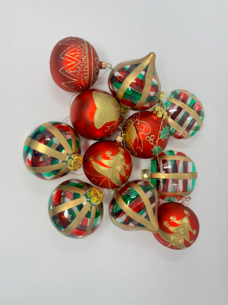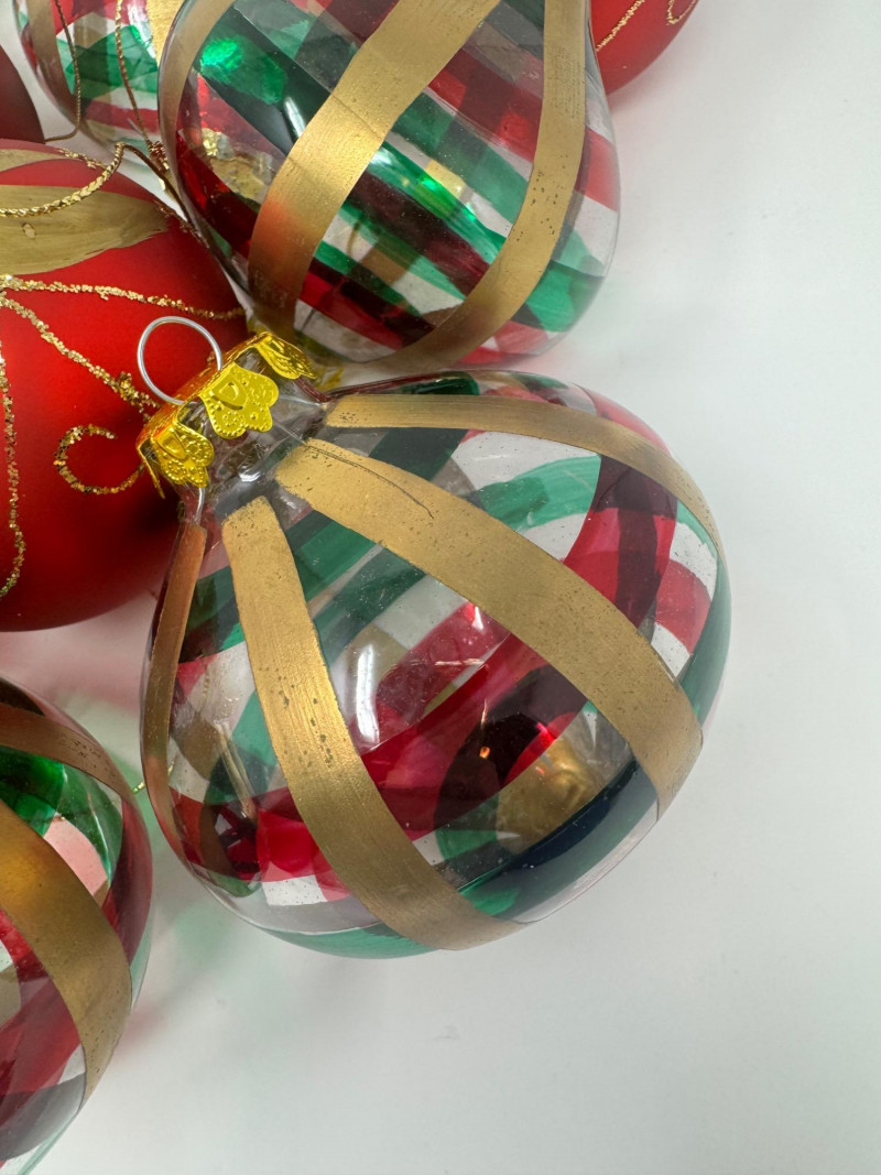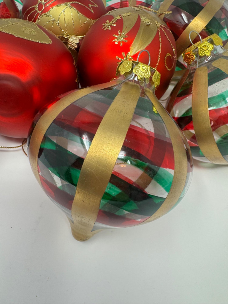 Set of 11 Red & Gold Glass Ornaments – Striped & Holiday Designs.