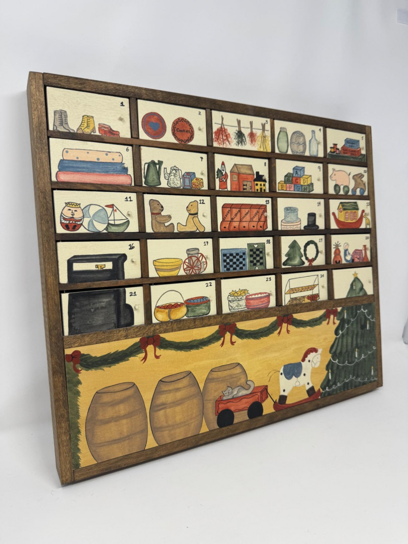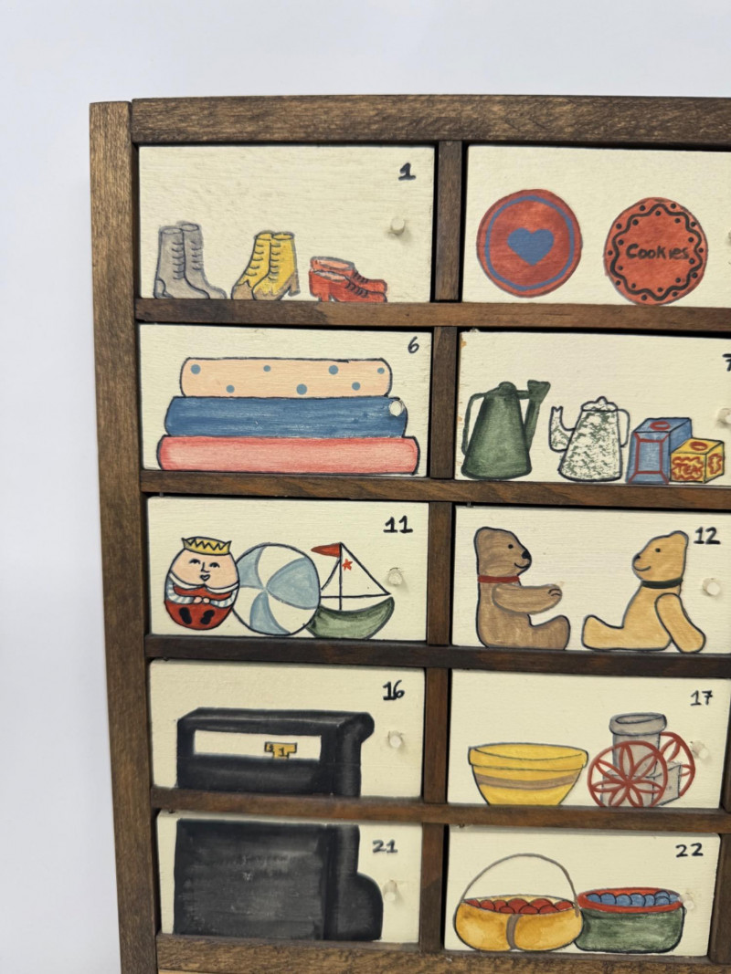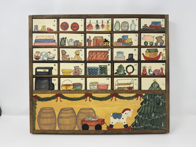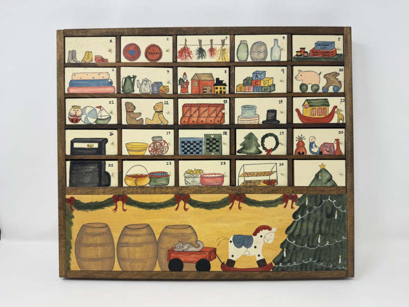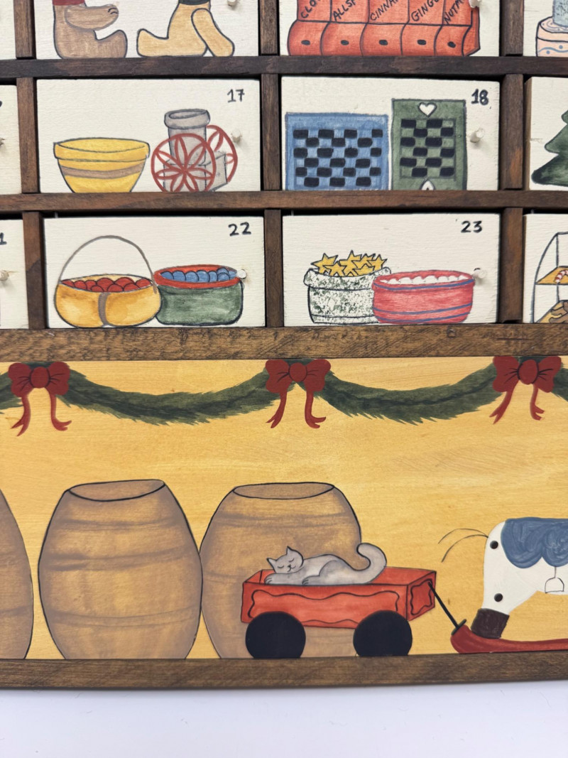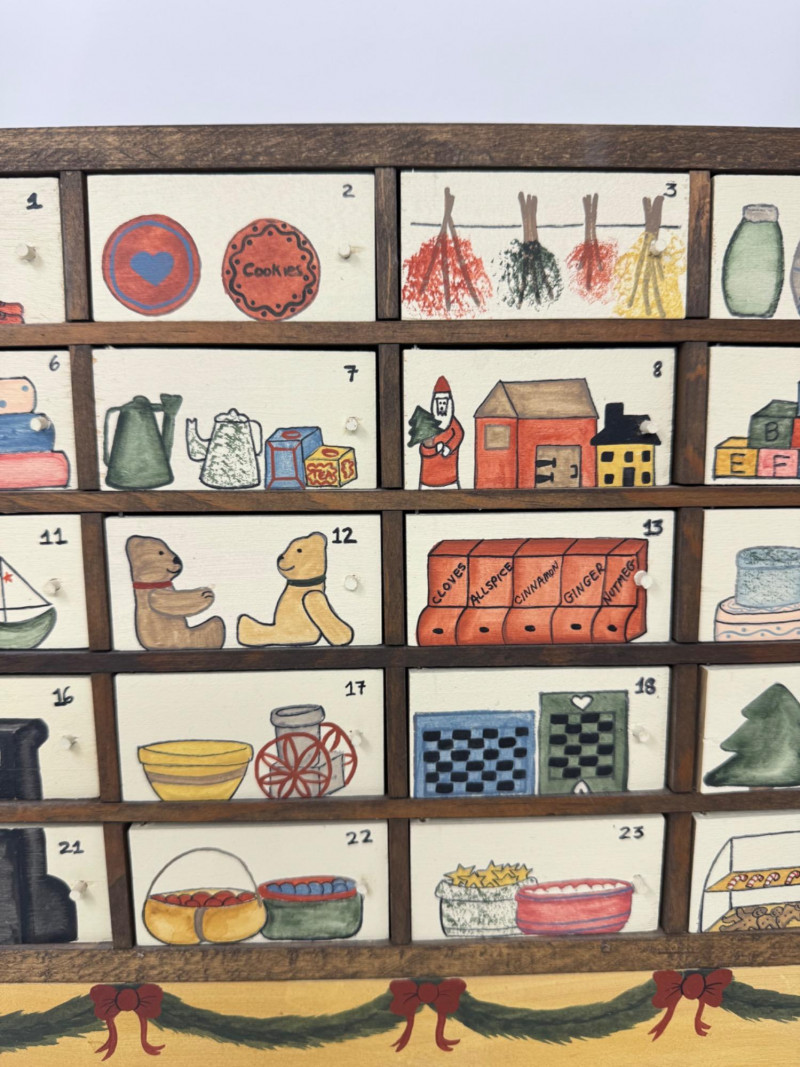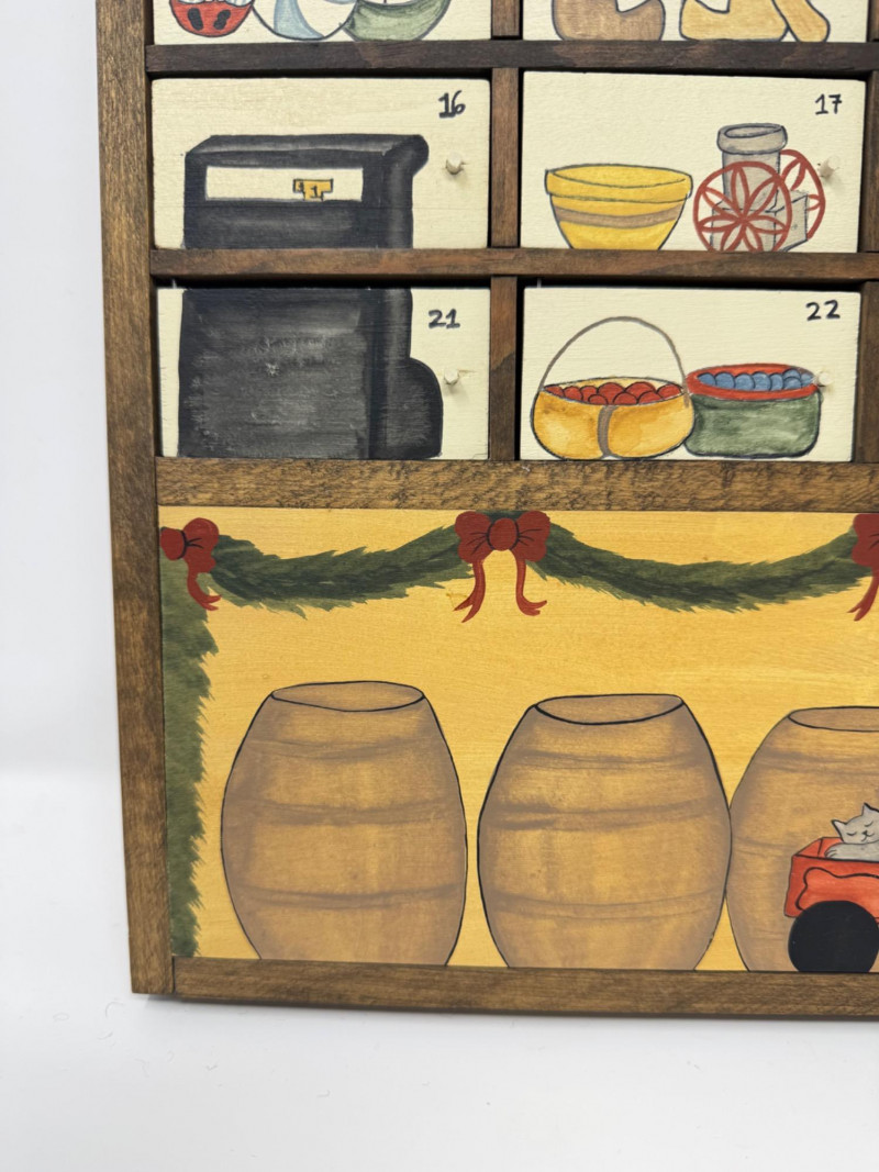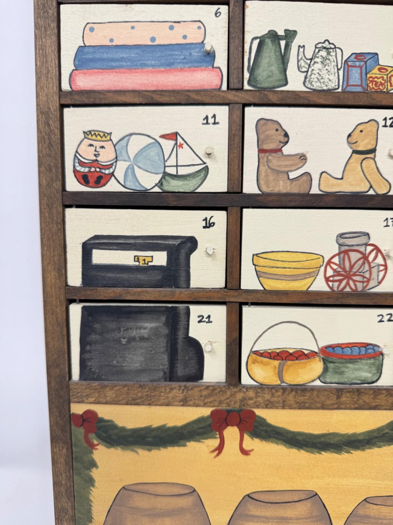 Lot # 7 - Hand-Painted Wood Advent Calendar – 25 Drawer Wall Hanging