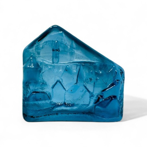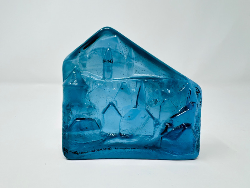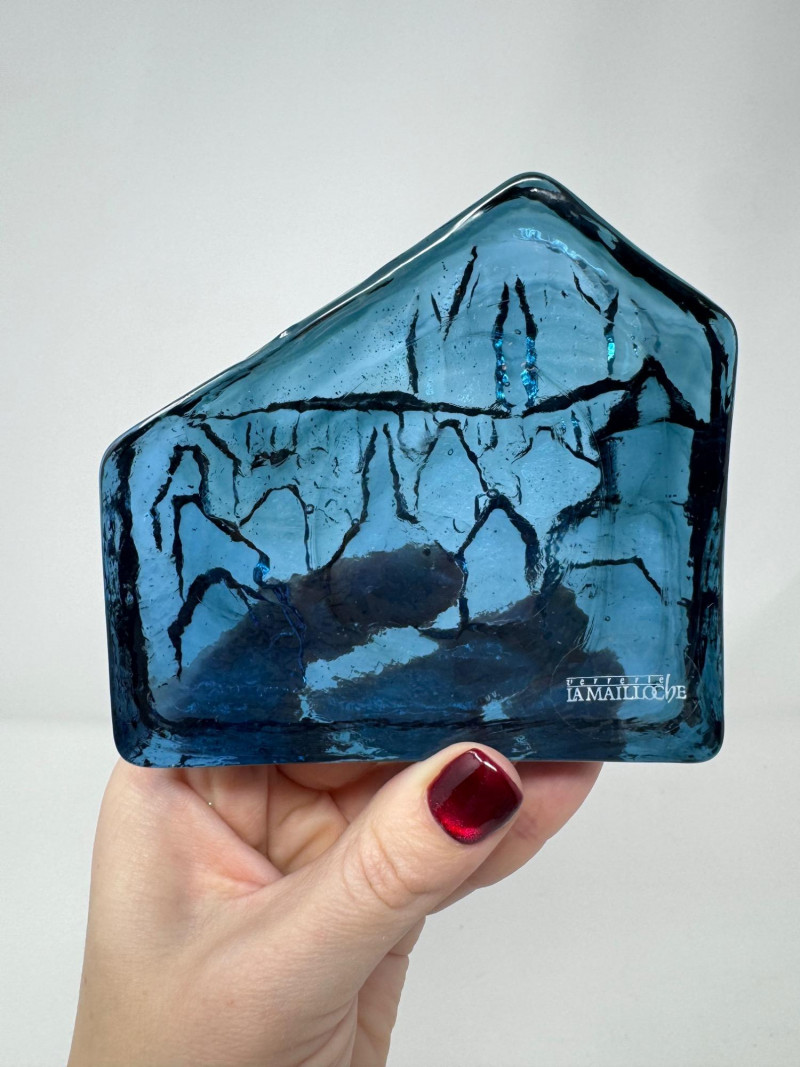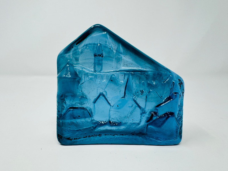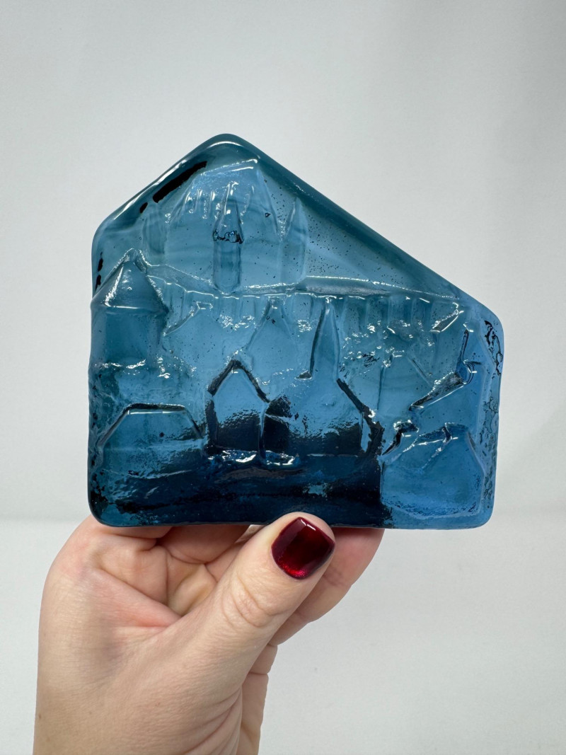 Verrerie La Mailloche Blue Art Glass Paperweight Town Scene.
