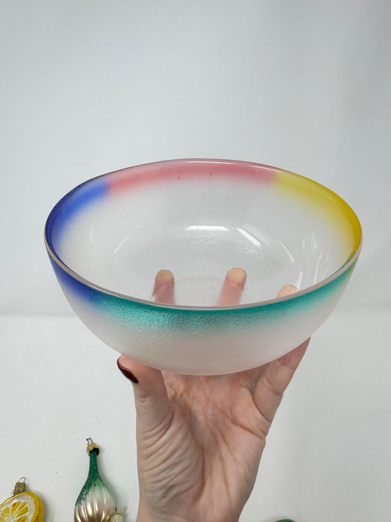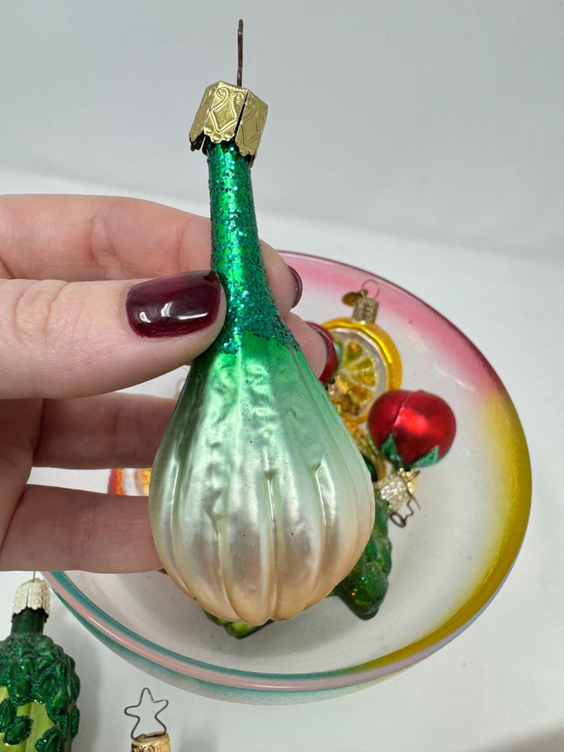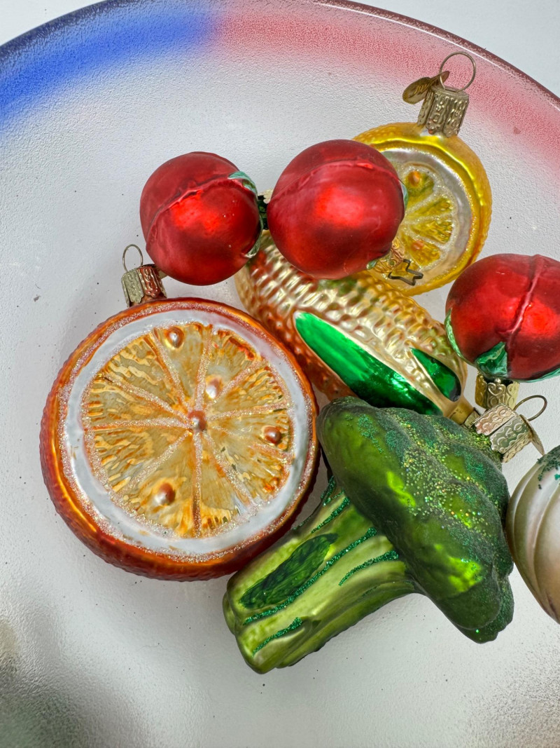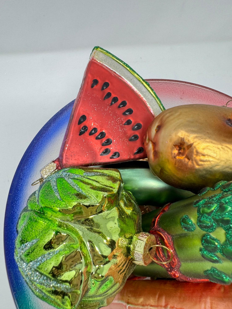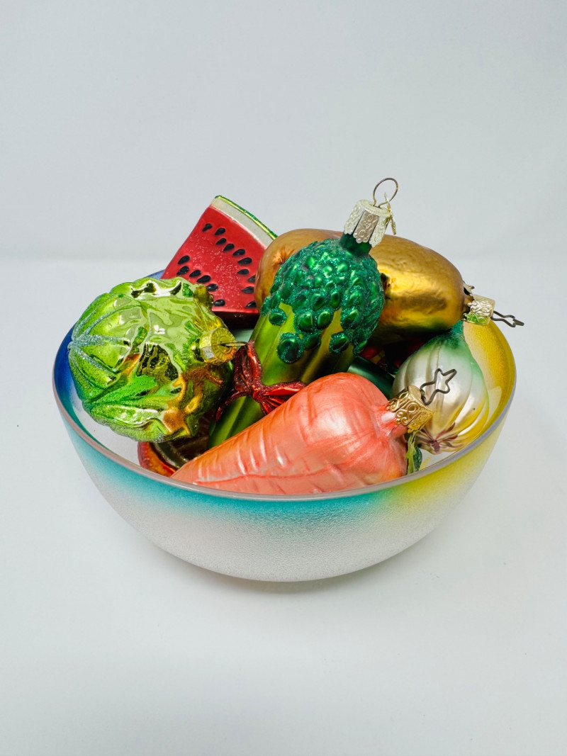 Glass Bowl w/ Rainbow Trim + 14 Blown Glass Fruit & Veggie Ornaments.