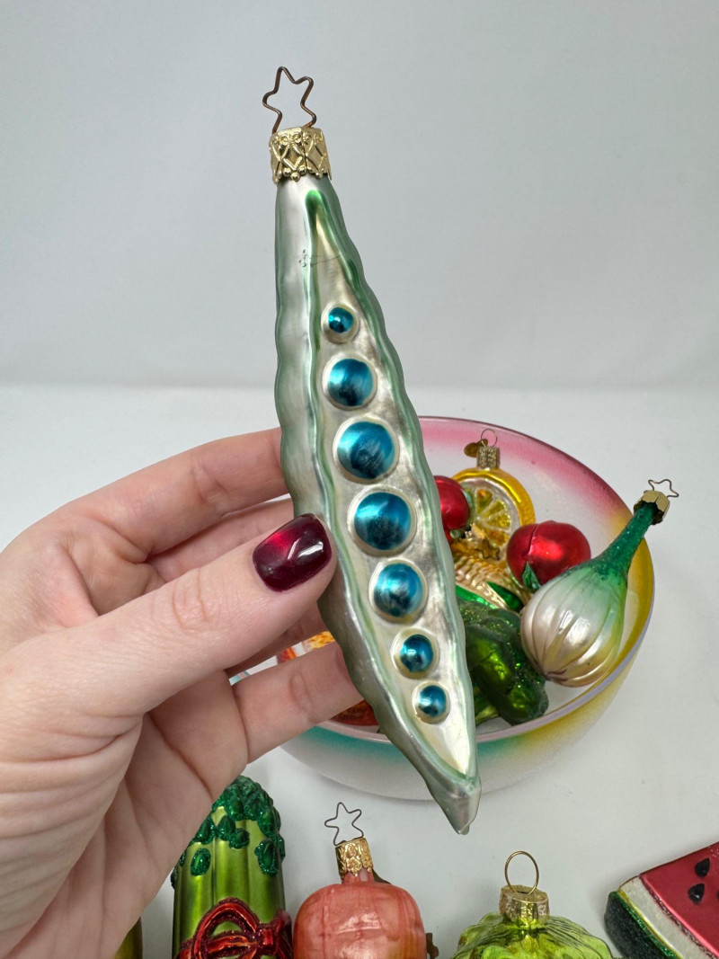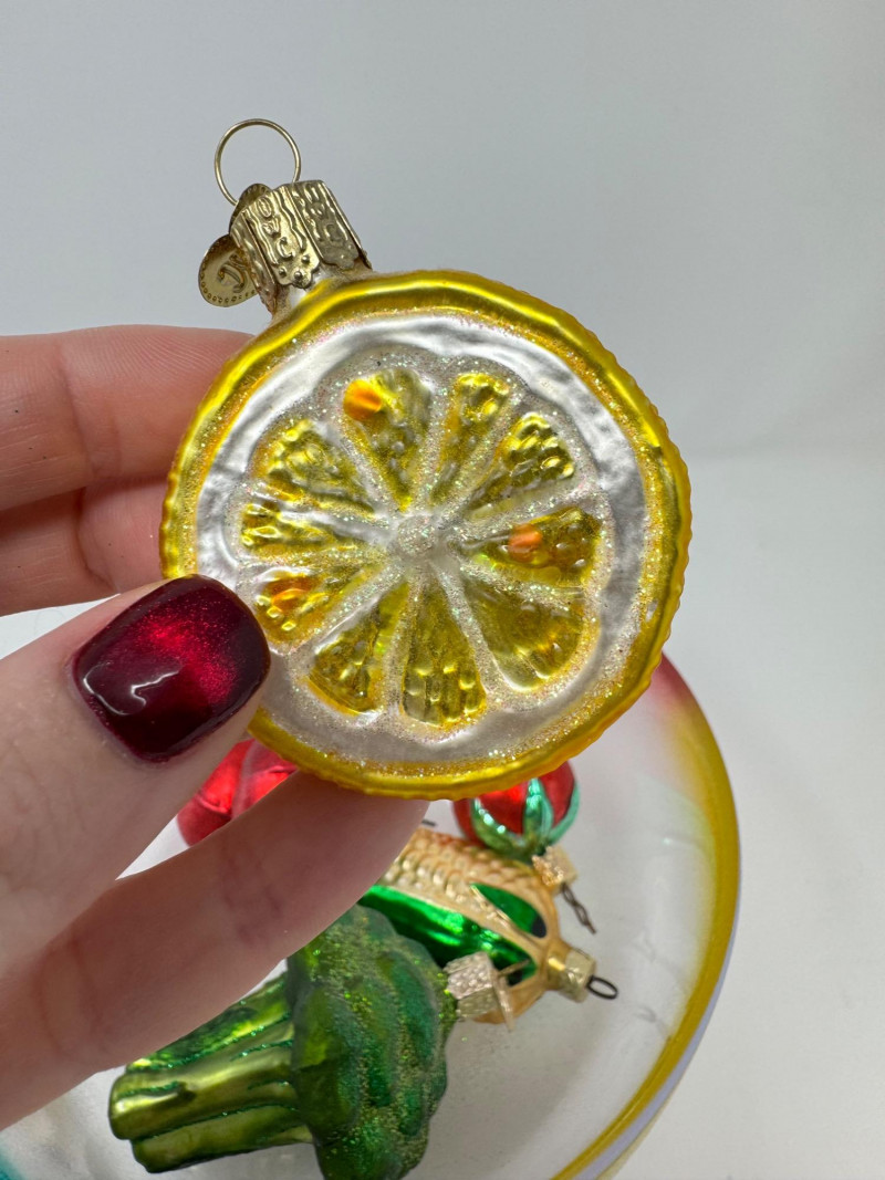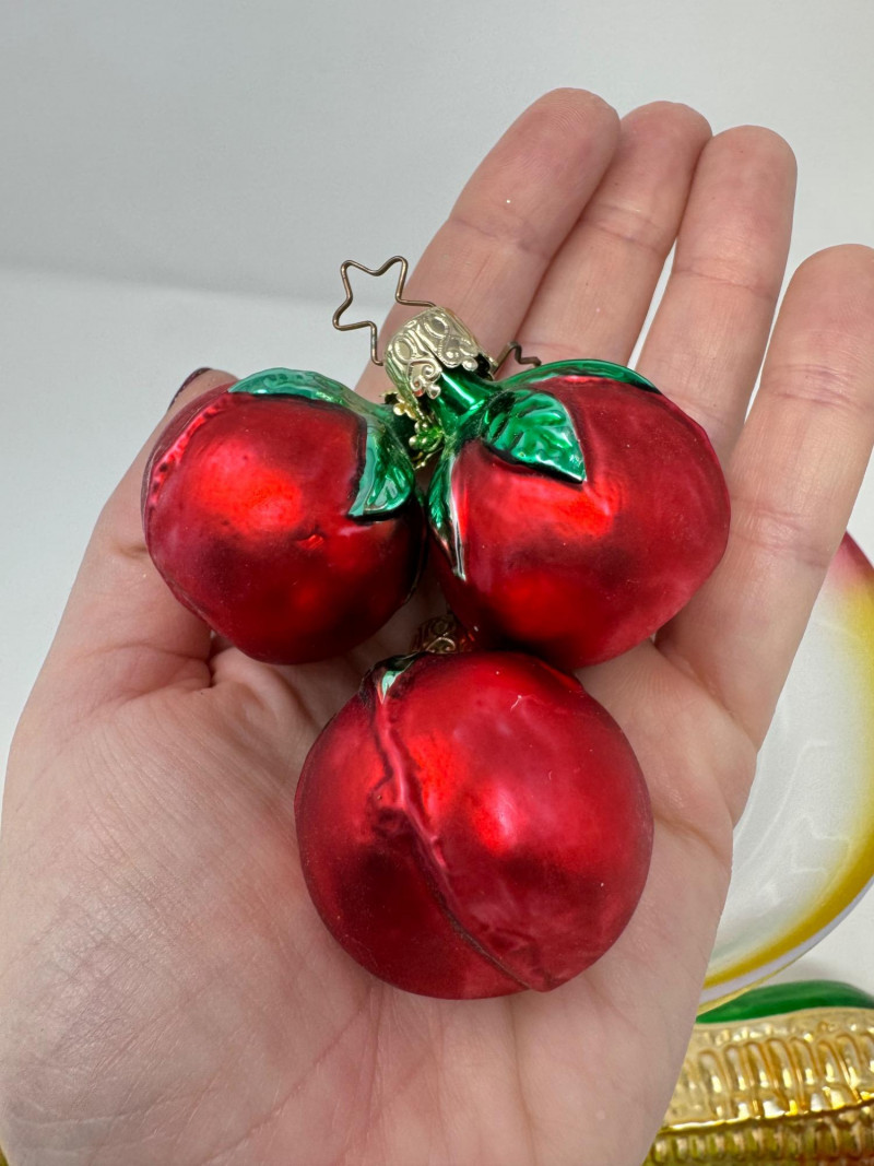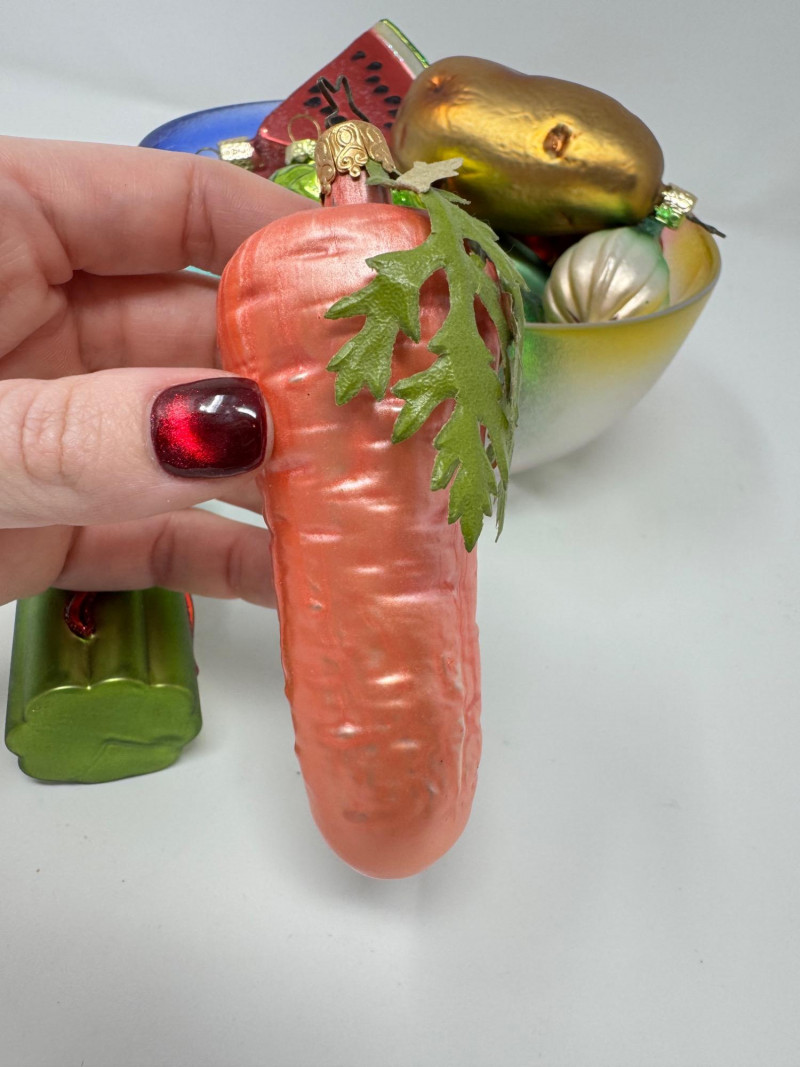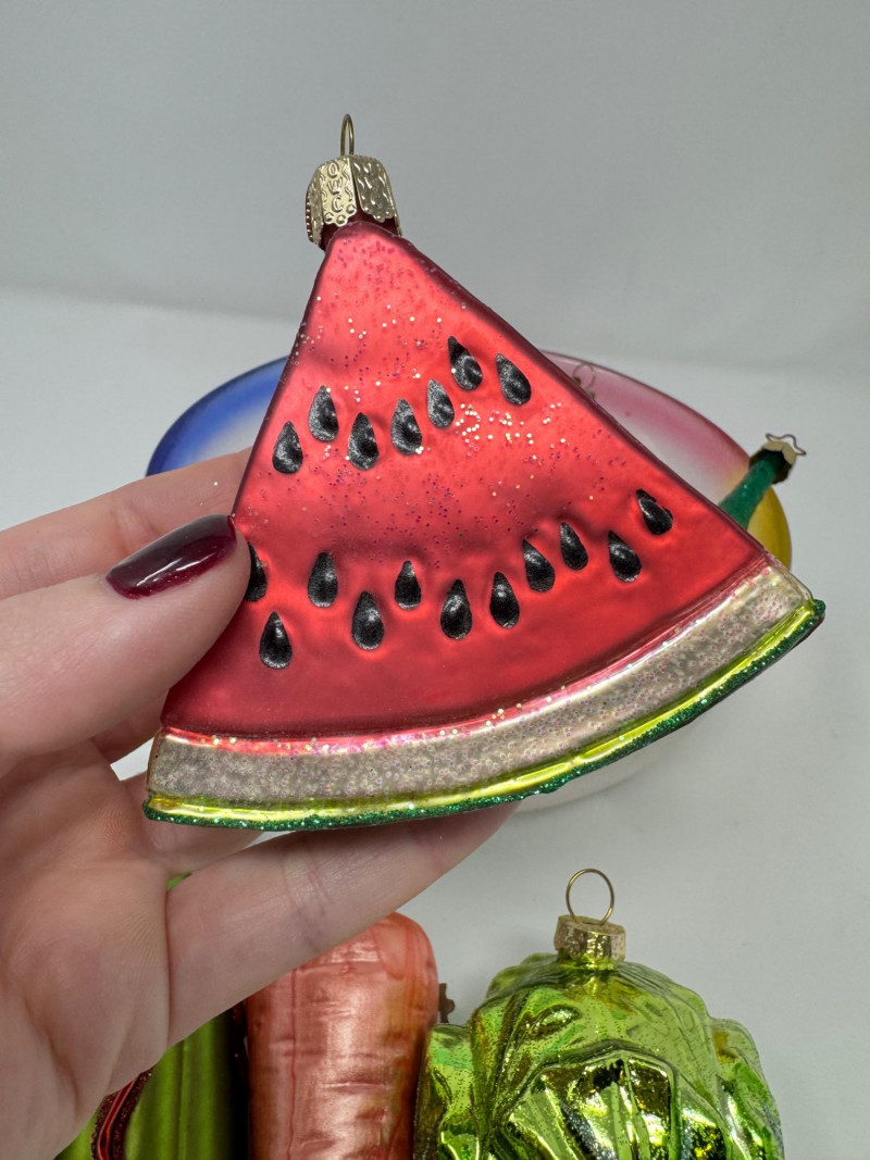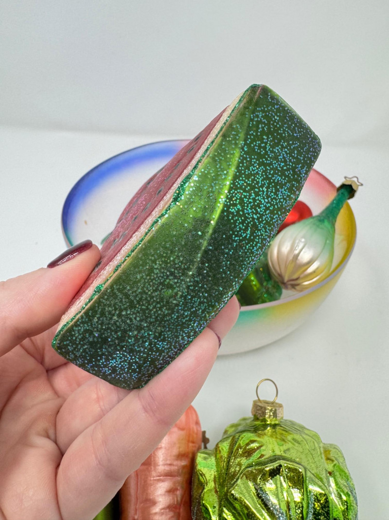 Glass Bowl w/ Rainbow Trim + 14 Blown Glass Fruit & Veggie Ornaments.