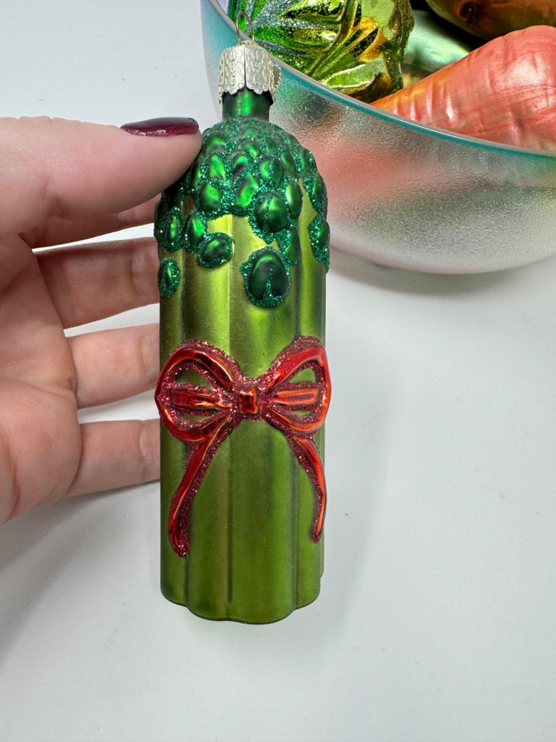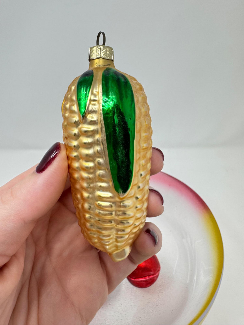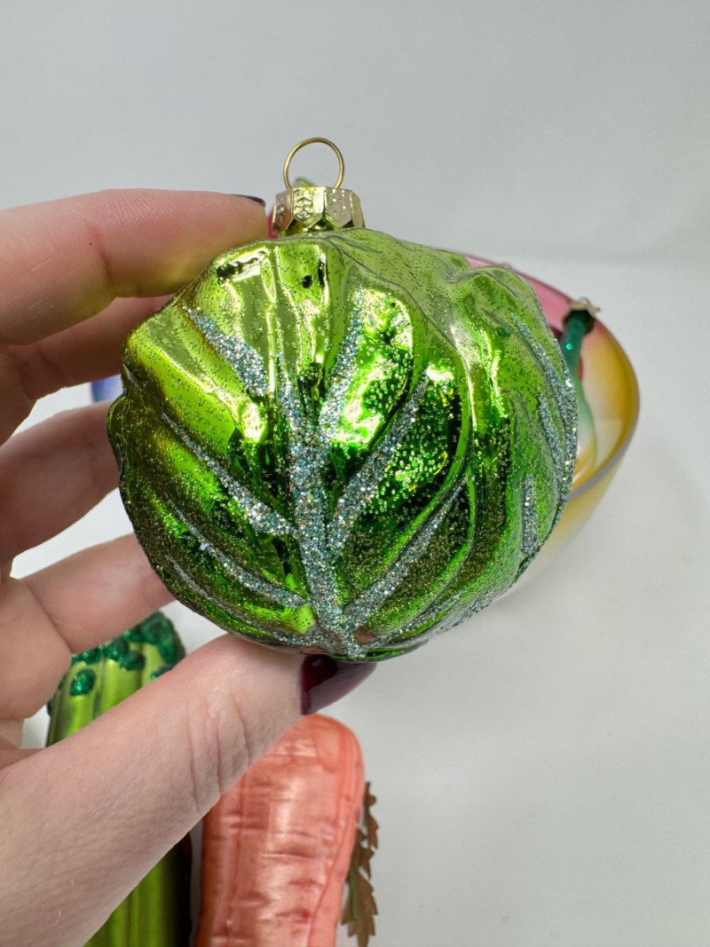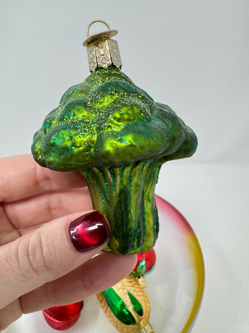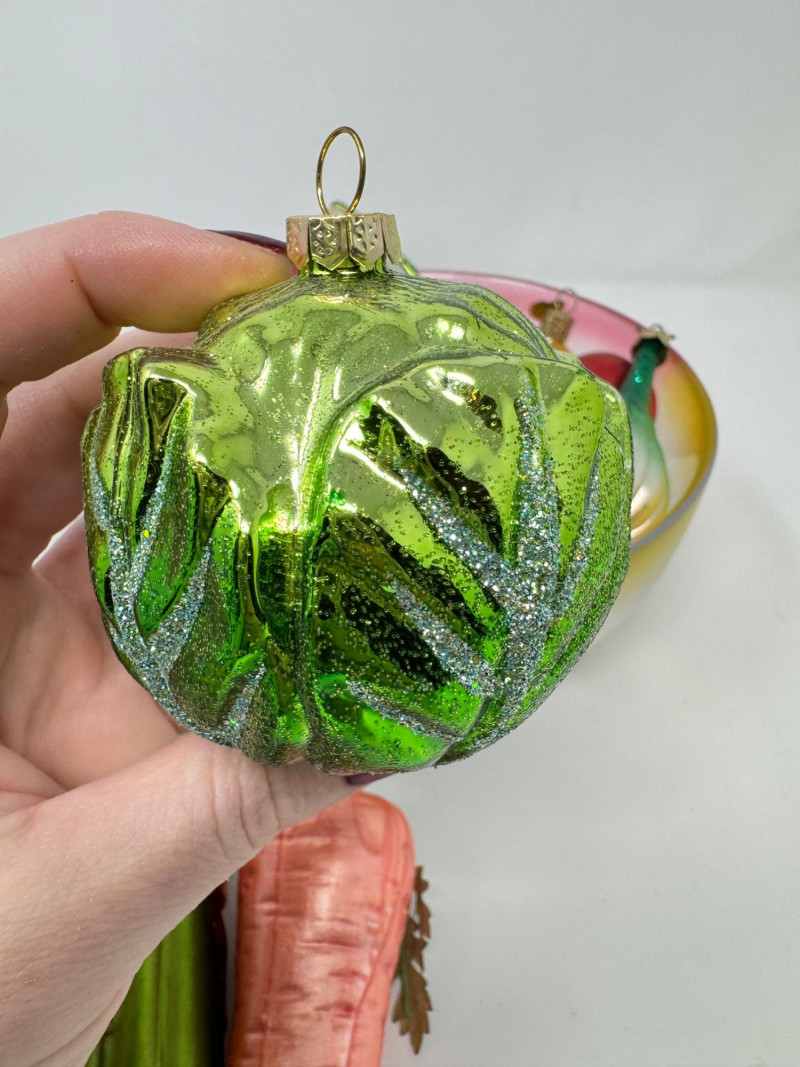 Glass Bowl w/ Rainbow Trim + 14 Blown Glass Fruit & Veggie Ornaments.
