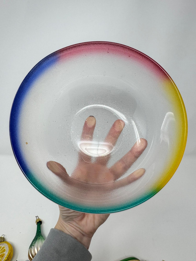 Lot # 27 - Glass Bowl w/ Rainbow Trim + 14 Blown Glass Fruit & Veggie Ornaments