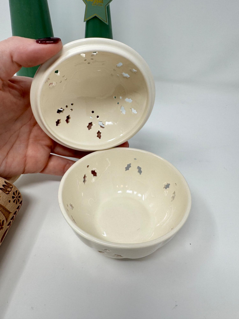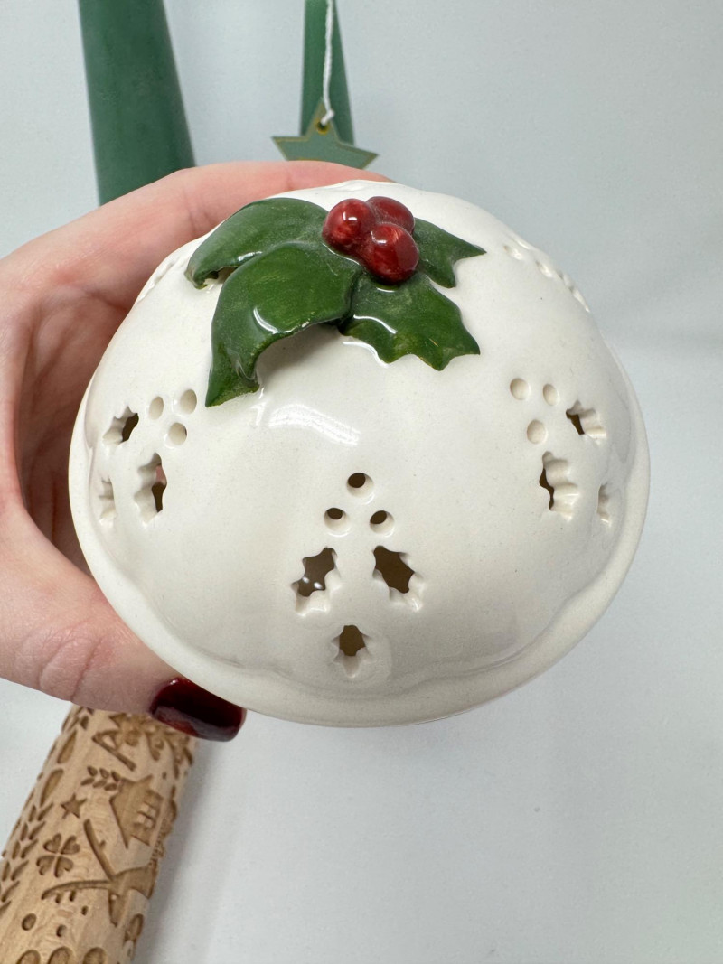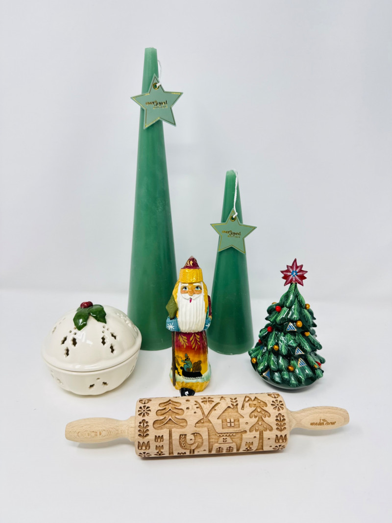 Leeds Pottery Holly Dish, Hand-Carved Russian Figures & Candles.