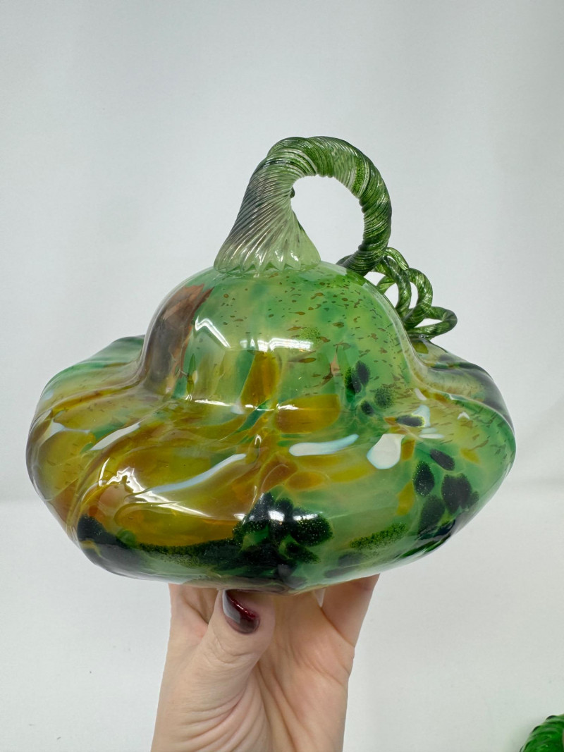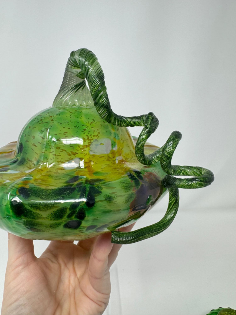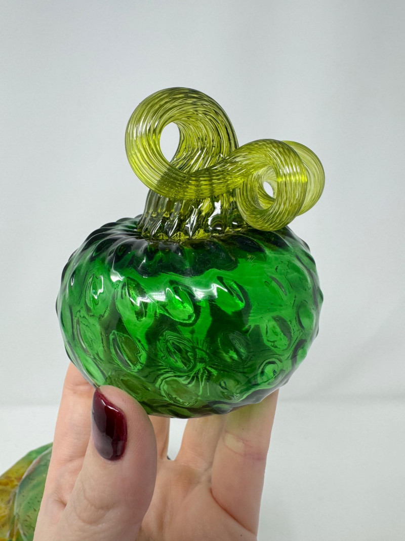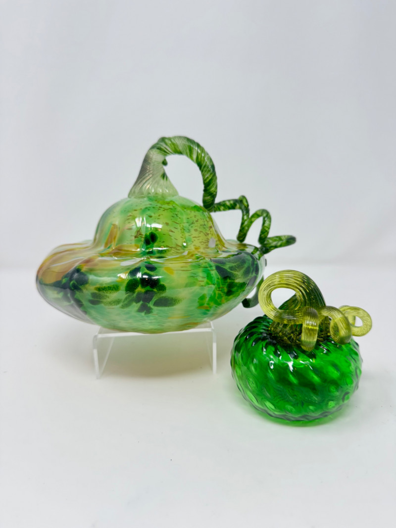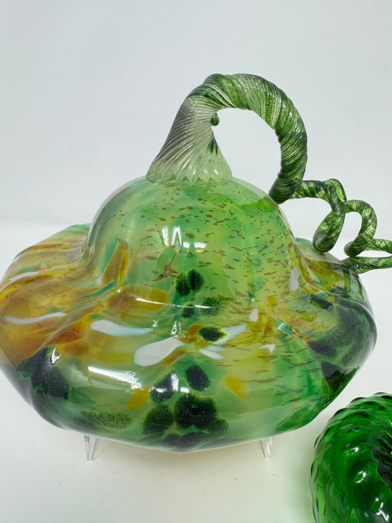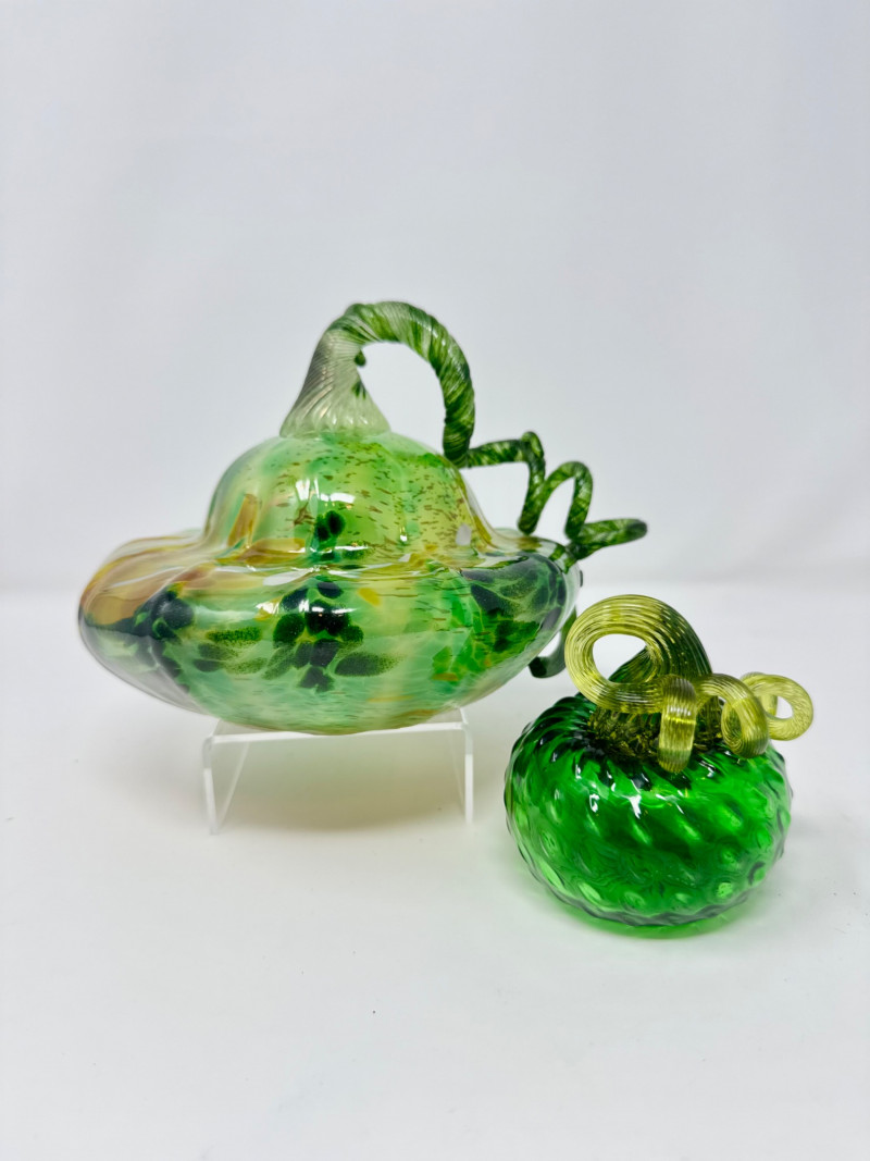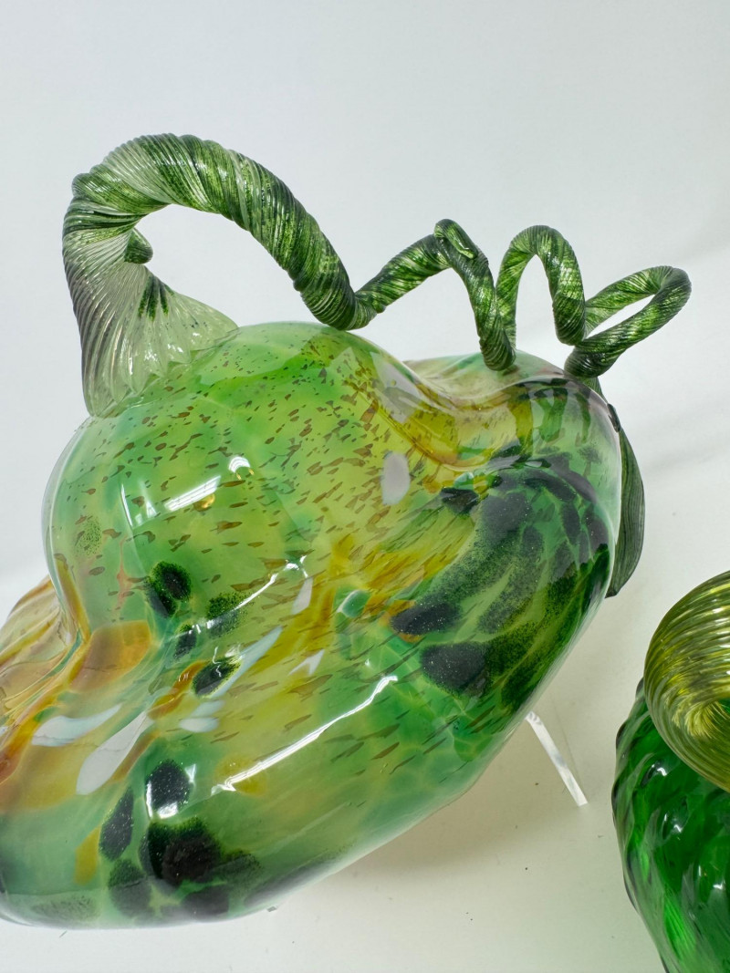 Set of 2 Hand-Blown Green Art Glass Gourds – Swirled Stems.