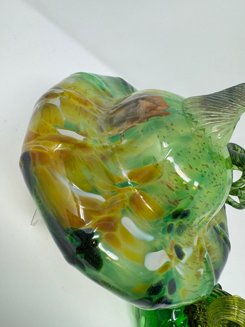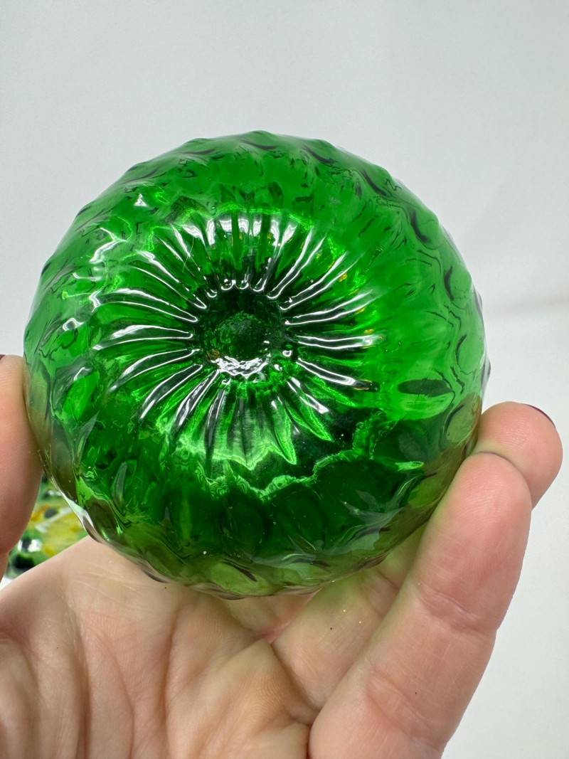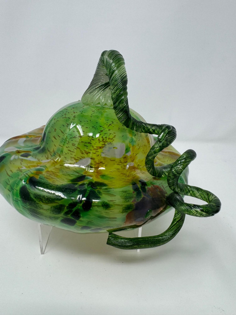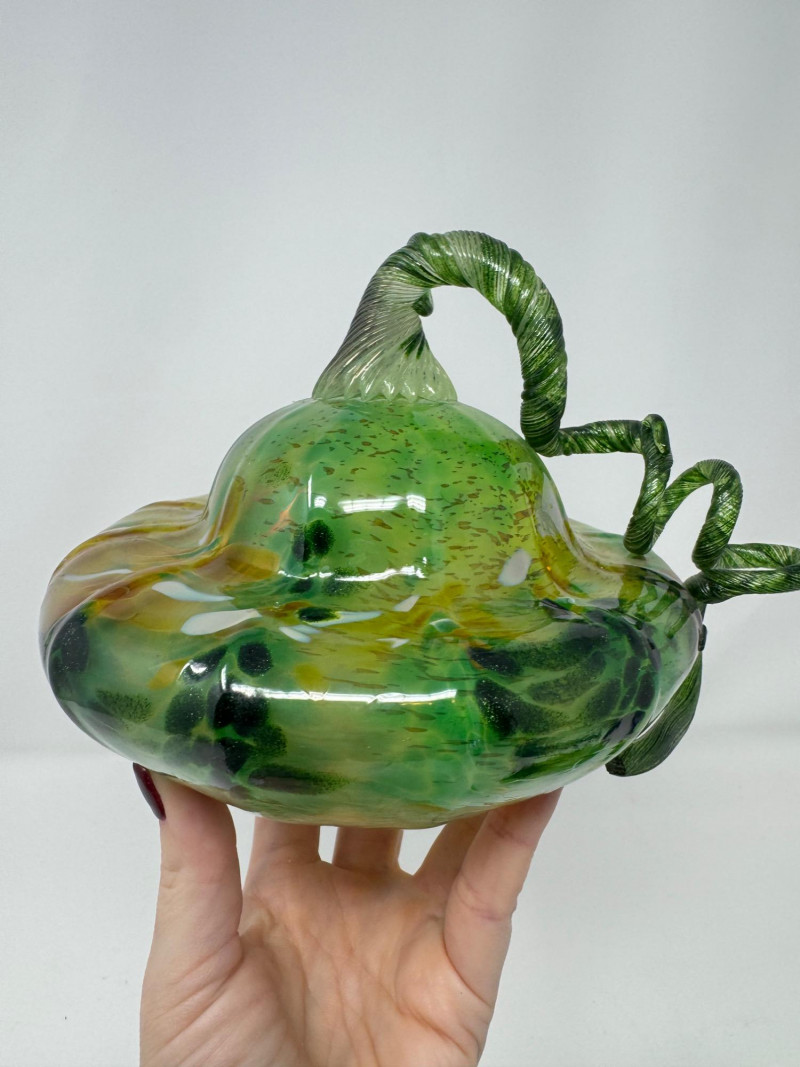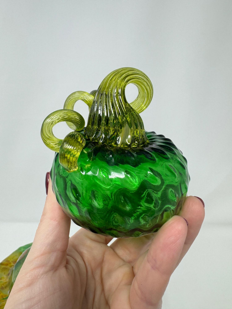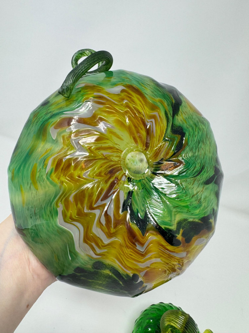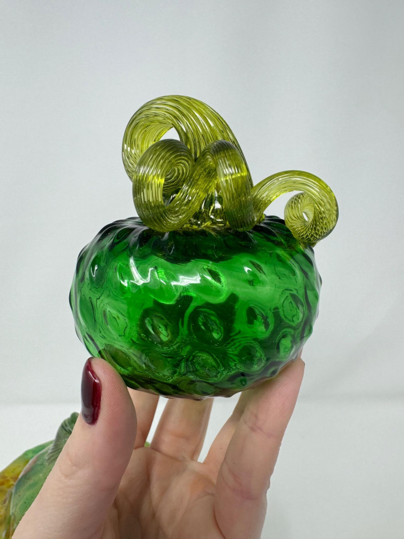 Set of 2 Hand-Blown Green Art Glass Gourds – Swirled Stems.