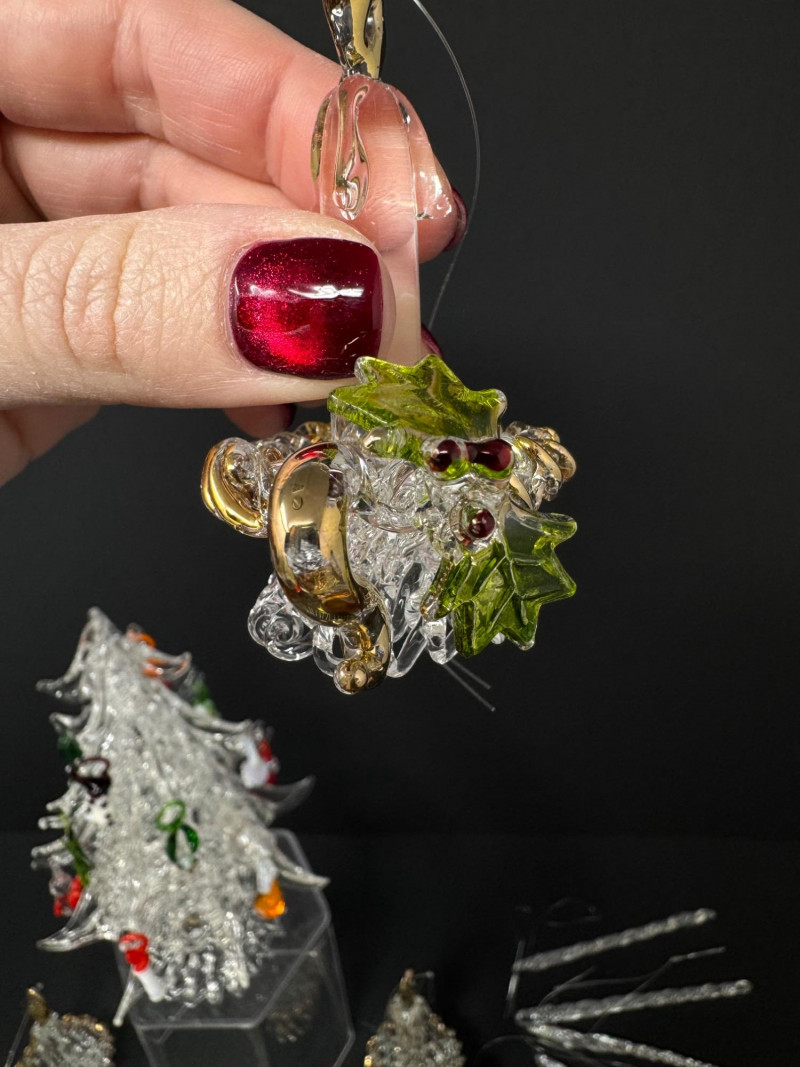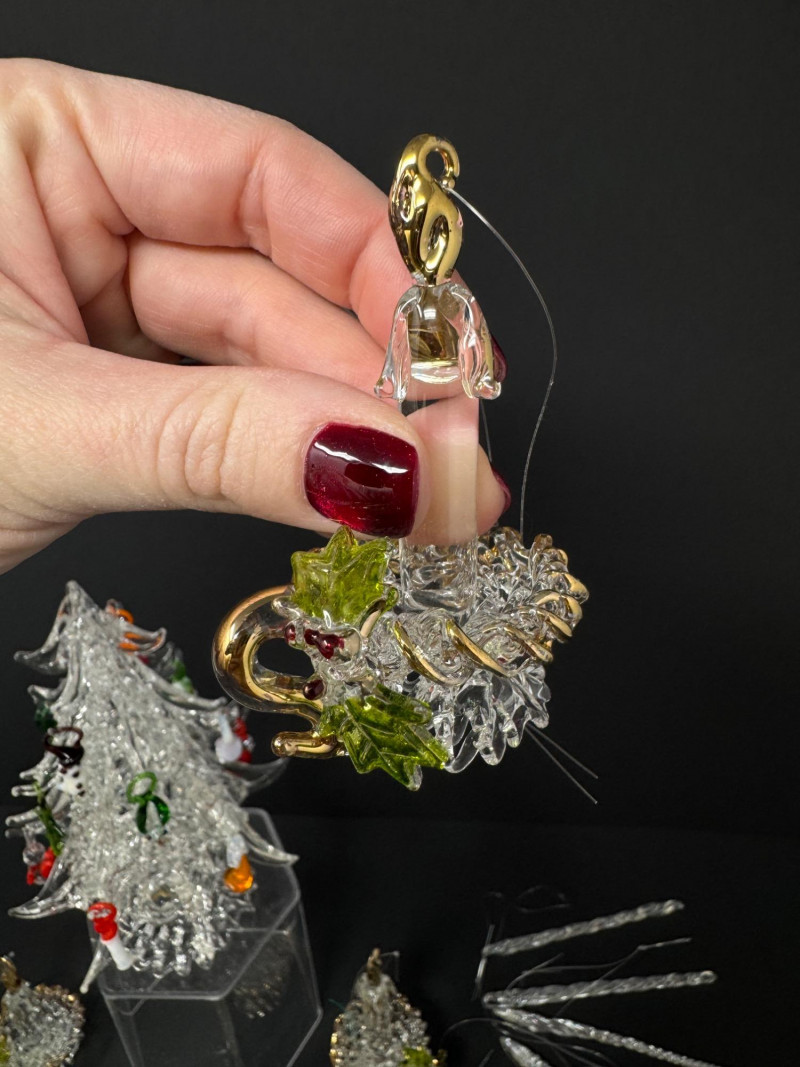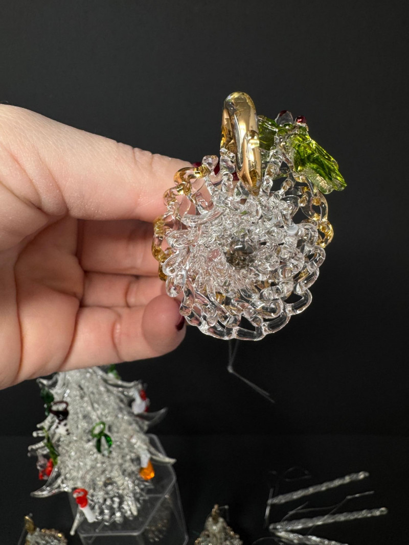 Also includes round blown glass ornaments with gold accents, holly leaves, and ribbon details