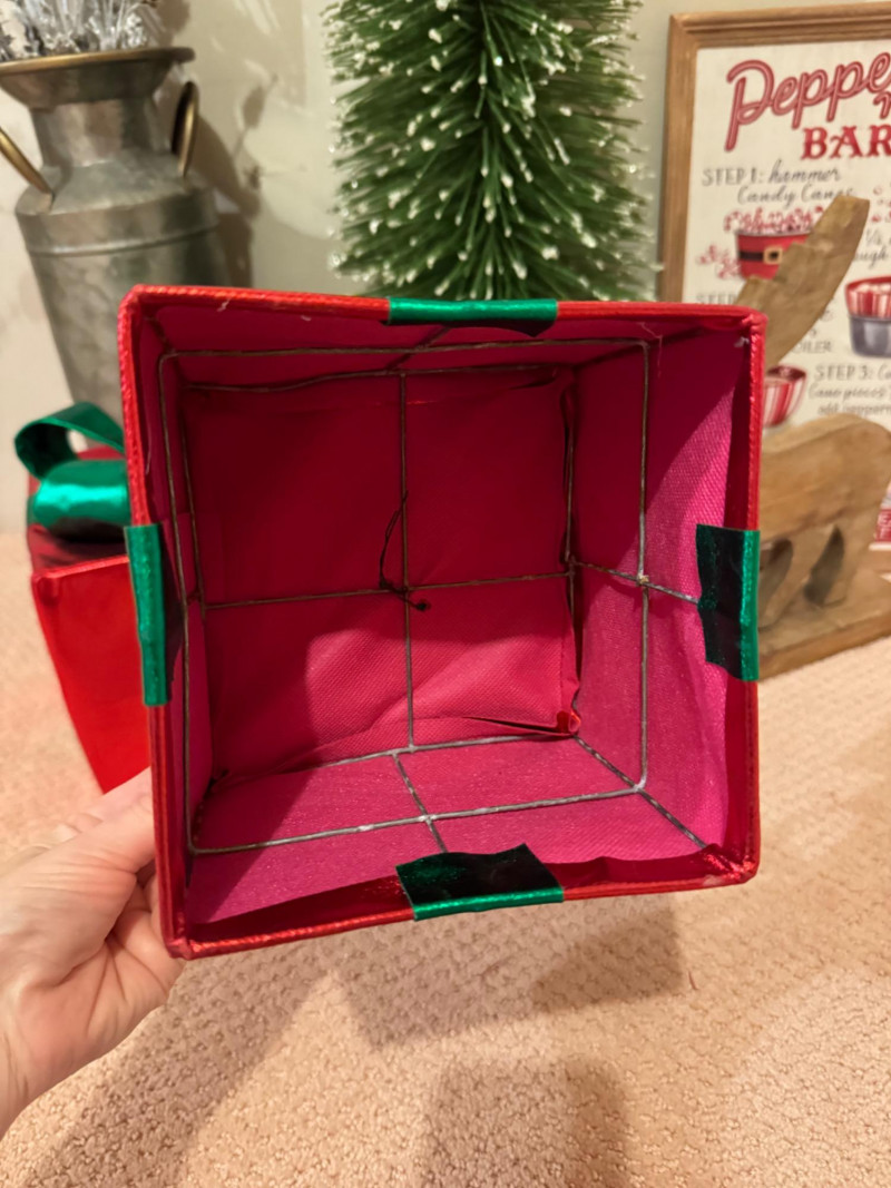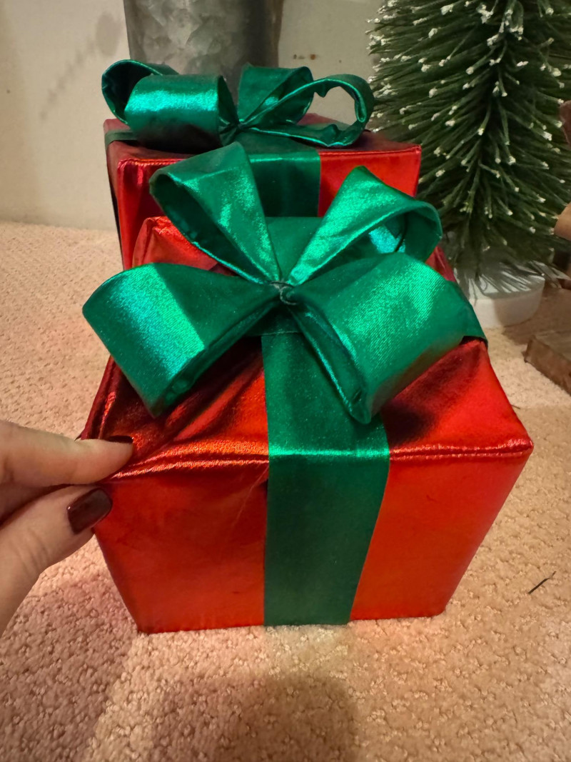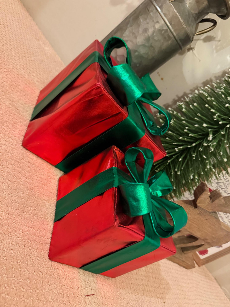 2 Decorative Red Gift Boxes with green satin ribbons (open bases, for stacking/display)