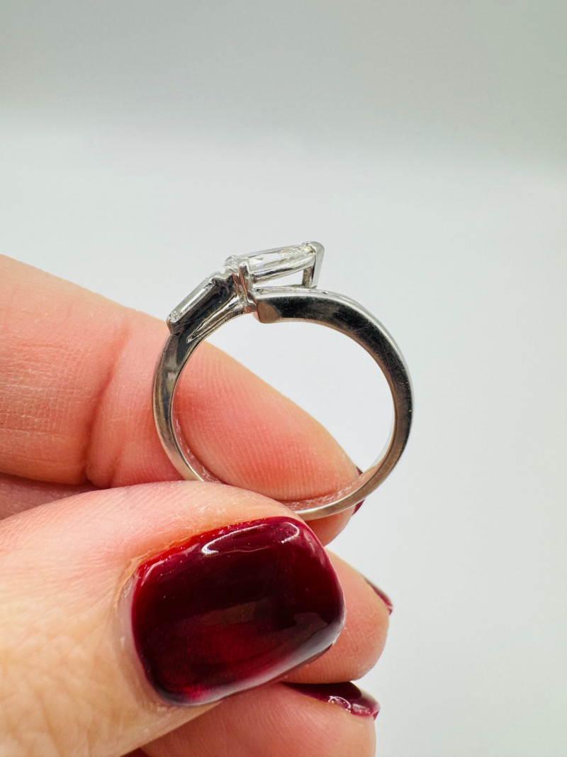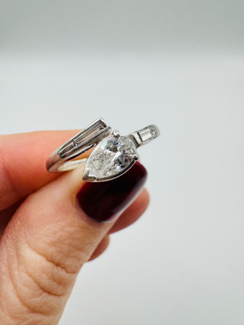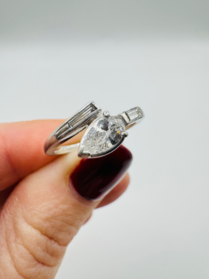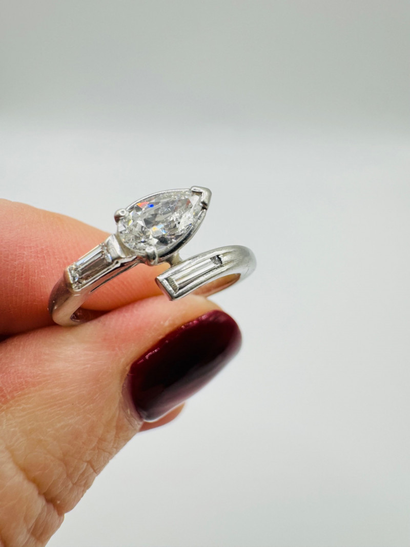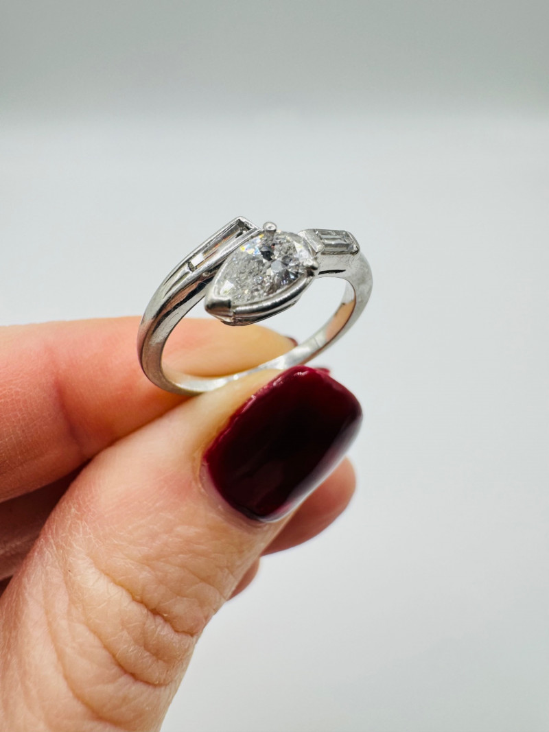 4.16g Platinum Ring w/ .4ct Pear Diamond & (2) .14ct Baguettes.