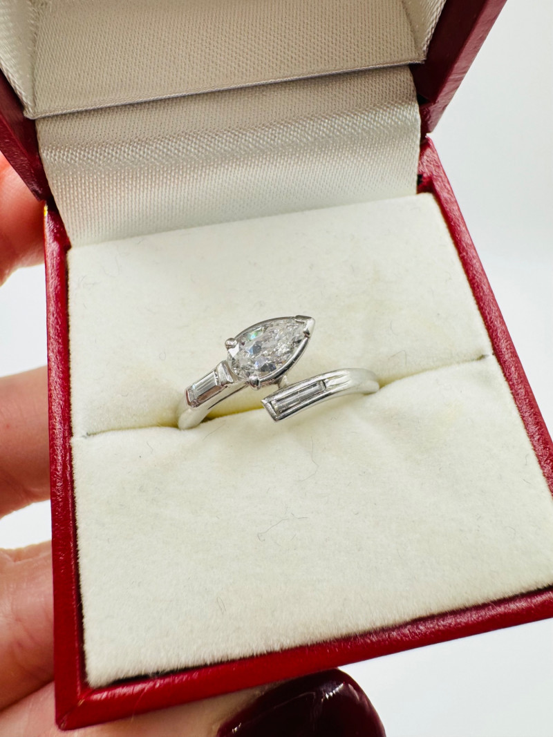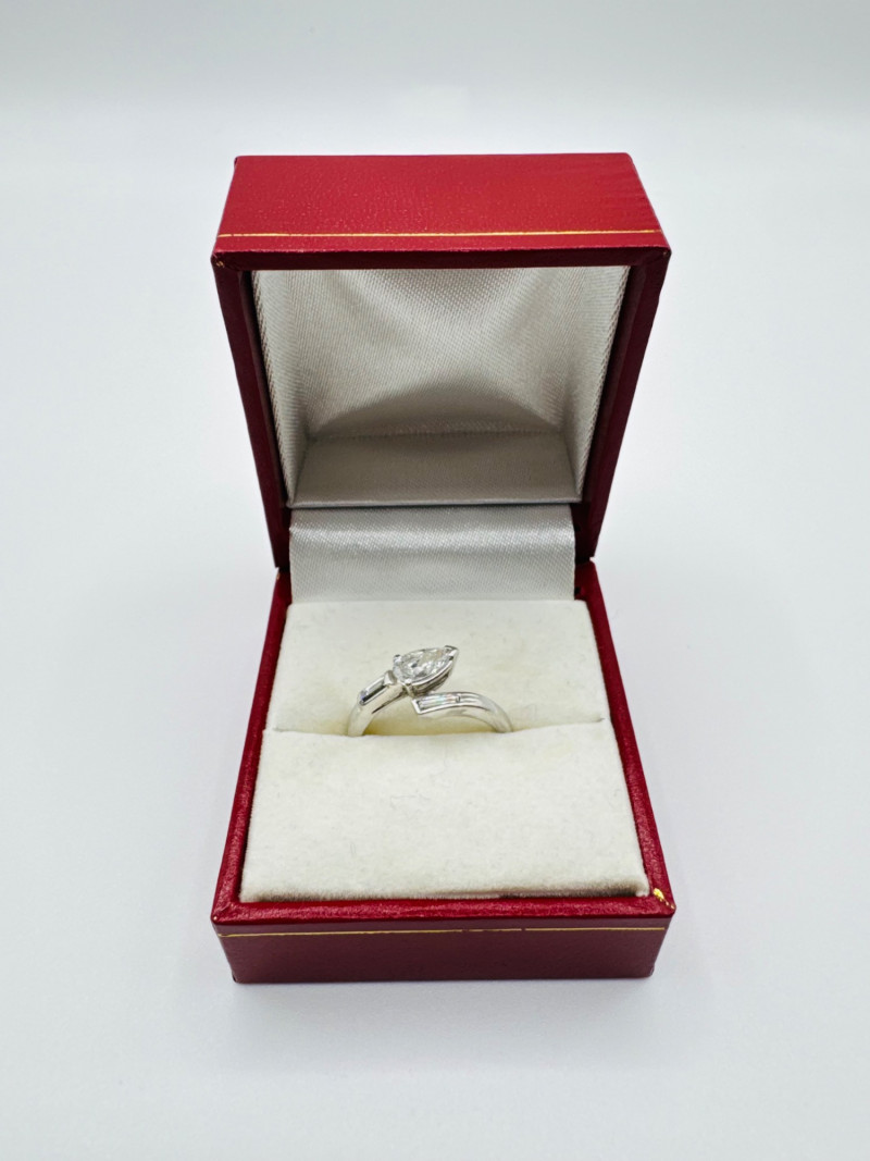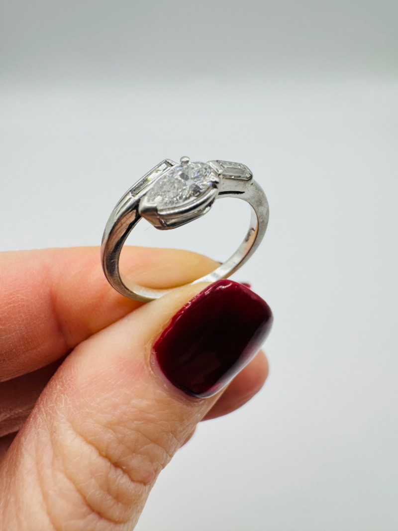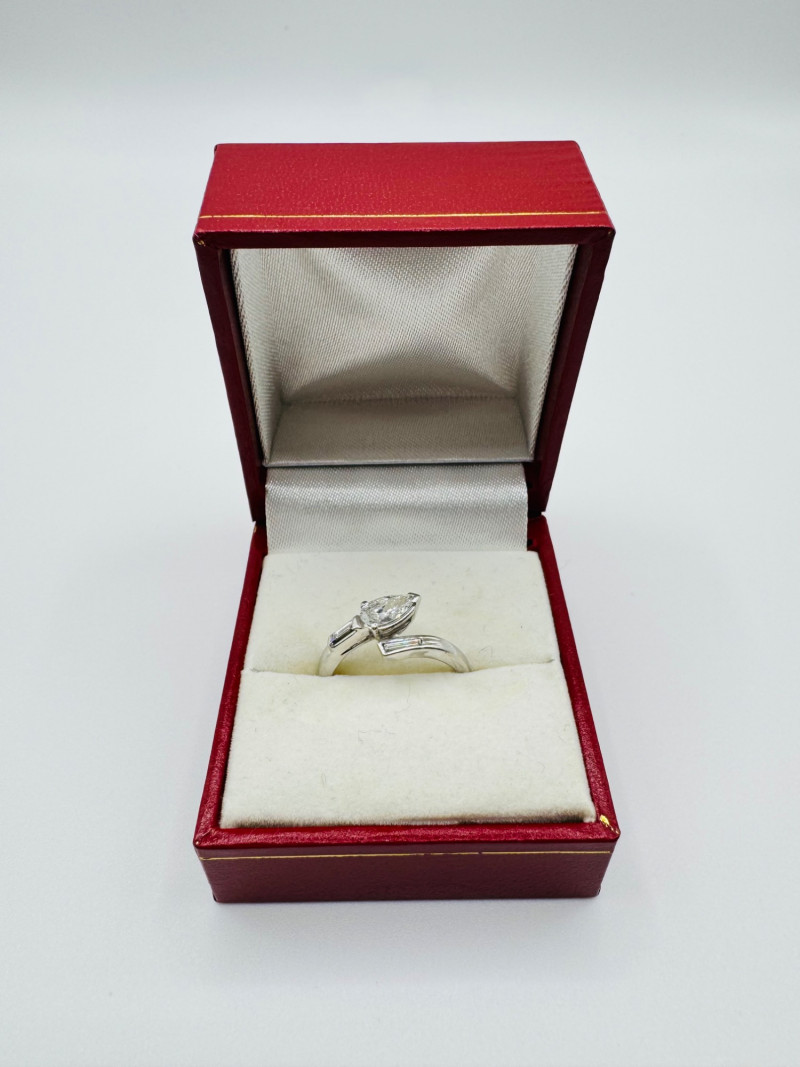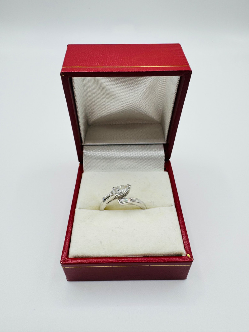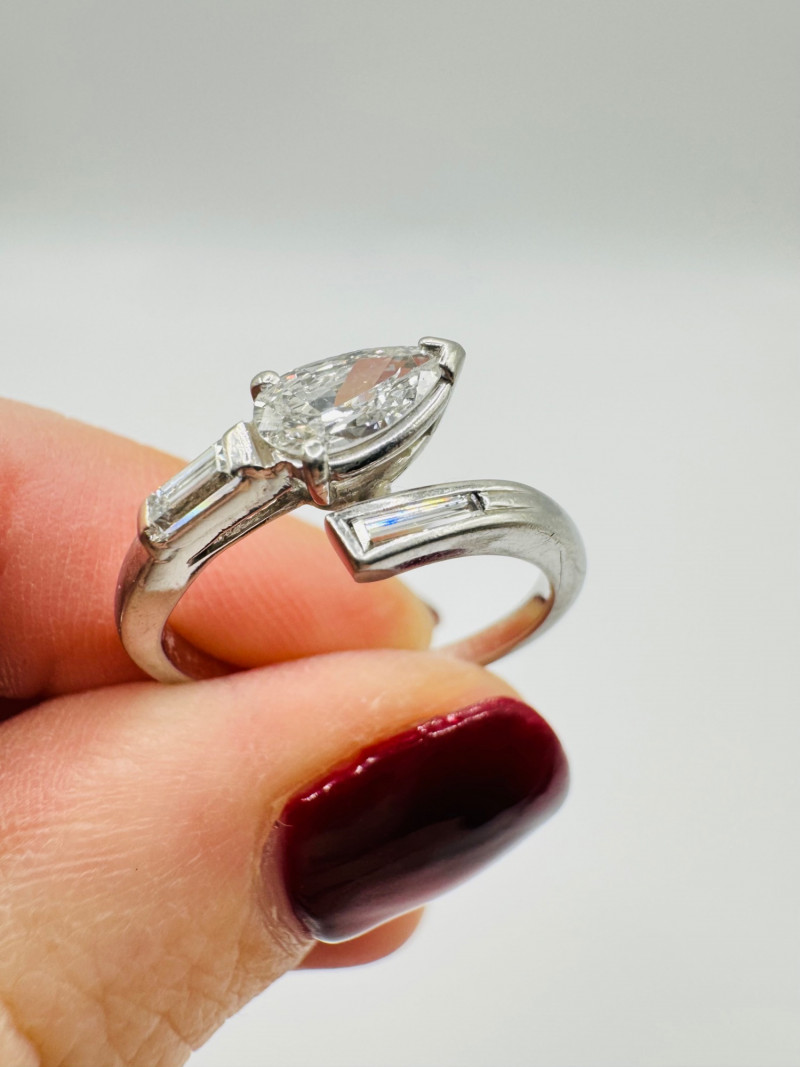4.16g Platinum Ring w/ .4ct Pear Diamond & (2) .14ct Baguettes.