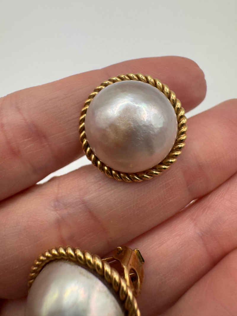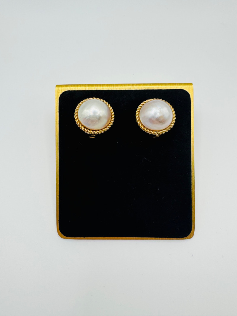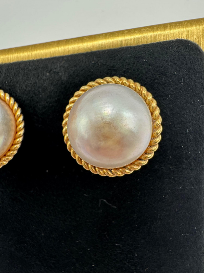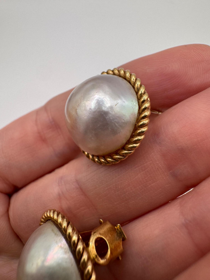 14K Gold Mabe-Like Pearl Earrings – Rope Edge Design, 13g.